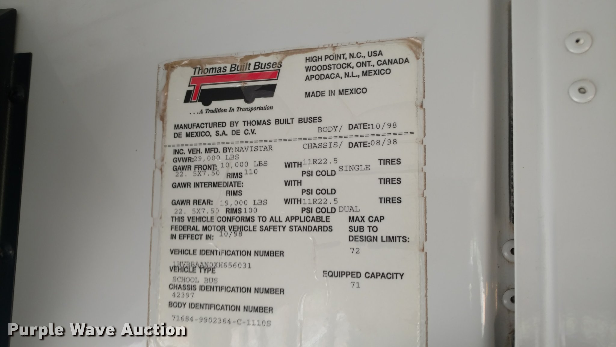 Purple Wave is selling a used Bus in Kansas. This item is a 1999 International 3800 school bus with the following: 126,924 miles on odometer, 6,862 hours on meter, International DT466E 7.6L L6 diesel engine, Allison automatic transmission, Heat, AM/FM, 48 passenger capacity, Air brakes, 11R22.5 tires