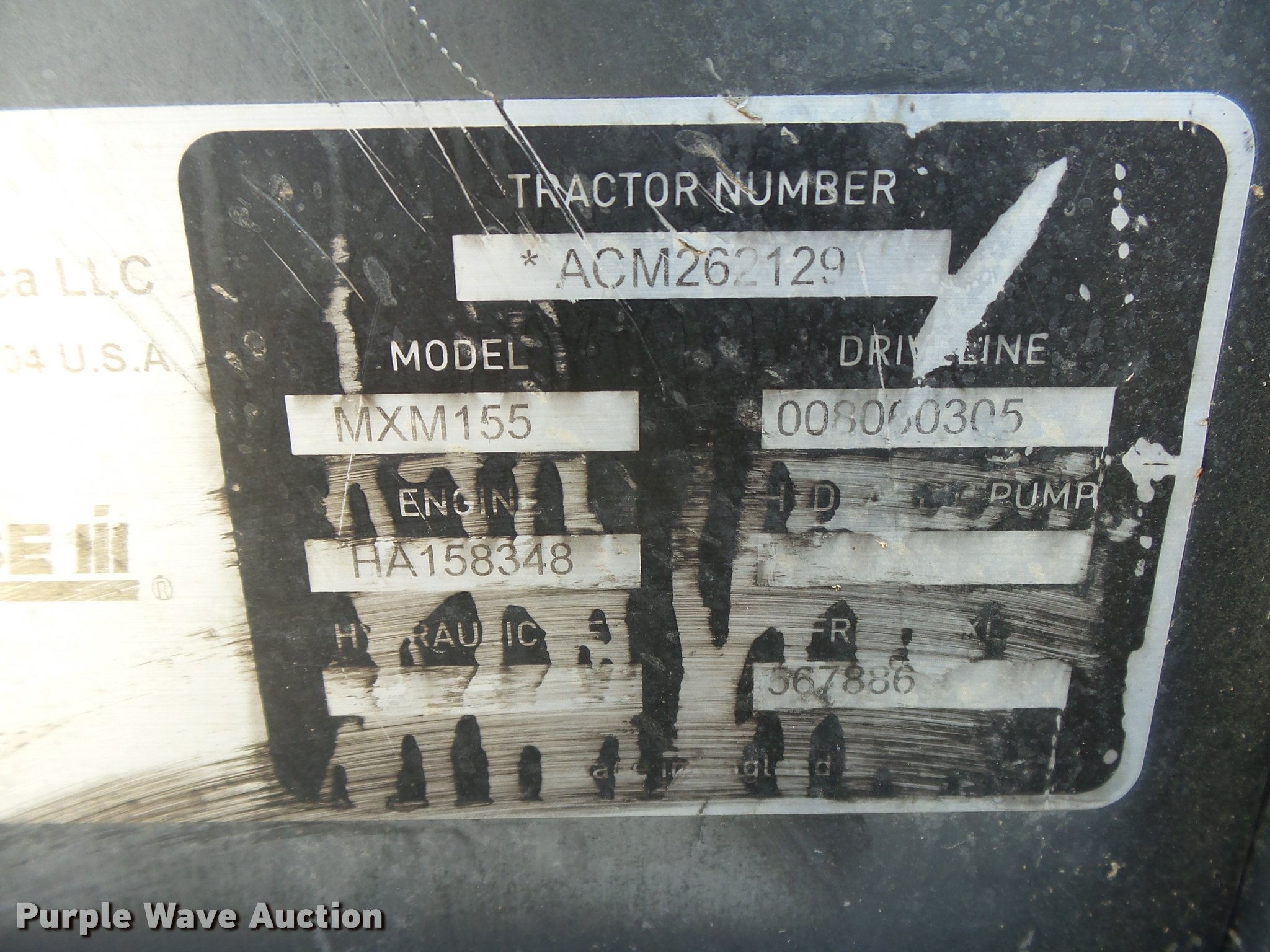Purple Wave is selling a used Tractor in Kansas. This item is a 2006 Case IH MXM155 MFWD tractor with the following: 4,916 hours on meter, Case 7.56 six cylinder turbo diesel engine, Serial AA958348, Powershift transmission, 18F-6R gears, Heat, AM/FM, Tilt steering wheel, Shades, Three point, Top link, 540/1000 PTO, (3) rear hydraulic remote sets, 14.9R30 front tires, 480/80R42 rear tires, Non-operational unit, No forward gears, Possible wiring harness issue, Batteries weak, Lower glass broken, PTO shaft missing, Serial ACM262129