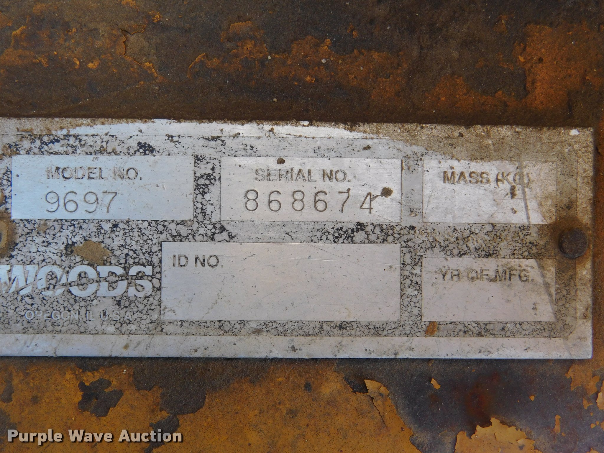 Purple Wave is selling a used Mower, Cutter, Shredder in Kansas. This item is a Woods 9697 rotary mower with the following: 60"W, Hydraulic lift, 540 PTO, Three point, Hard rubber gauge wheels, Serial 868674