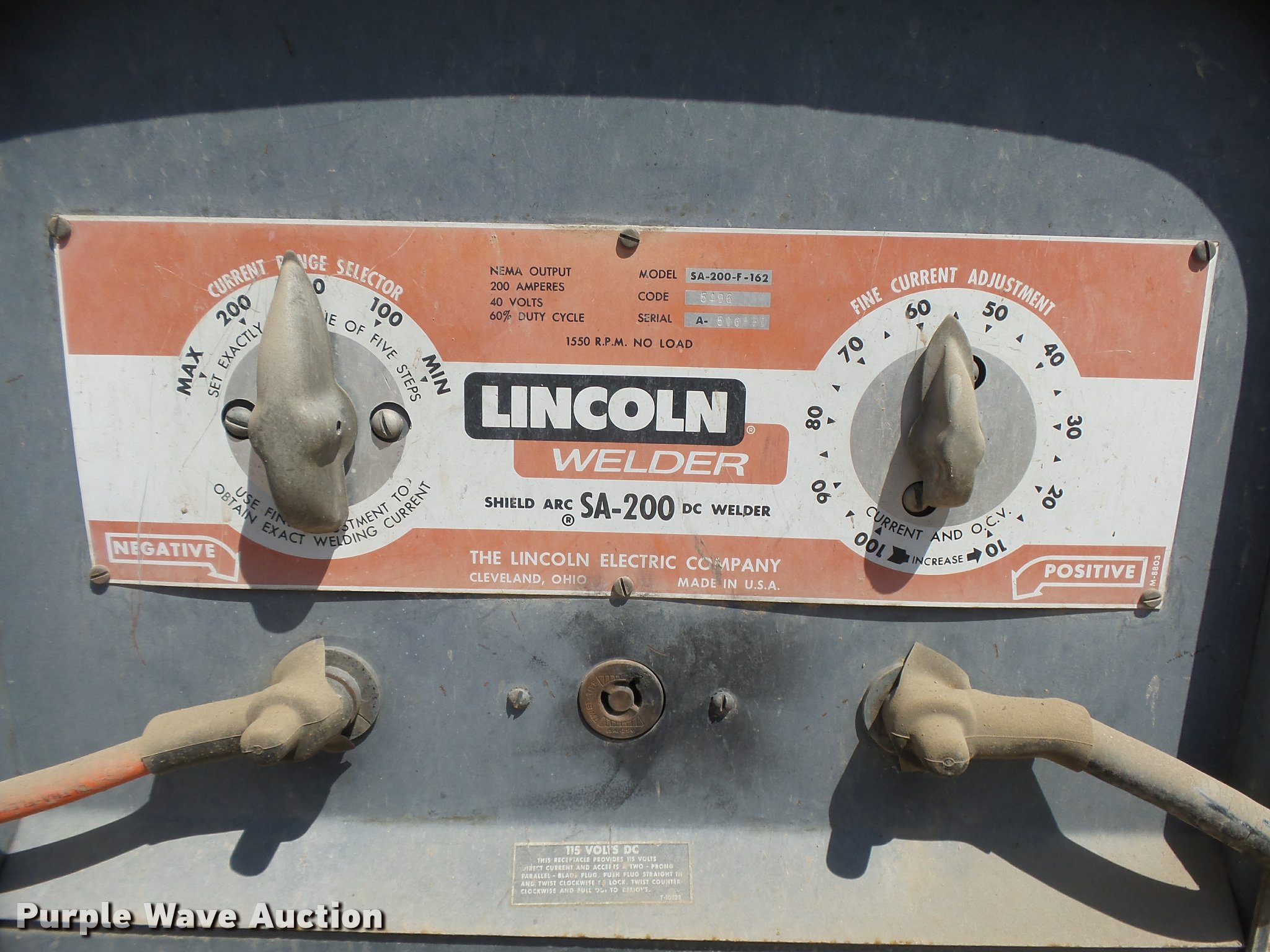 Purple Wave is selling a used Welder (Manual) in Kansas. This item is a Lincoln SA-200-F-162 welder with the following: Four cylinder gas engine, 200 amps, 40V, 60 percent duty cycle, Leads, Carburetor needs work, Serial A506890
