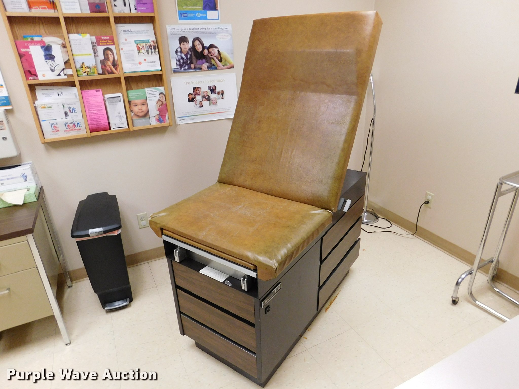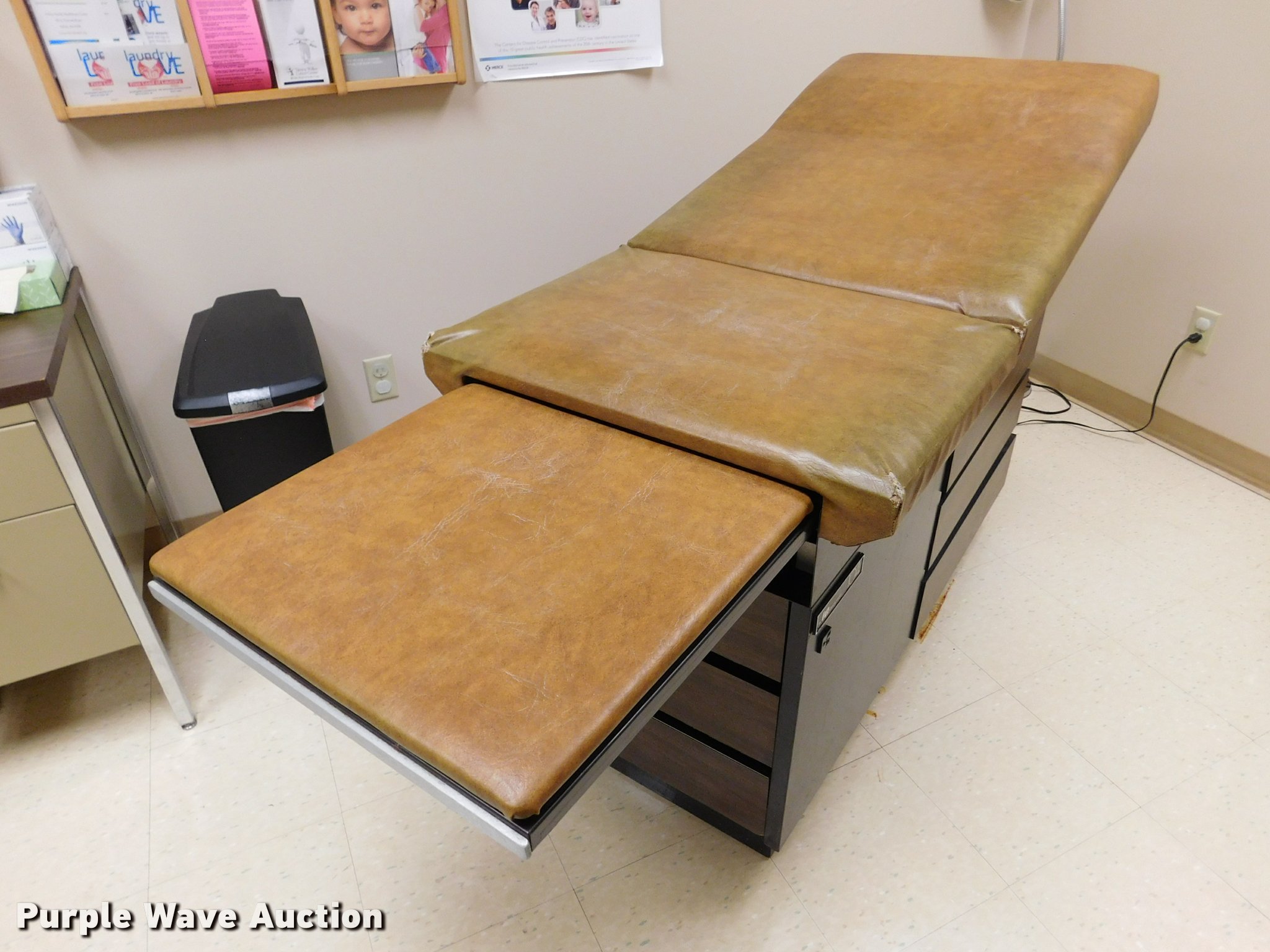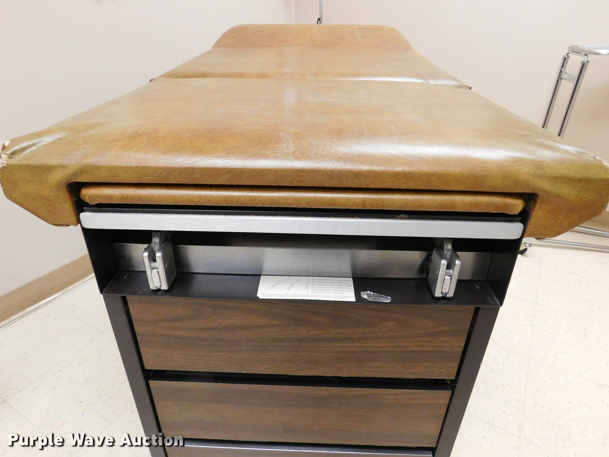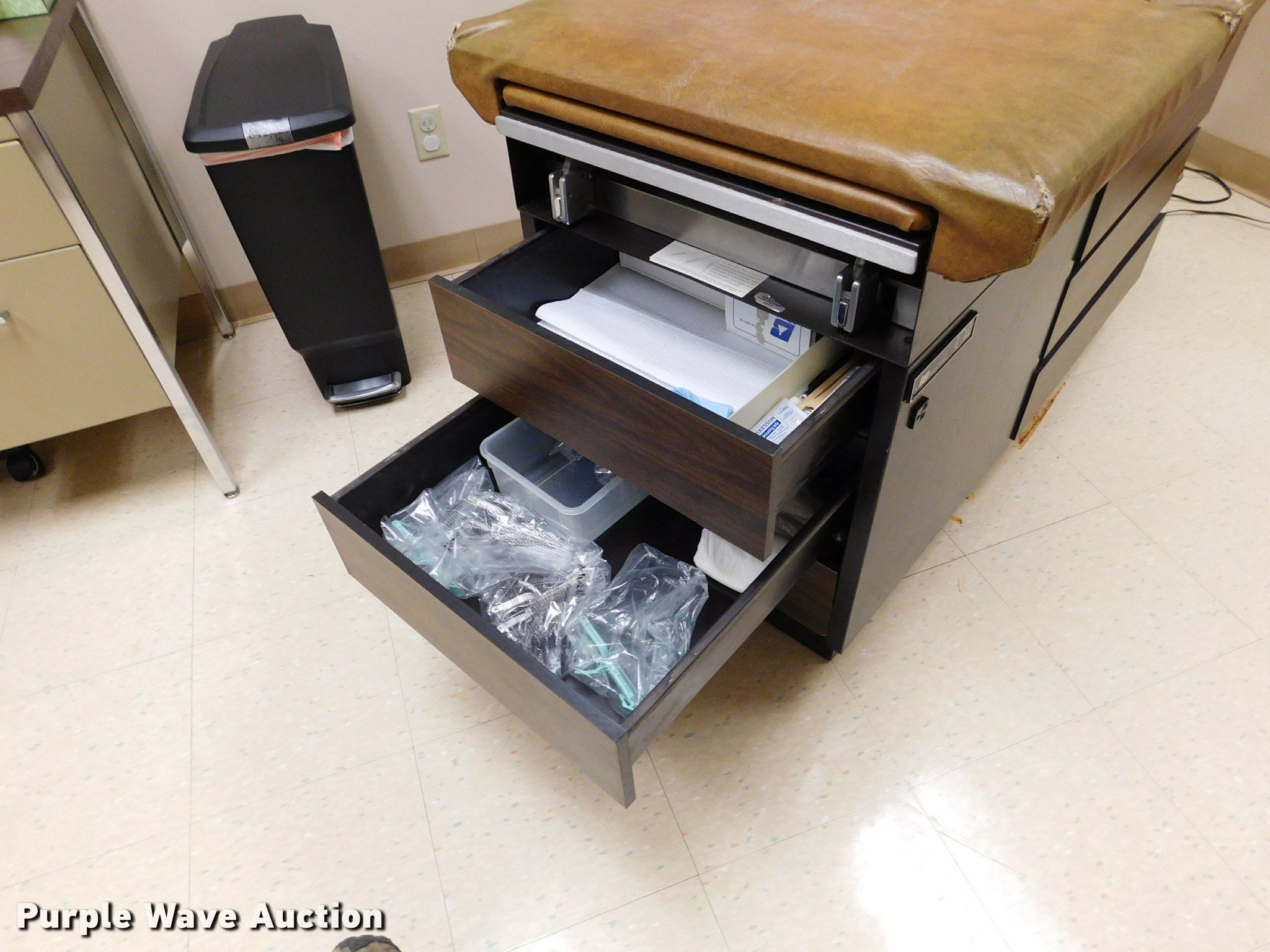 Purple Wave is selling a used Medical Equip. in Kansas. This item is a The IE Medical Group 104 vinyl exam table with the following: (2) front drawers, Foot rest, Leg extension, (3) side drawers, Adjustable head, Solid leg, (2) stirrups, Unknown operating condition
