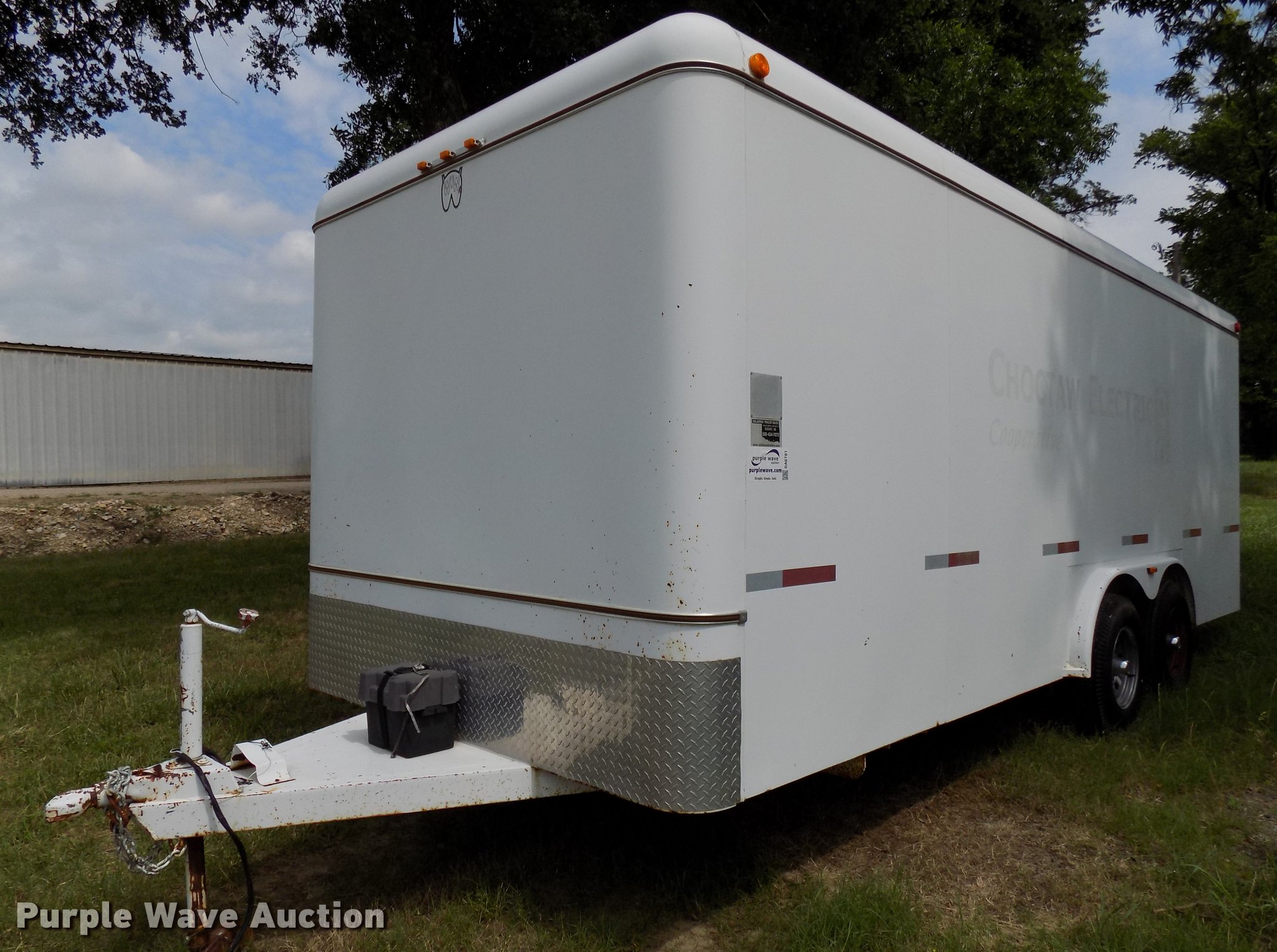 2005 W-W enclosed cargo trailer. 20'L, Wood deck, Right side door, Swinging rear doors, Shelving and hanging racks, 12V lighting, Battery on tongue, 2 5/16" ball hitch, Single leg landing gear, Spring suspension, Electric brakes, Tandem axle, Steel wheels, 7.00-15 tires, GVWR 5,200 lbs, GAWR 2,600 lbs. Oklahoma title. 11WHC20245W287601. Choctaw Electric Co-Op. 1033 N 4250 Rd. Hugo, OK 74743