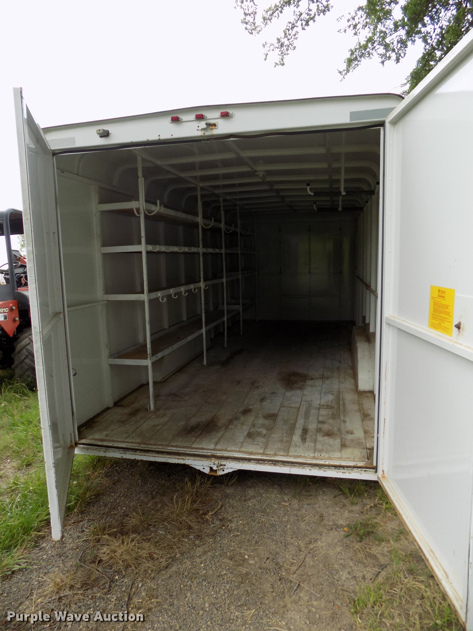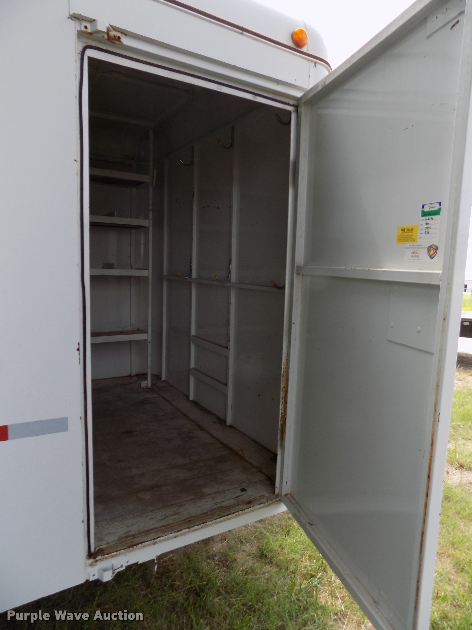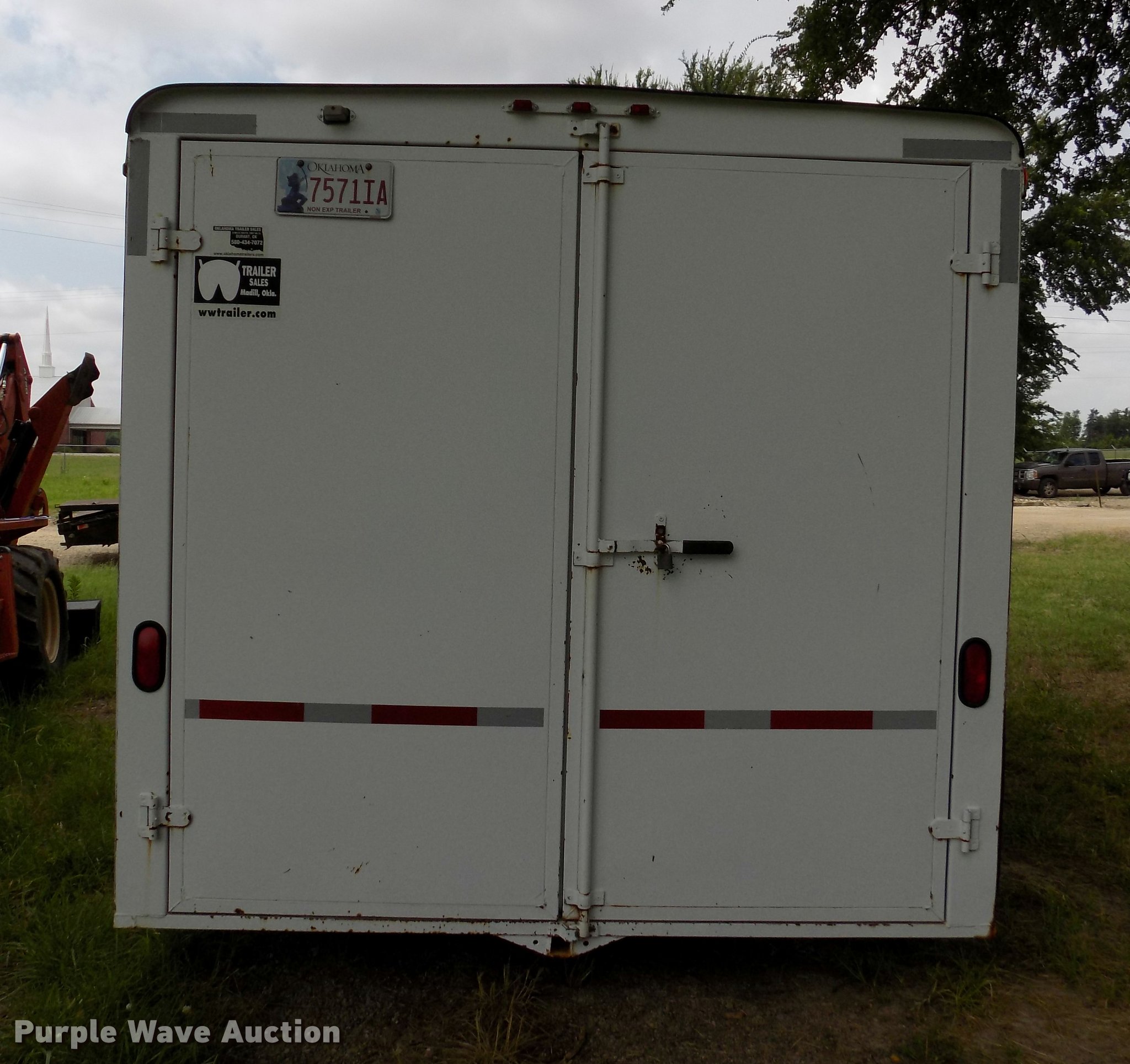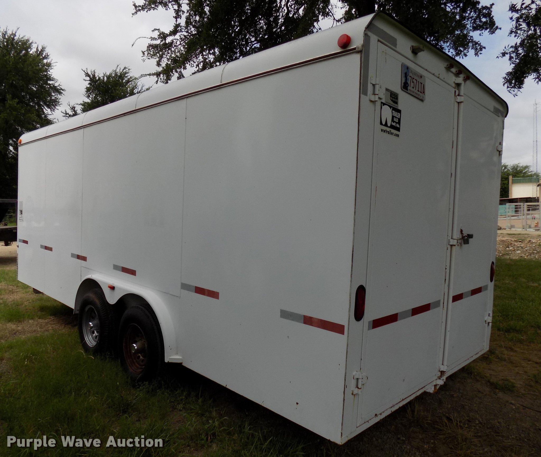 Purple Wave is selling a used Enclosed Cargo Trailer in Oklahoma. This item is a 2005 W-W enclosed cargo trailer with the following: 20'L, Wood deck, Right side door, Swinging rear doors, Shelving and hanging racks, 12V lighting, Battery on tongue, 2 5/16" ball hitch, Single leg landing gear, Spring suspension, Electric brakes, Tandem axle, Steel wheels, 7.00-15 tires, GVWR 5,200 lbs, GAWR 2,600 lbs