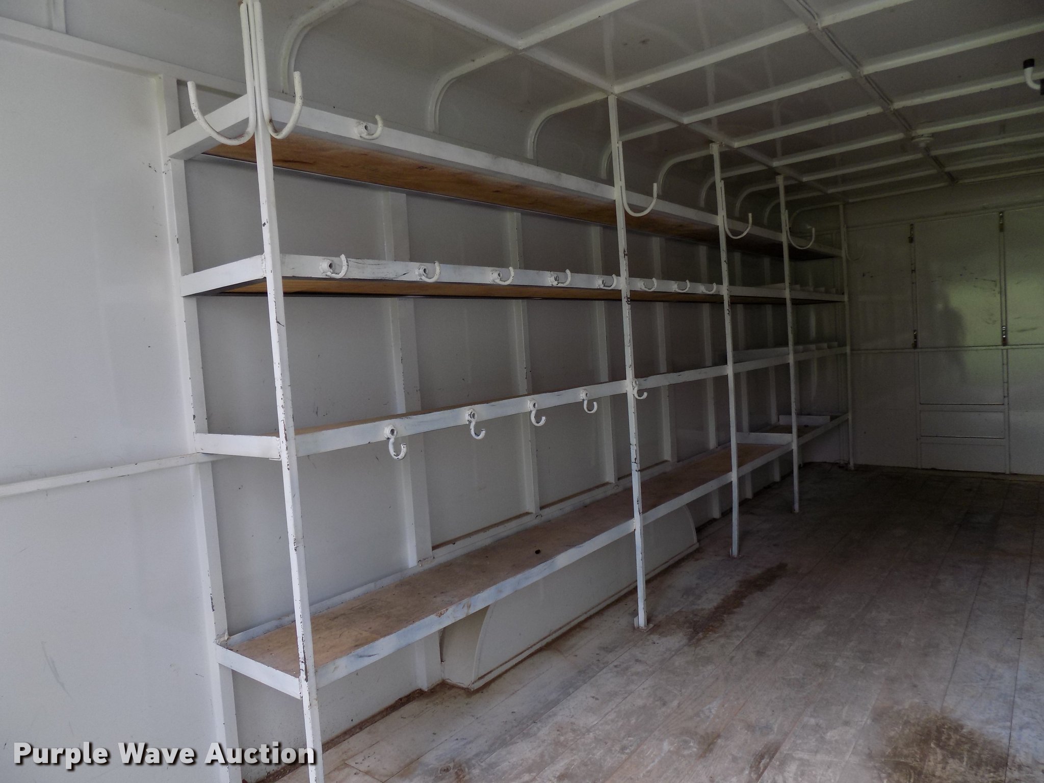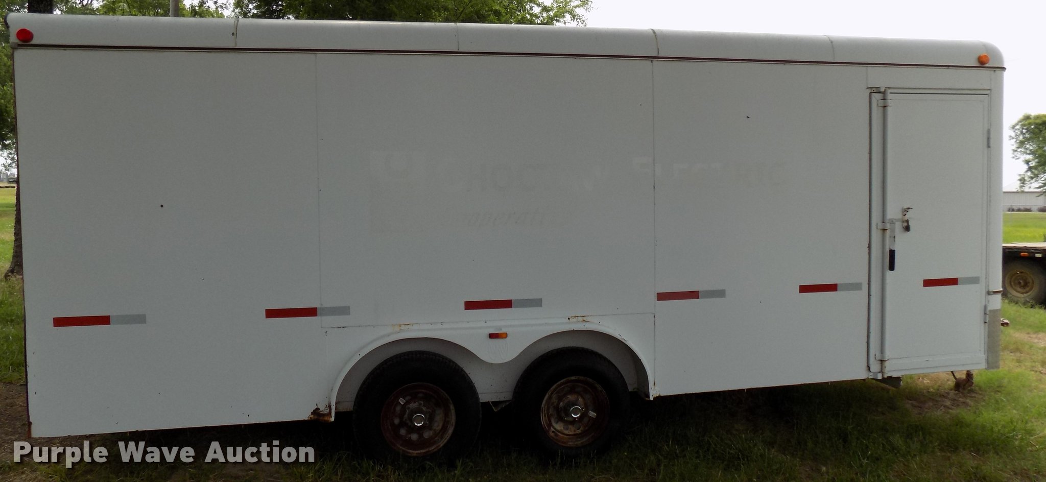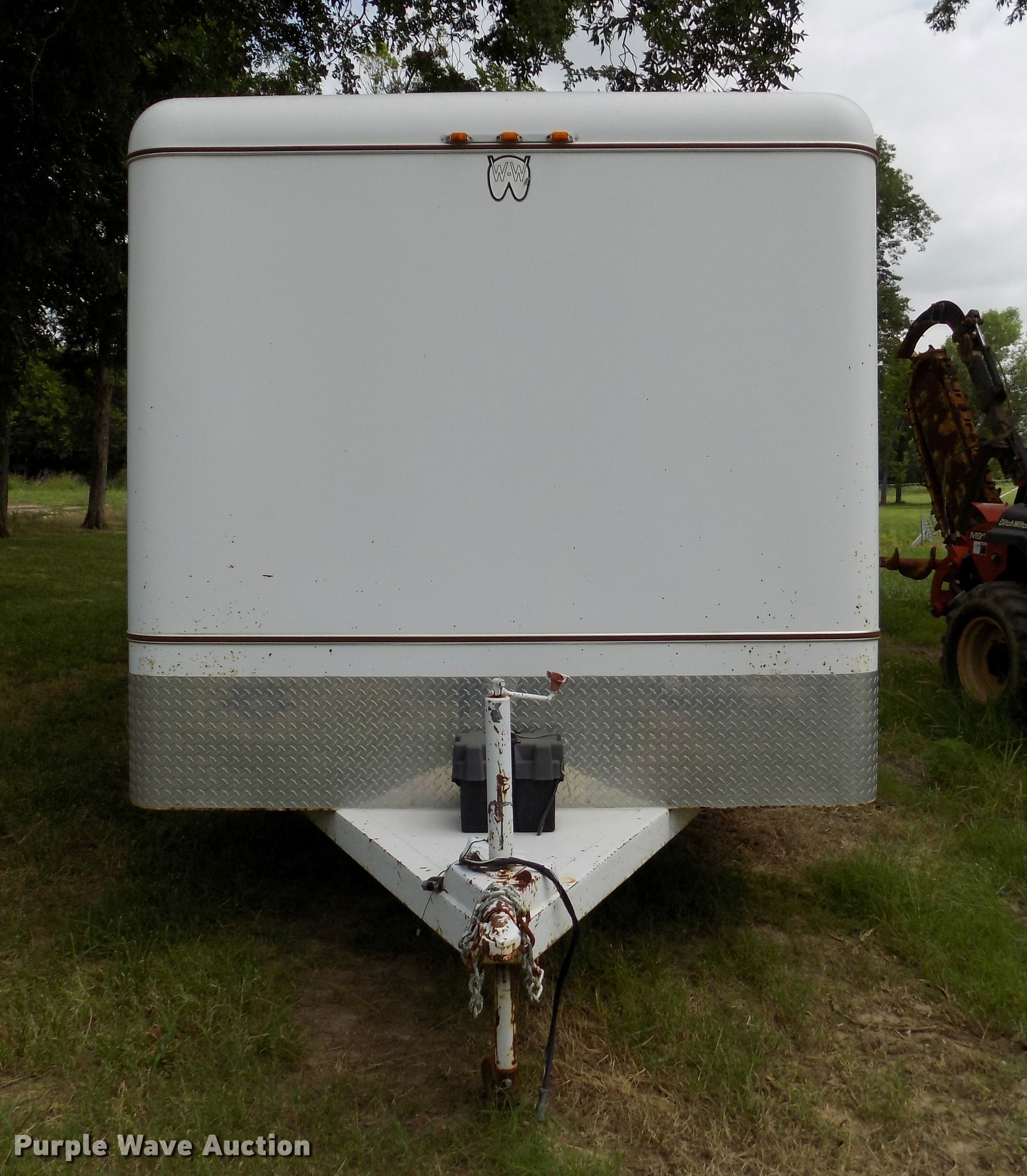 Purple Wave is selling a used Enclosed Cargo Trailer in Oklahoma. This item is a 2005 W-W enclosed cargo trailer with the following: 20'L, Wood deck, Right side door, Swinging rear doors, Shelving and hanging racks, 12V lighting, Battery on tongue, 2 5/16" ball hitch, Single leg landing gear, Spring suspension, Electric brakes, Tandem axle, Steel wheels, 7.00-15 tires, GVWR 5,200 lbs, GAWR 2,600 lbs