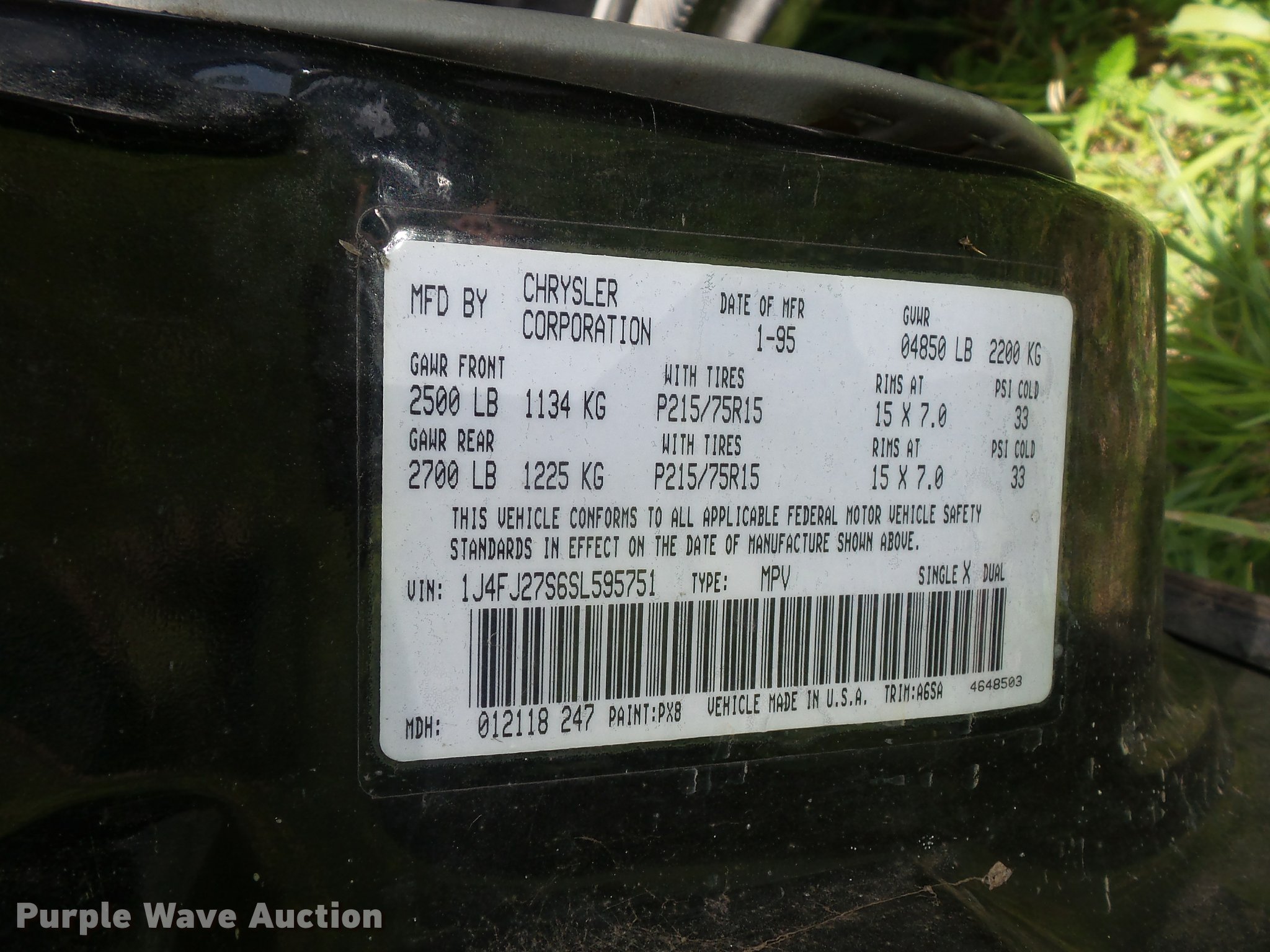 1995 Jeep Cherokee SUV. 90,880 miles on odometer, 4.0L L6 OHV 12V gas engine, Automatic transmission, Four wheel drive, AC and heat, AM/FM, Manual windows and locks, Cloth interior, Receiver hitch, 215/75R16 tires, Non-operational AC. Missouri title. 1J4FJ27S6SL595751. Jackson County. 22087 SW Woods Chapel Rd. Blue Springs, MO 64015