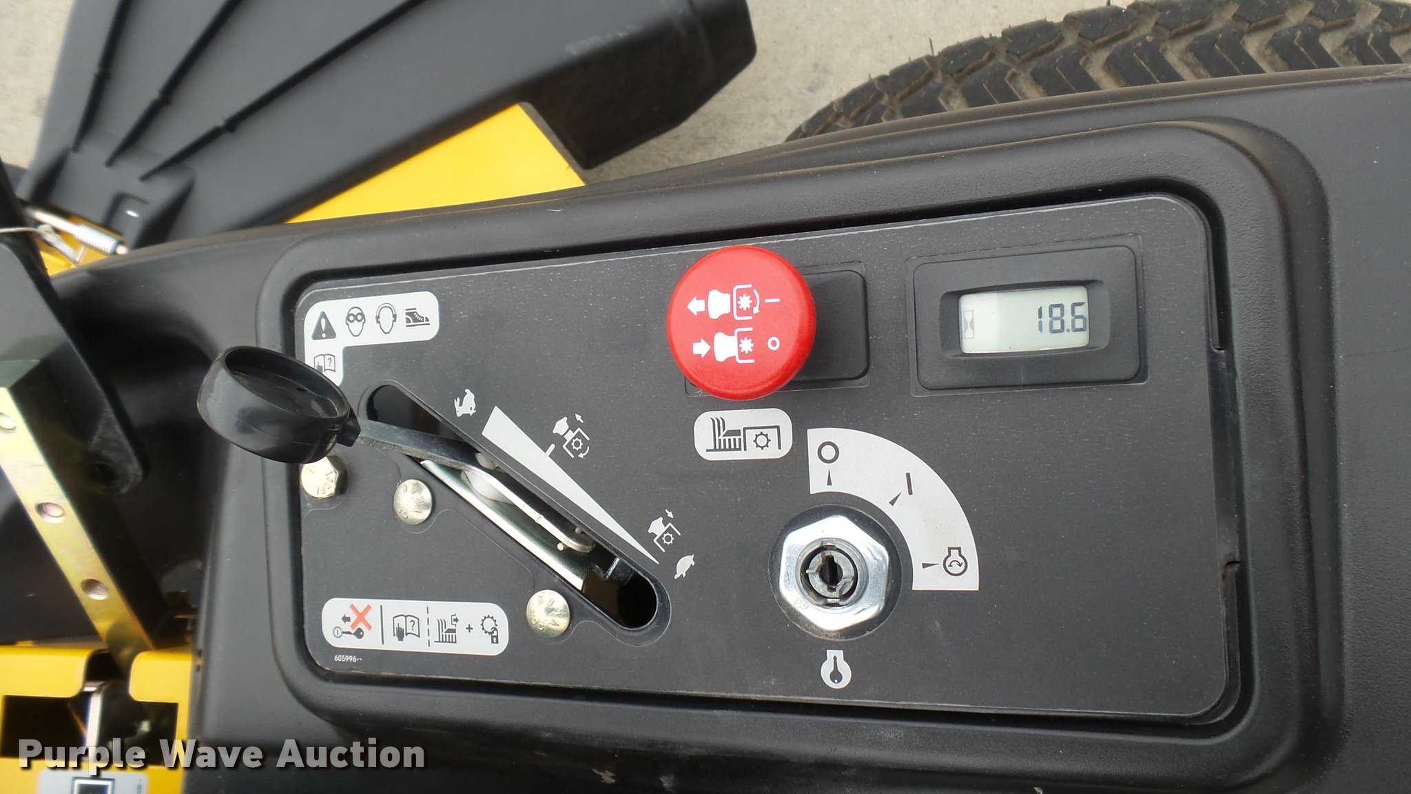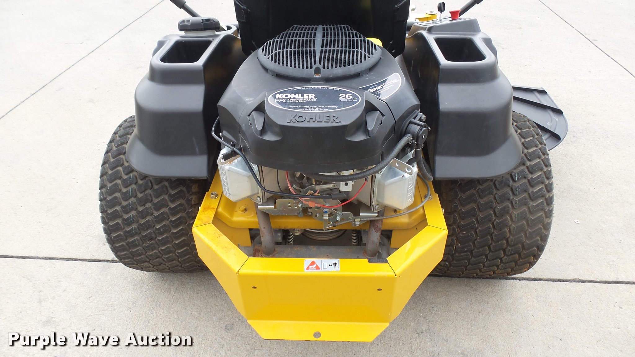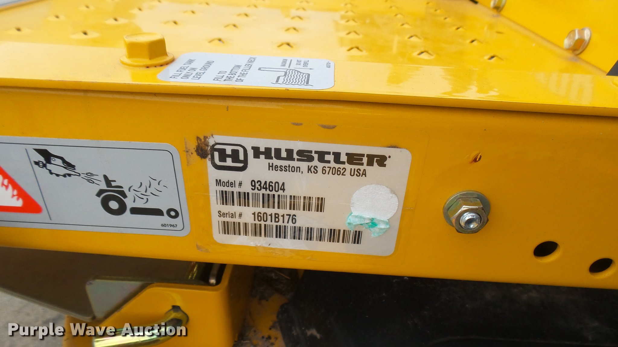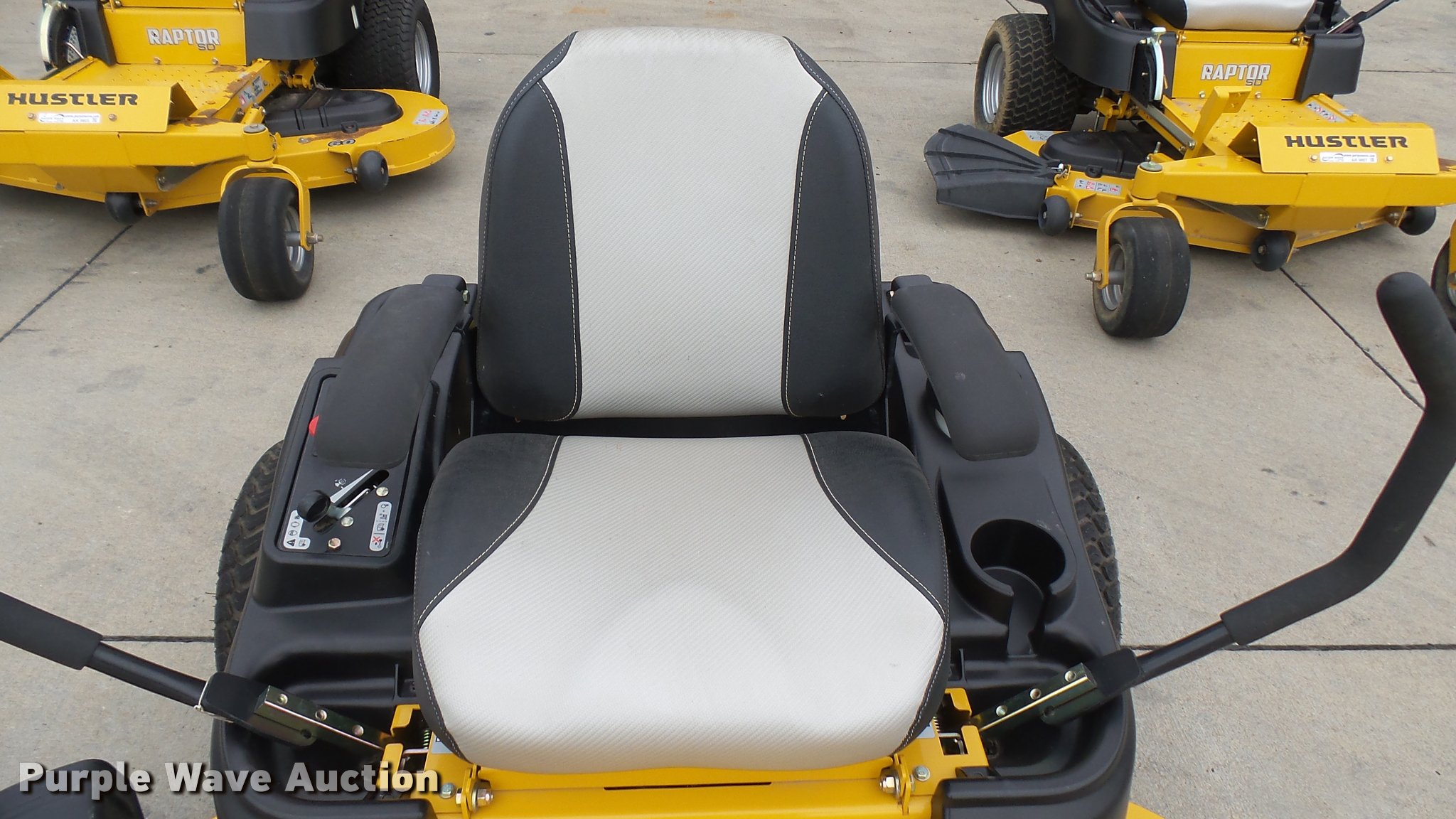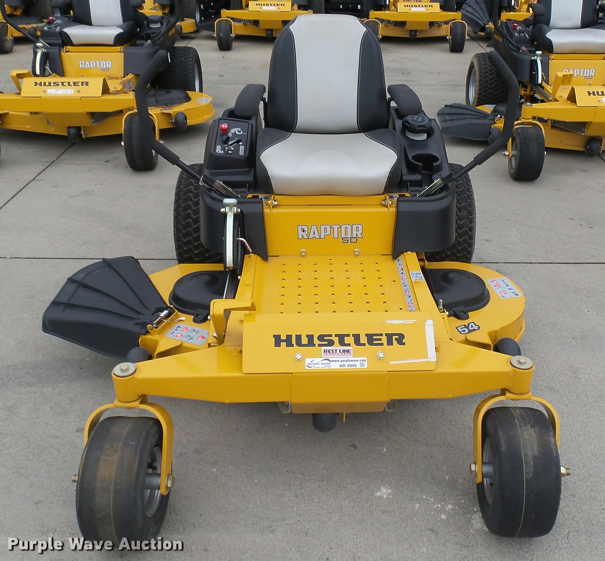 Purple Wave is selling a used Lawn Mower in Kansas. This item is a 2016 Hustler Raptor SD 934604 ZTR lawn mower with the following: 19 hours on meter, 54" cut, Kohler 25 HP gas engine, Hydro-Gear drive transmission, 13x6.5x6 front tires, 20x12x10 rear tires, Warranty return: paint issue, Serial 1601B176