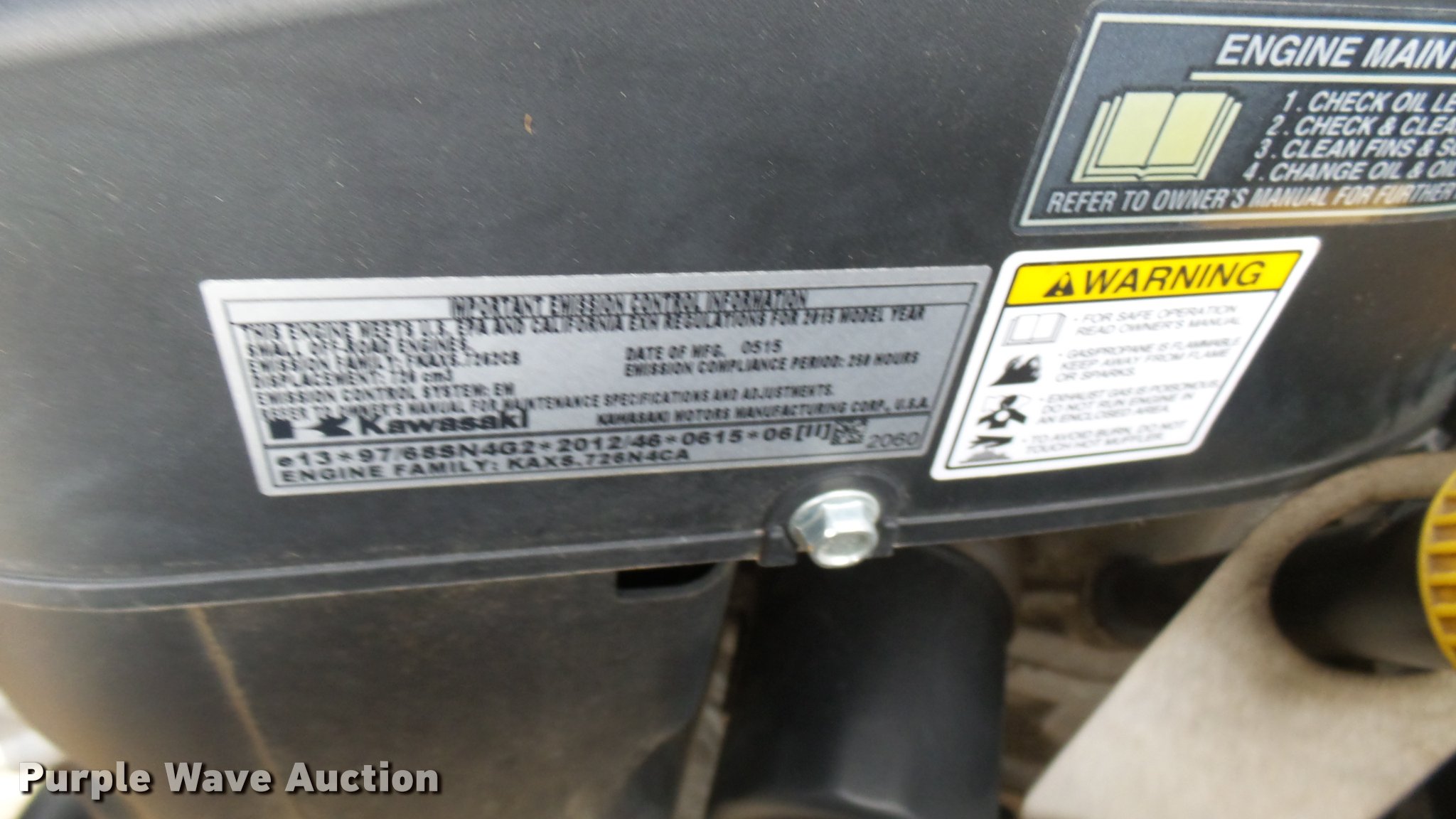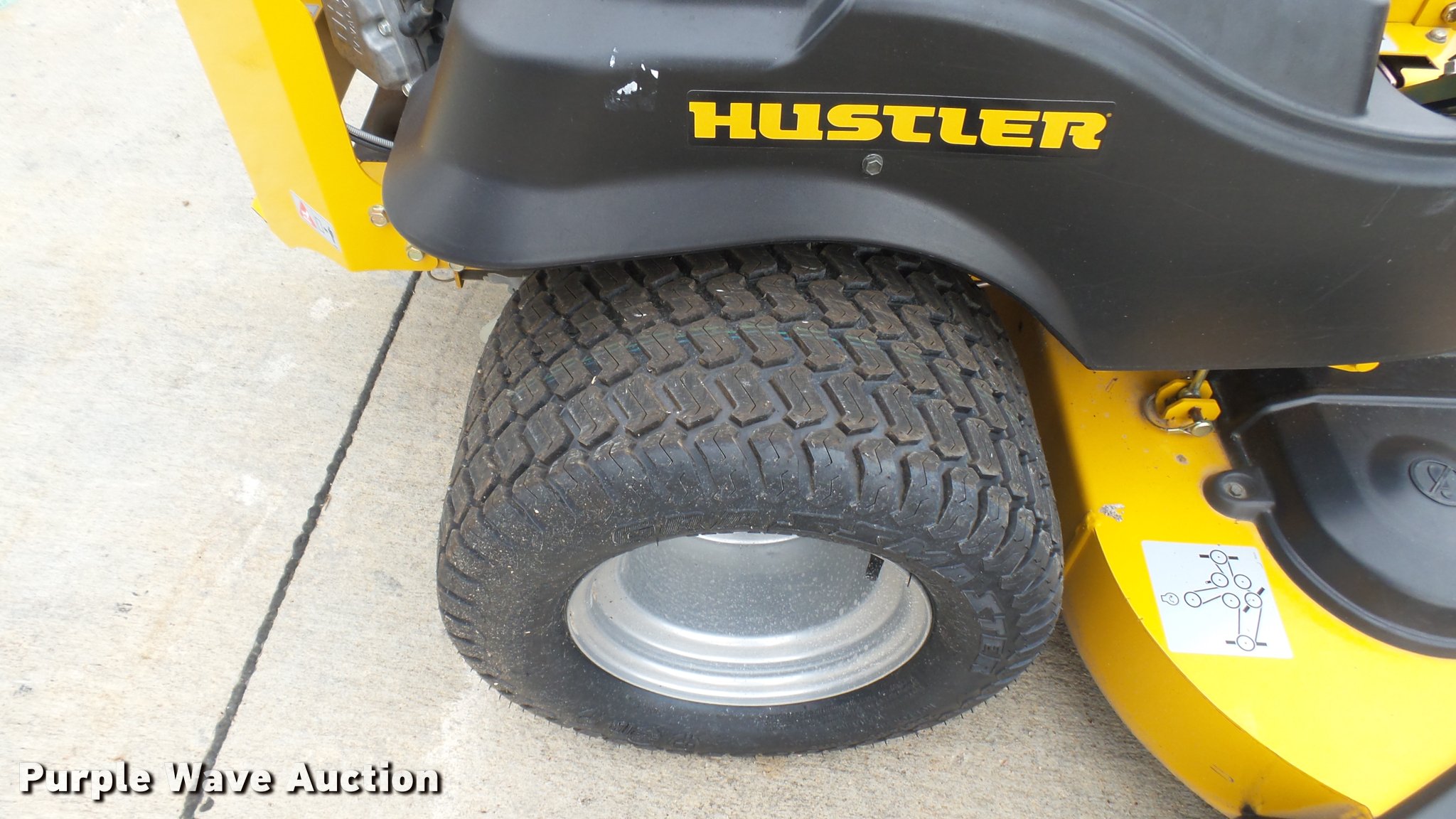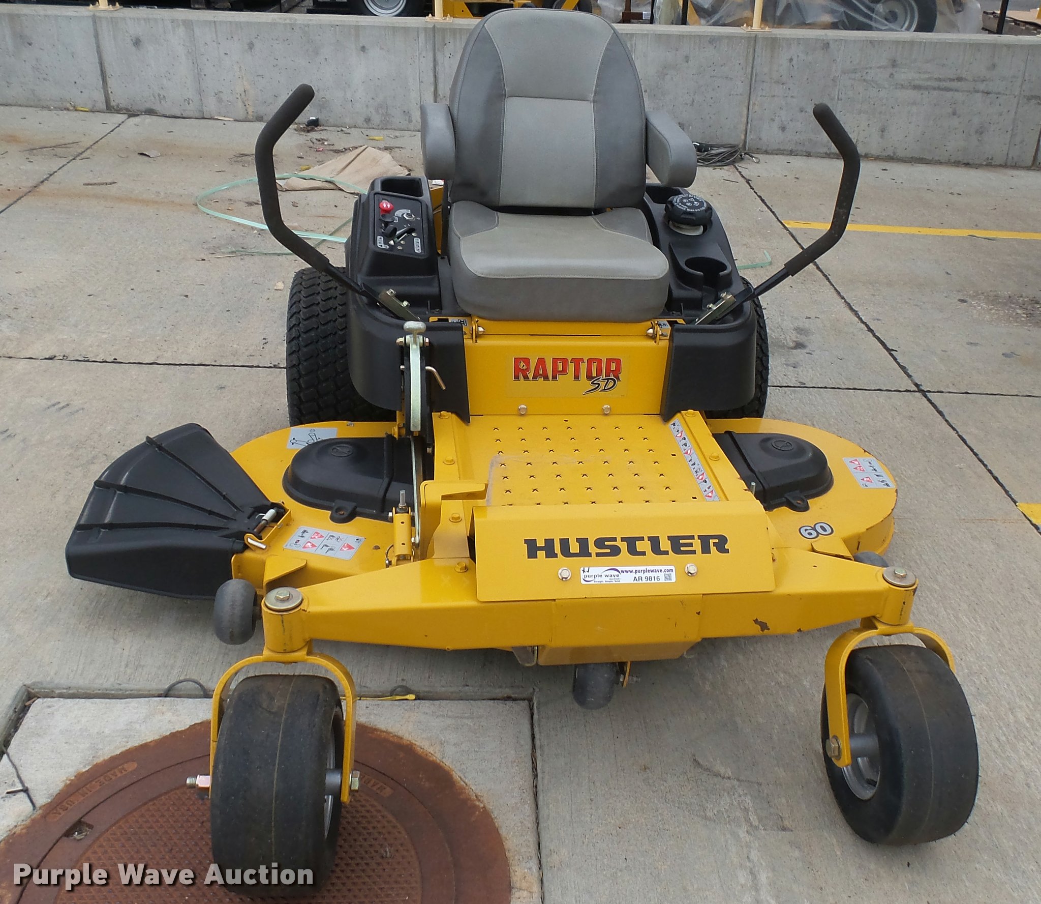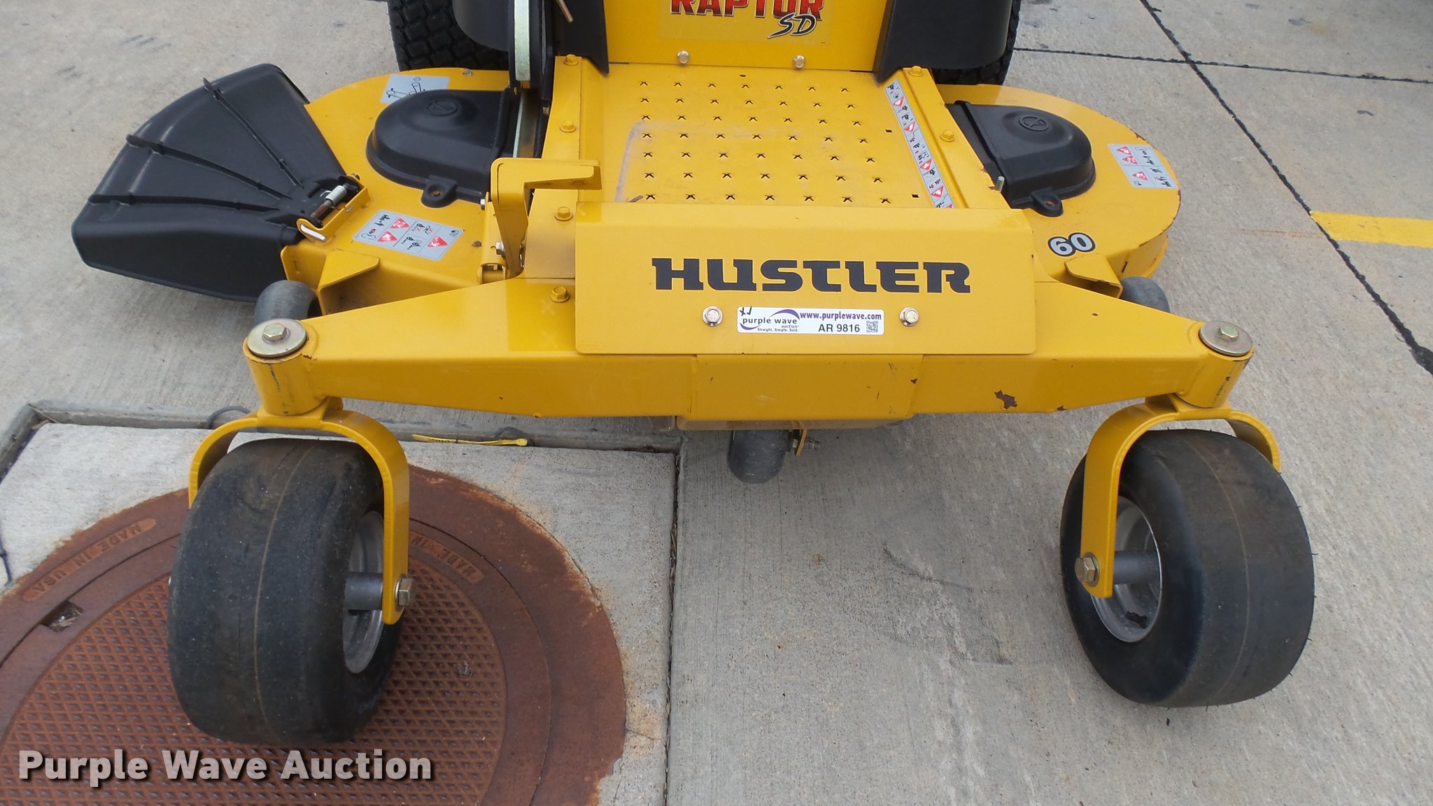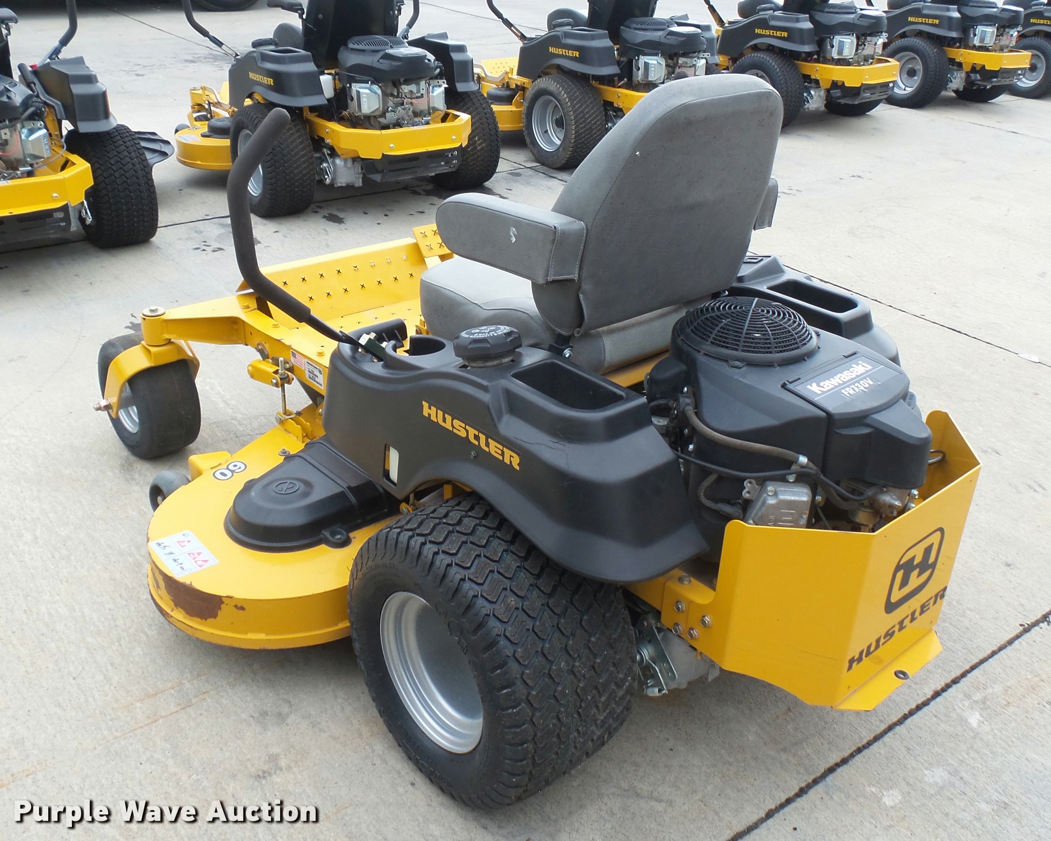 Purple Wave is selling a used Lawn Mower in Kansas. This item is a 2015 Hustler Raptor SD 932541 ZTR lawn mower with the following: 66 hours on meter, 60" cut, Kawasaki 24 HP gas engine, Hydro-Gear drive transmission, 13x6.5x6 front tires, 20x12x10 rear tires, Warranty return: paint issue, Serial 15057520