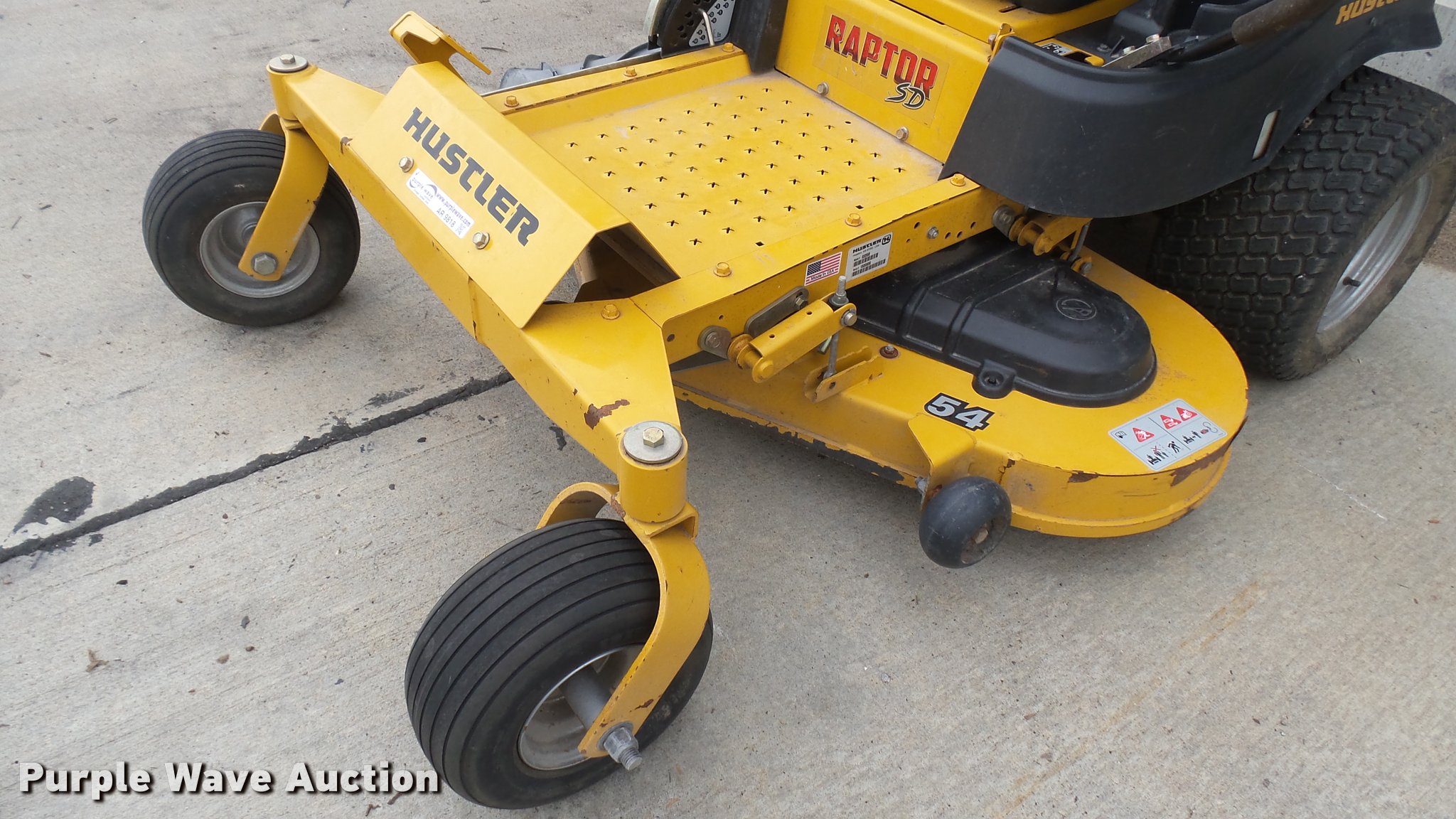Purple Wave is selling a used Lawn Mower in Kansas. This item is a 2015 Hustler Raptor SD 932558 ZTR lawn mower with the following: 68 hours on meter, 54" cut, Kawasaki 23 HP gas engine, Hydro-Gear drive transmission, 13x6.5x6 front tires, 20x12x10 rear tires, Warranty return: paint issue, Serial 15055656
