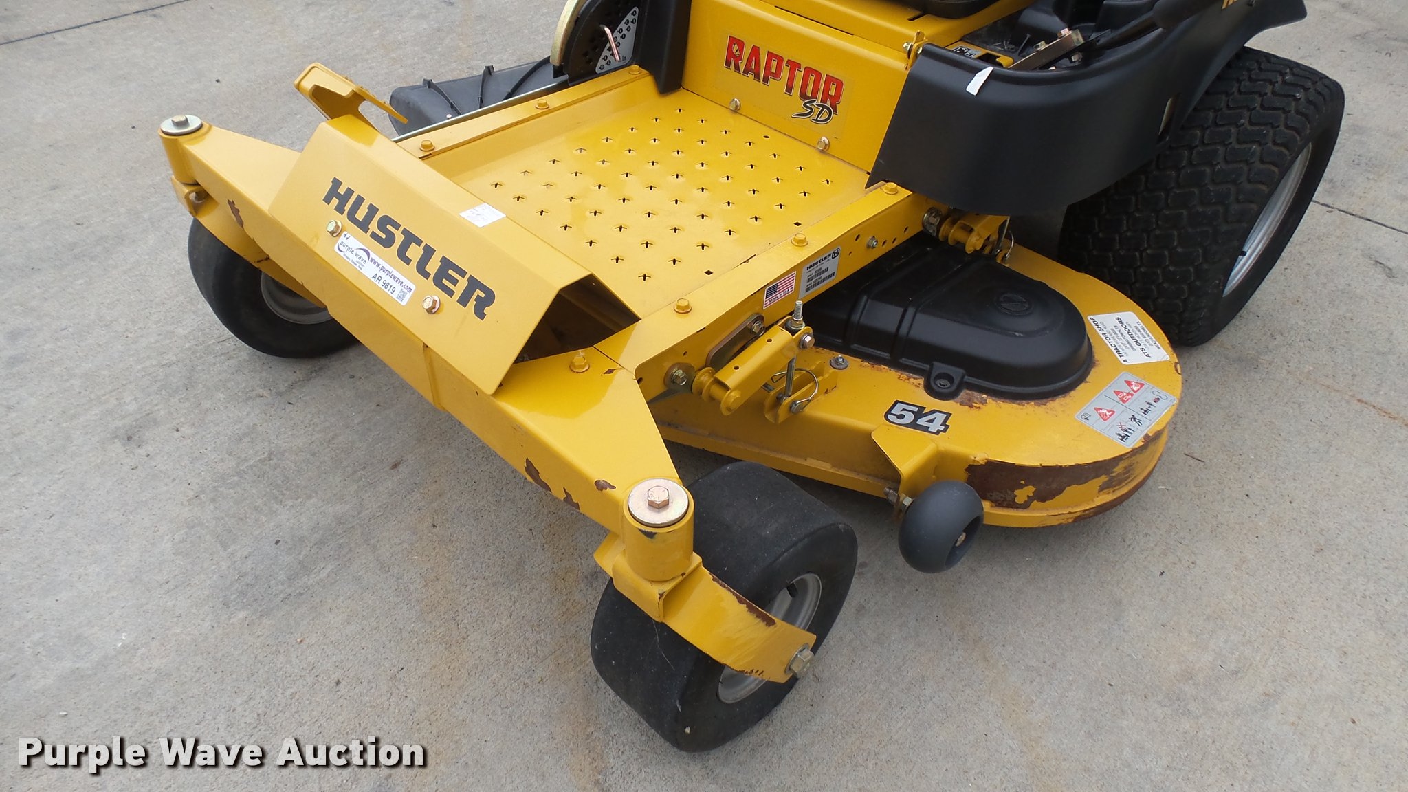 Purple Wave is selling a used Lawn Mower in Kansas. This item is a 2015 Hustler Raptor SD 932558 ZTR lawn mower with the following: 73 hours on meter, 54" cut, Kawasaki 23 HP gas engine, Hydro-Gear drive transmission, 13x6.5x6 front tires, 20x12x10 rear tires, Warranty return: paint issue, Serial 15057647