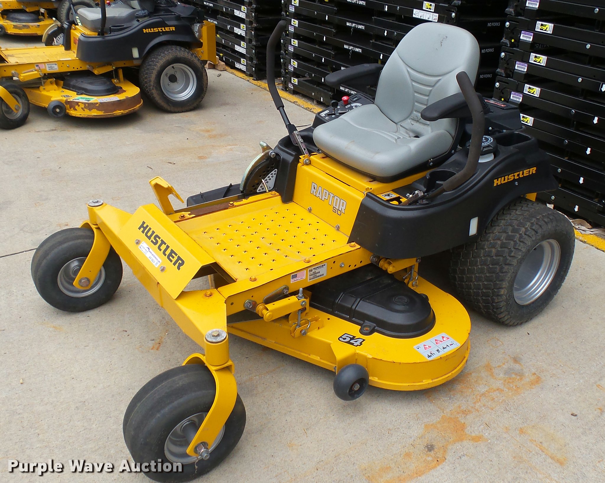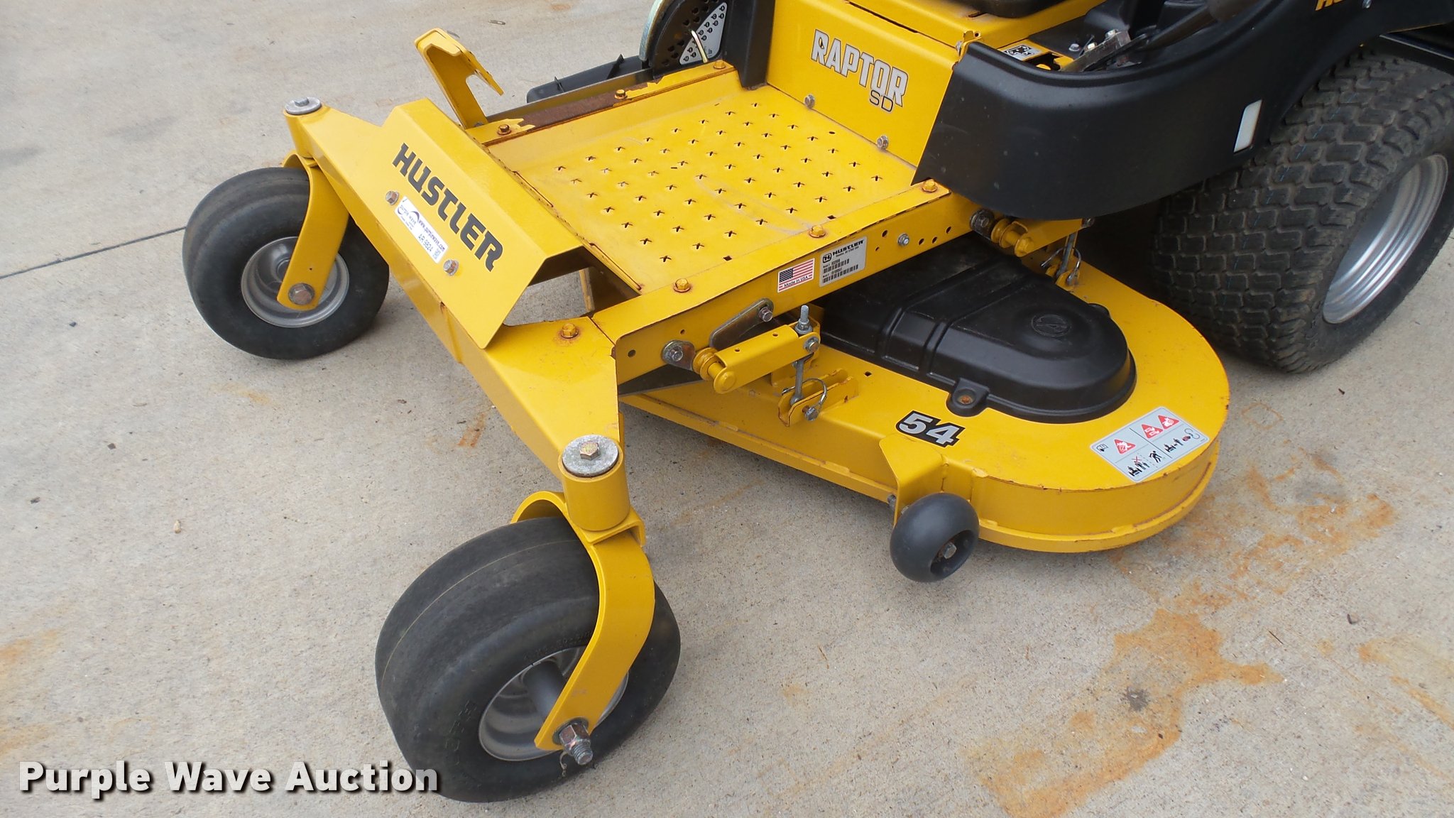 Purple Wave is selling a used Lawn Mower in Kansas. This item is a 2015 Hustler Raptor SD 932558 ZTR lawn mower with the following: 11 hours on meter, 54" cut, Kawasaki 23 HP gas engine, Hydro-Gear drive transmission, 13x6.5x6 front tires, 20x12x10 rear tires, Warranty return: paint issue, Serial 15100541