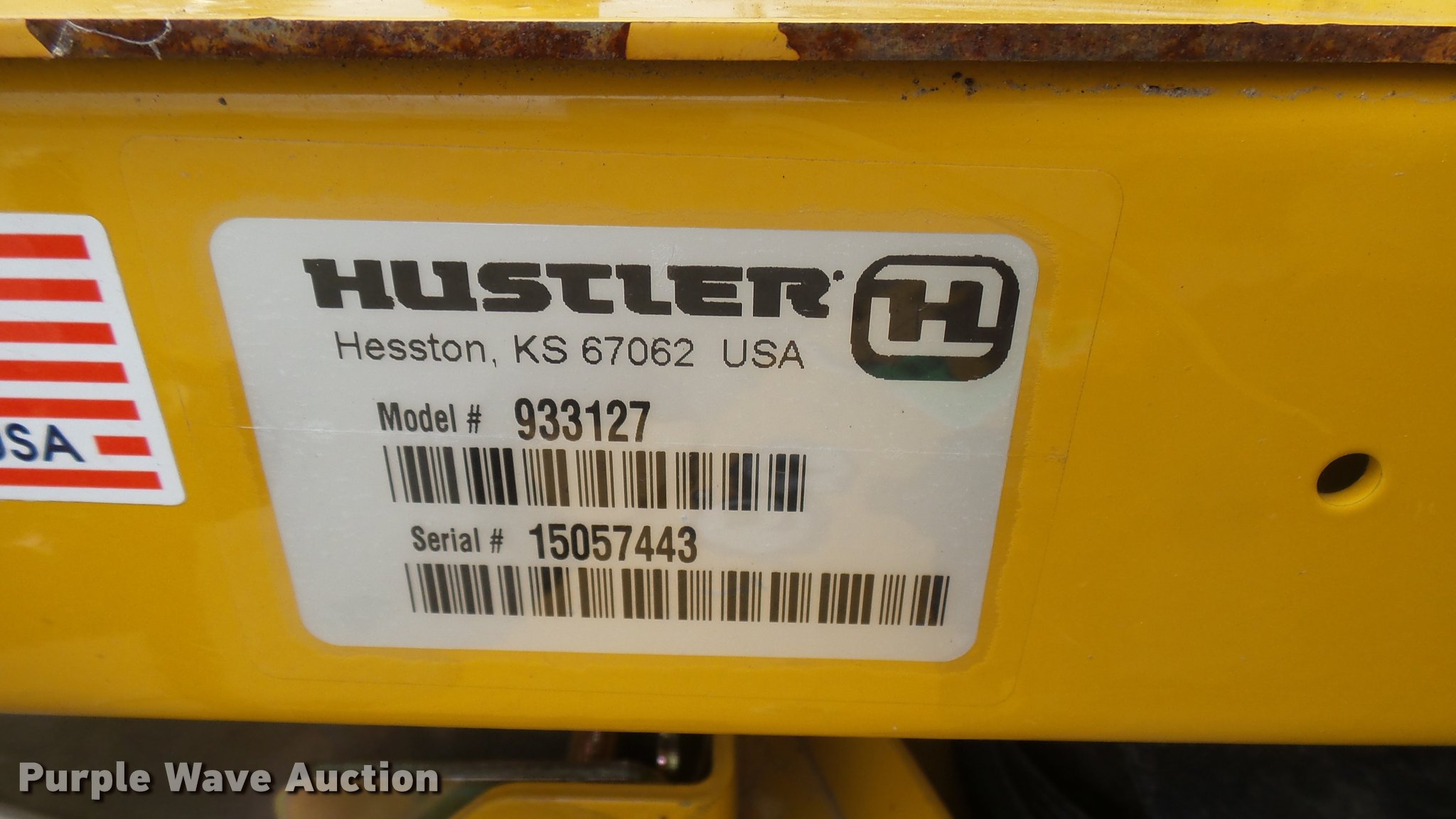 Purple Wave is selling a used Lawn Mower in Kansas. This item is a 2015 Hustler Raptor SD 933127 ZTR lawn mower with the following: 66 hours on meter, 60" cut, Kawasaki 24 HP gas engine, Hydro-Gear drive transmission, 13x6.5x6 front tires, 20x12x10 rear tires, Warranty return: paint issue, Serial 15057443