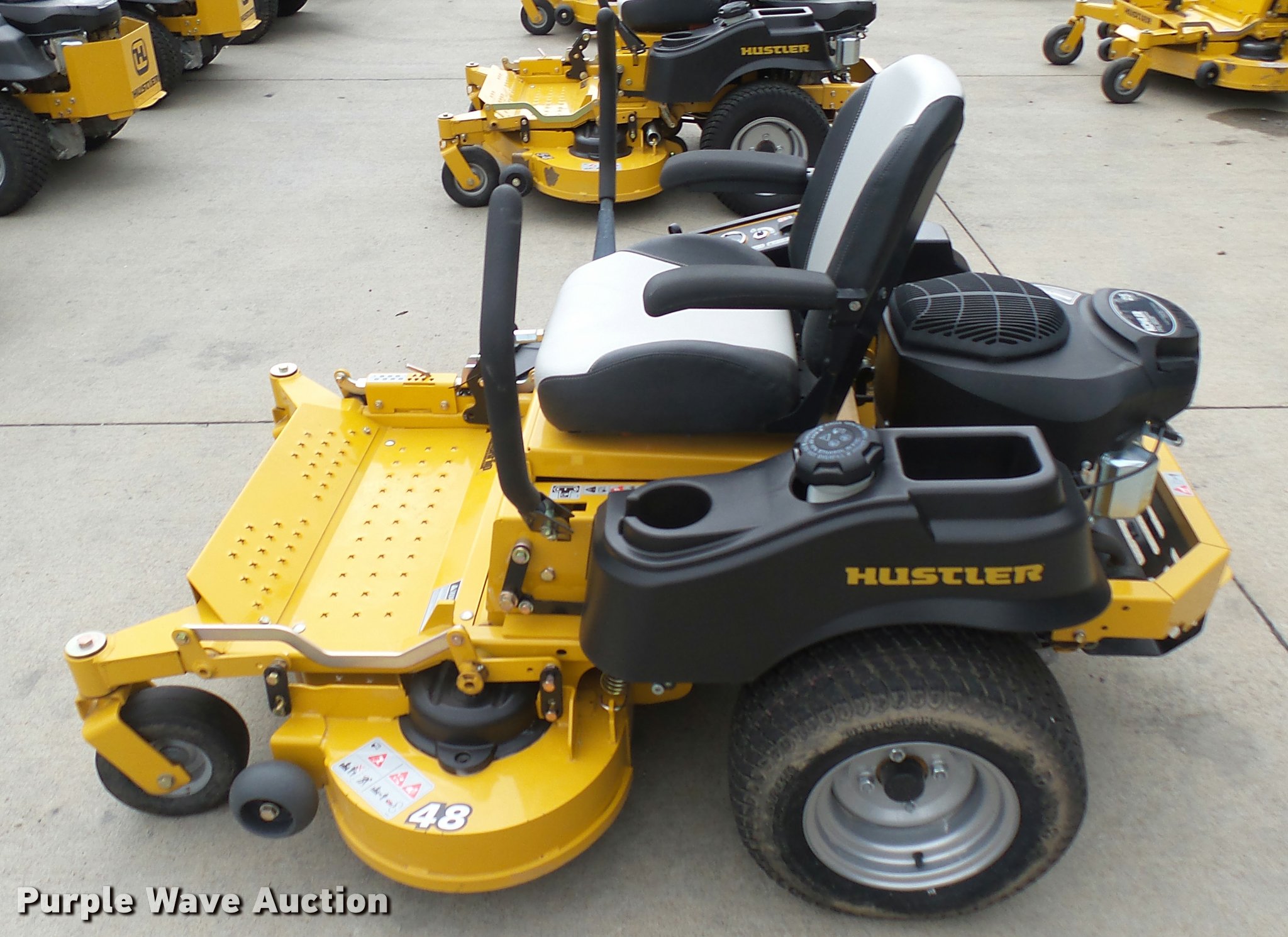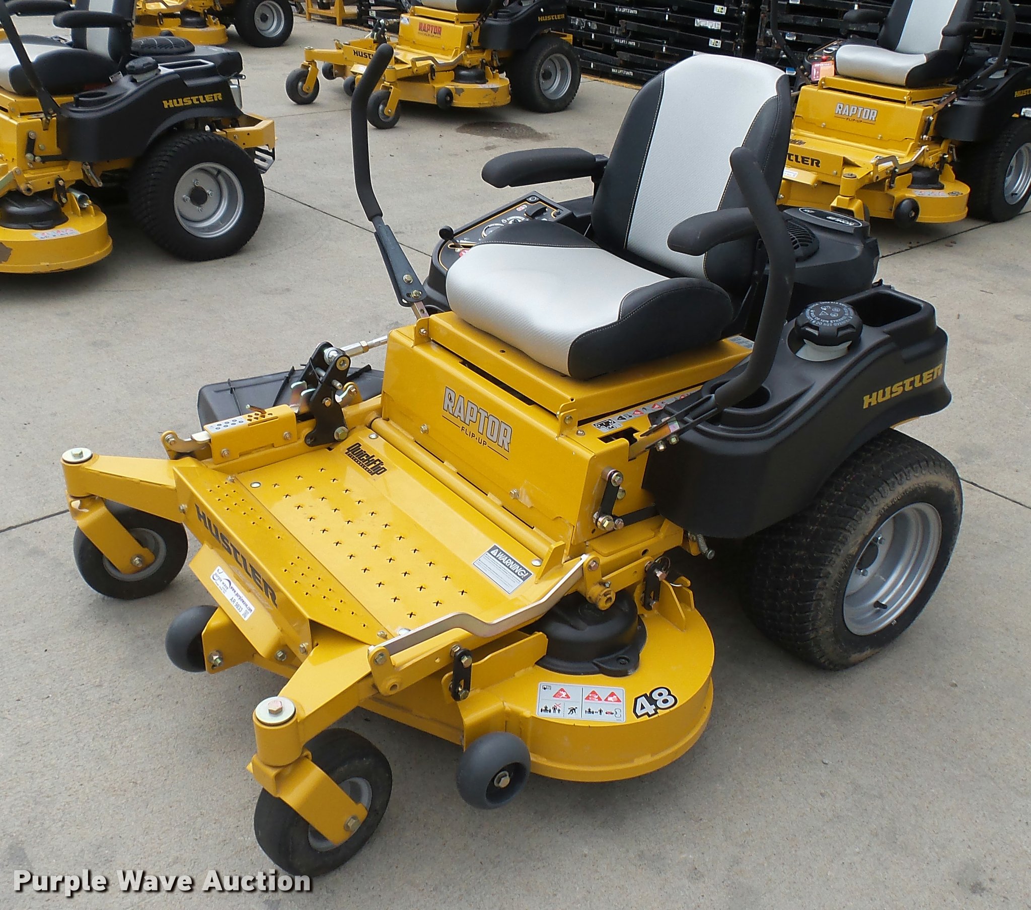 Purple Wave is selling a used Lawn Mower in Kansas. This item is a 2015 Hustler Raptor Flip-Up 933614 ZTR lawn mower with the following: 18 hours on meter, 48" cut, Kohler 25 HP gas engine, Hydro-Gear drive transmission, 9x3.5x4/2.25 front tires, 20x8x10 rear tires, Warranty return: paint issue, Serial 15129693