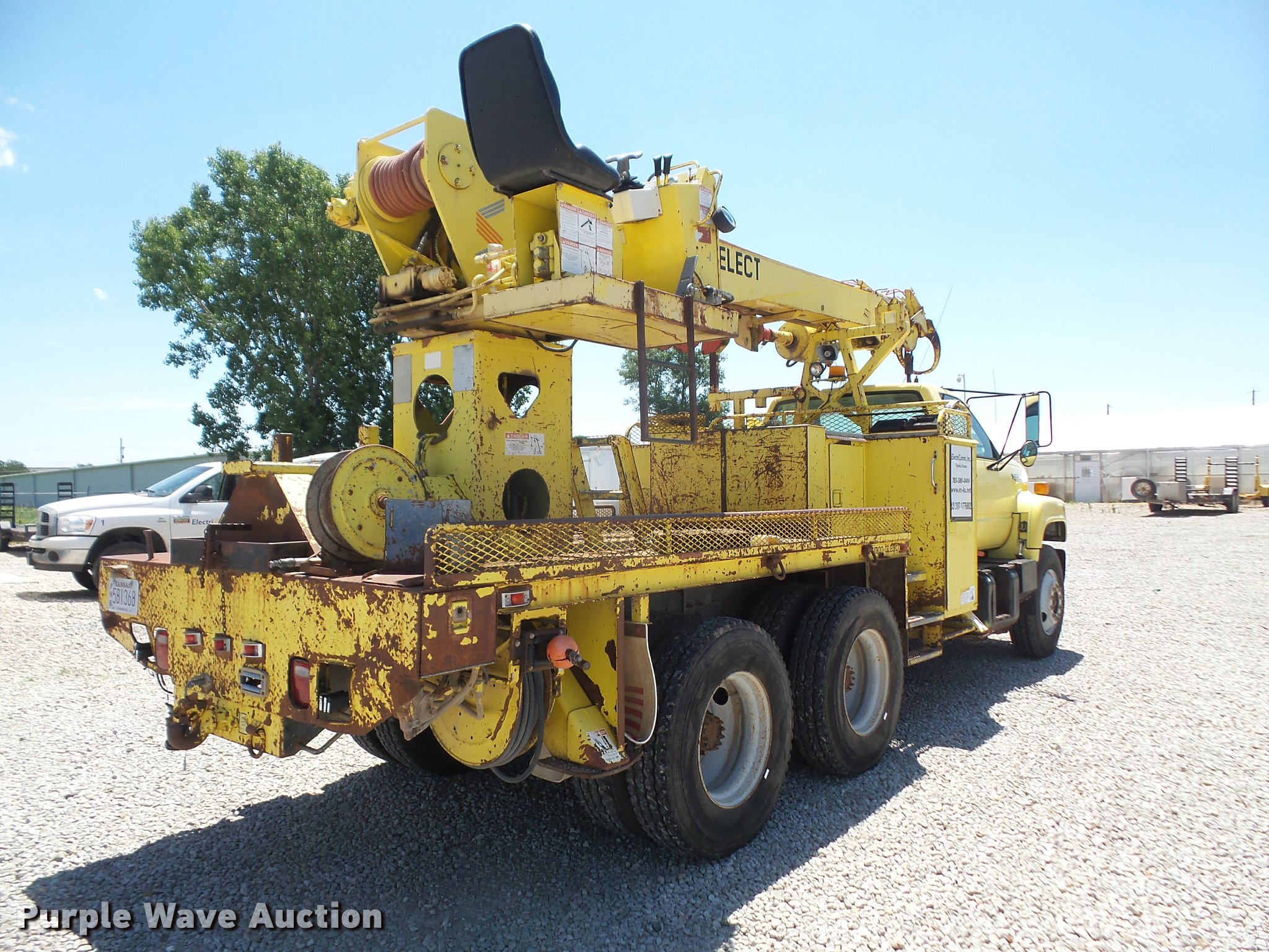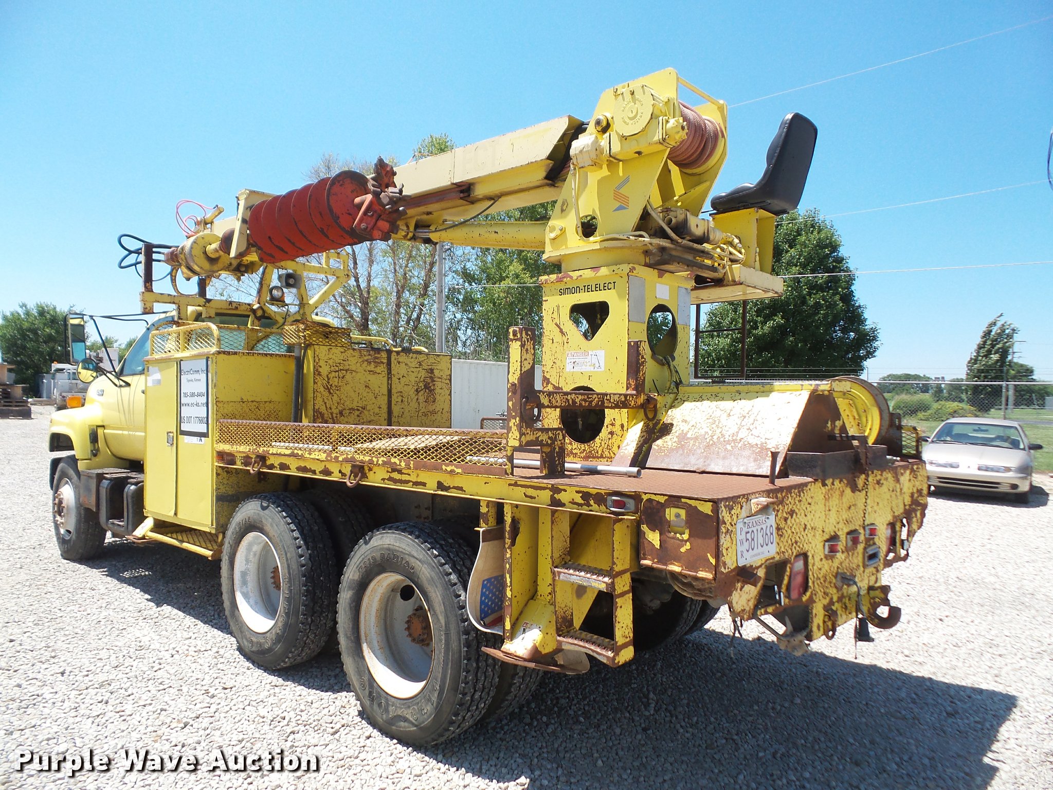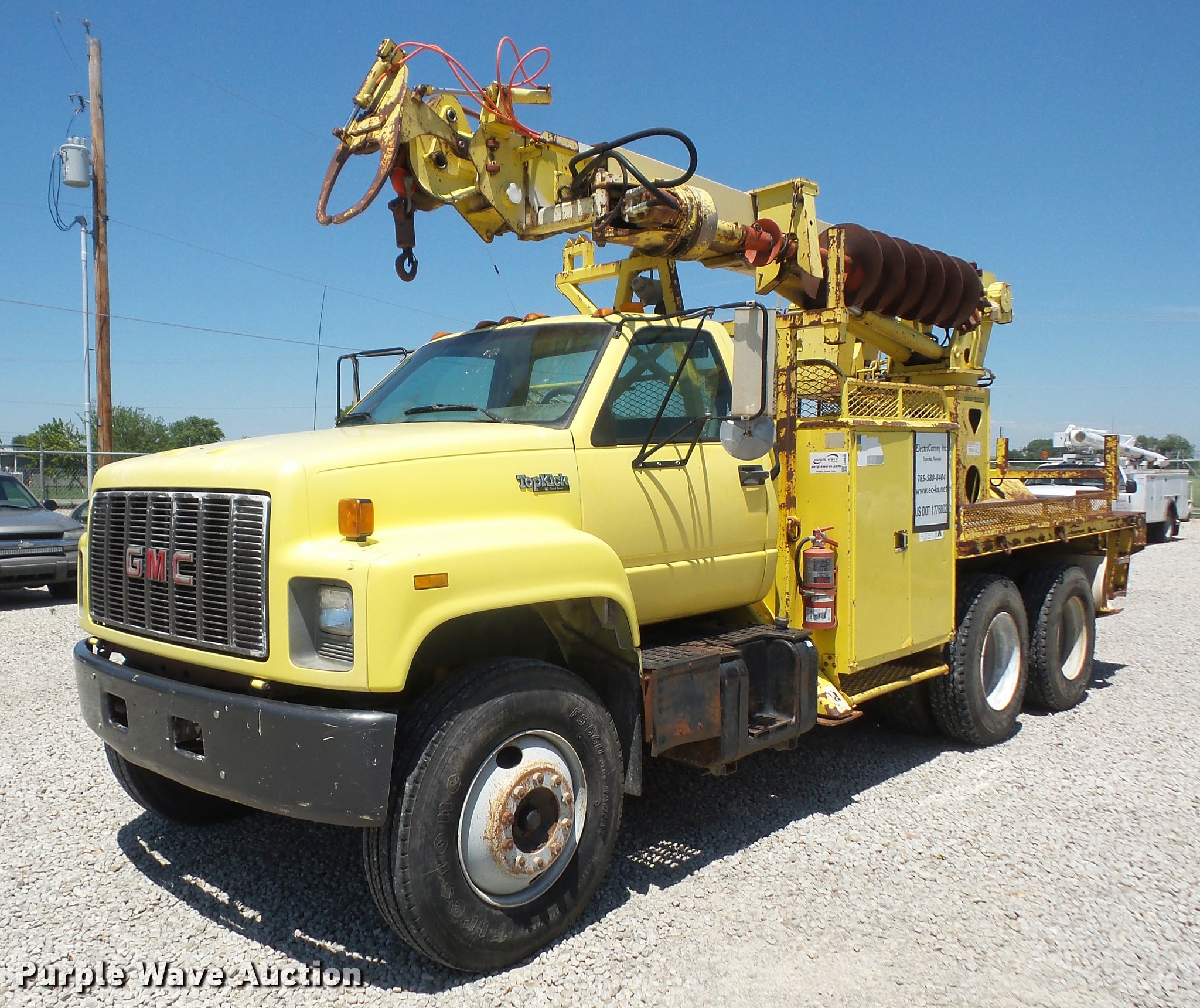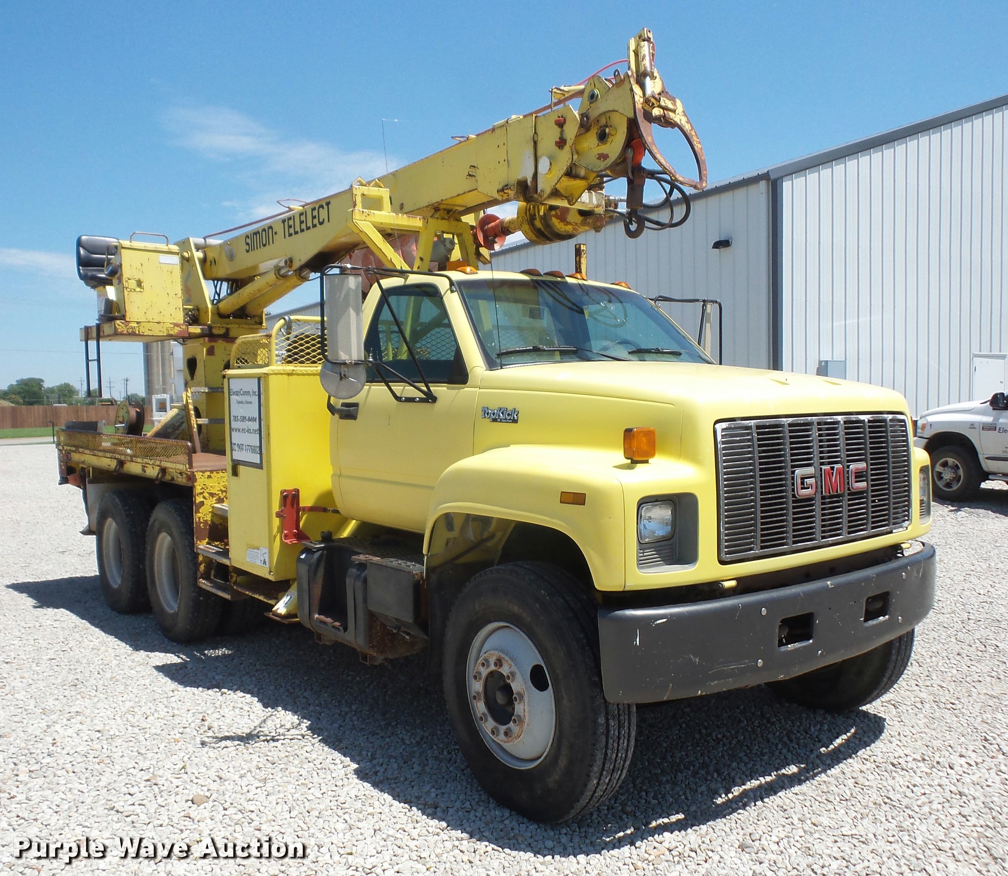 Purple Wave is selling a used Bucket Truck in Kansas. This item is a 1994 GMC TopKick digger derrick truck with the following: 120,243 miles on odometer, 13,025 hours on meter, Caterpillar 3116 6.6L six cylinder turbo diesel engine, 250 HP, Automatic transmission, Tandem axle, AC and heat, AM/FM, Suspension seat, PTO, 16'L service bed, Hydraulic hose reel, Simon Telelect 92-45 digger derrick, Ground boom controls, Boom rotation, Pole guide, Articulating boom, 18" diameter auger, Rope material handler, (4) outriggers, Serial 1834CBB, Dual fuel tanks, Pintle hitch, Air brakes, 11R22.5 tires, GVWR 46,000 lbs