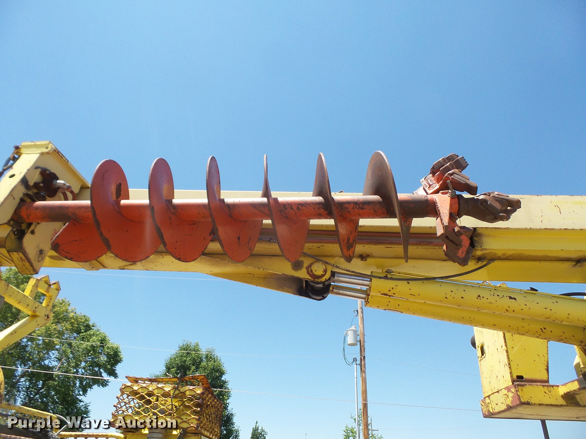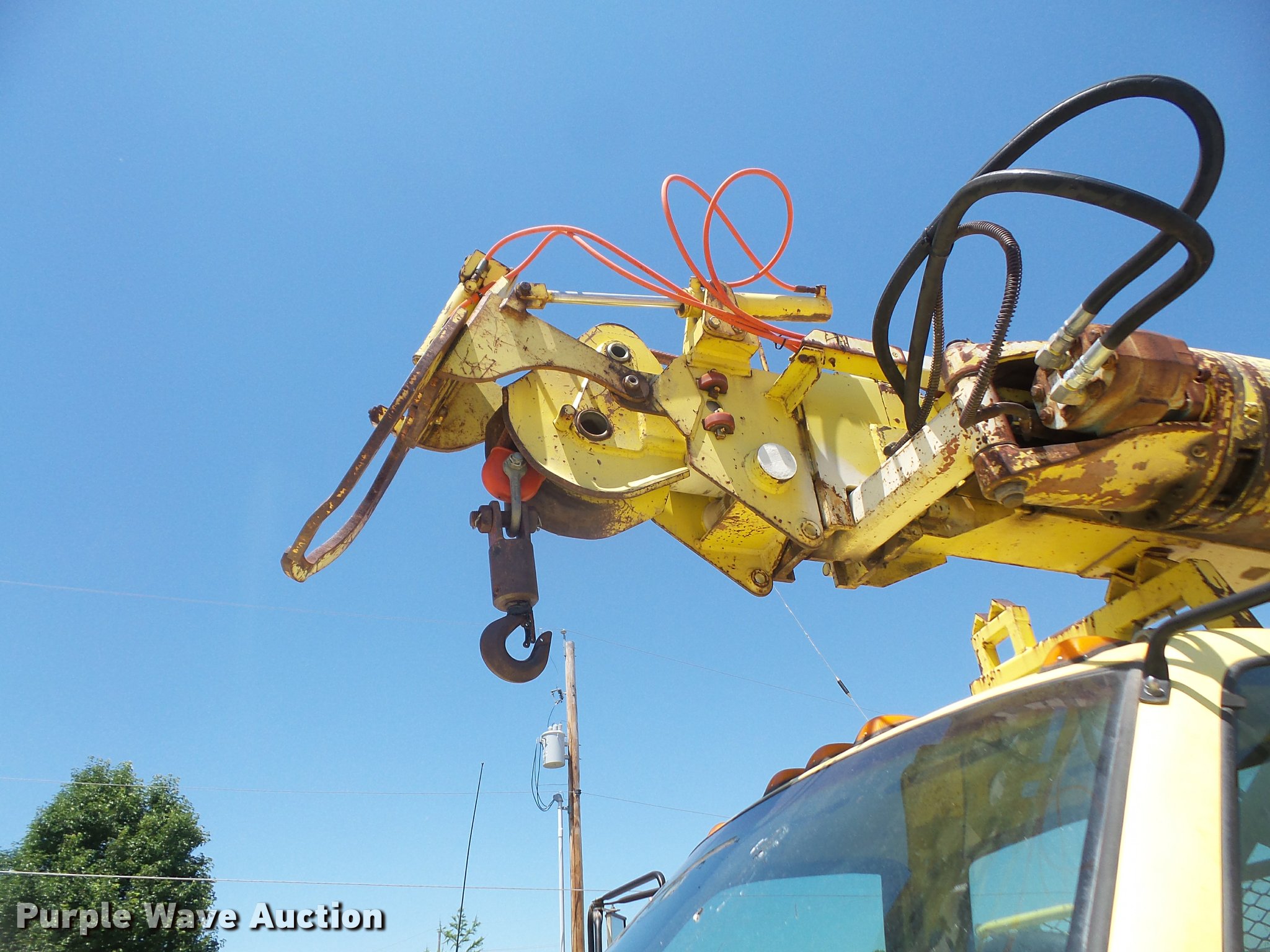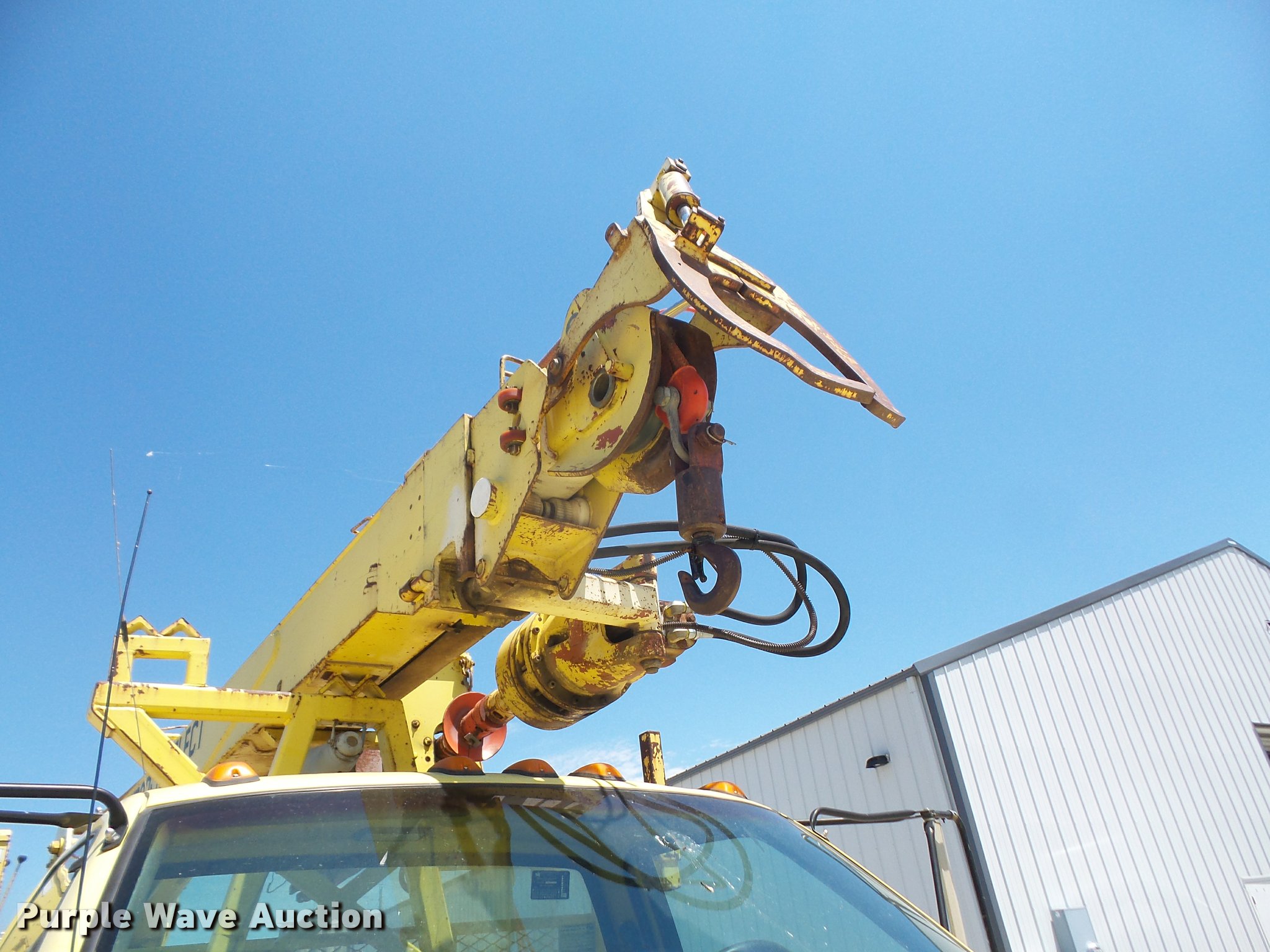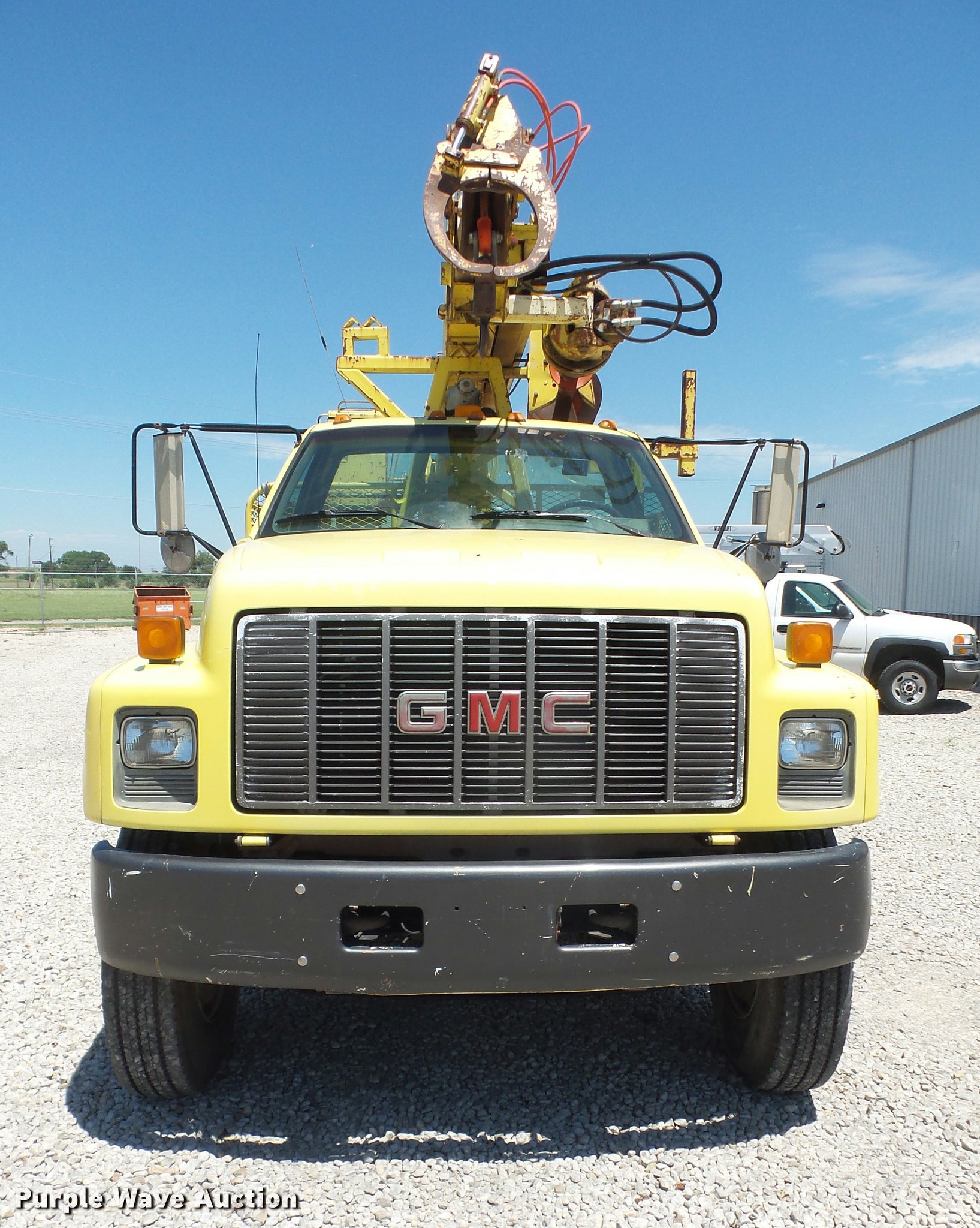Purple Wave is selling a used Bucket Truck in Kansas. This item is a 1994 GMC TopKick digger derrick truck with the following: 120,243 miles on odometer, 13,025 hours on meter, Caterpillar 3116 6.6L six cylinder turbo diesel engine, 250 HP, Automatic transmission, Tandem axle, AC and heat, AM/FM, Suspension seat, PTO, 16'L service bed, Hydraulic hose reel, Simon Telelect 92-45 digger derrick, Ground boom controls, Boom rotation, Pole guide, Articulating boom, 18" diameter auger, Rope material handler, (4) outriggers, Serial 1834CBB, Dual fuel tanks, Pintle hitch, Air brakes, 11R22.5 tires, GVWR 46,000 lbs