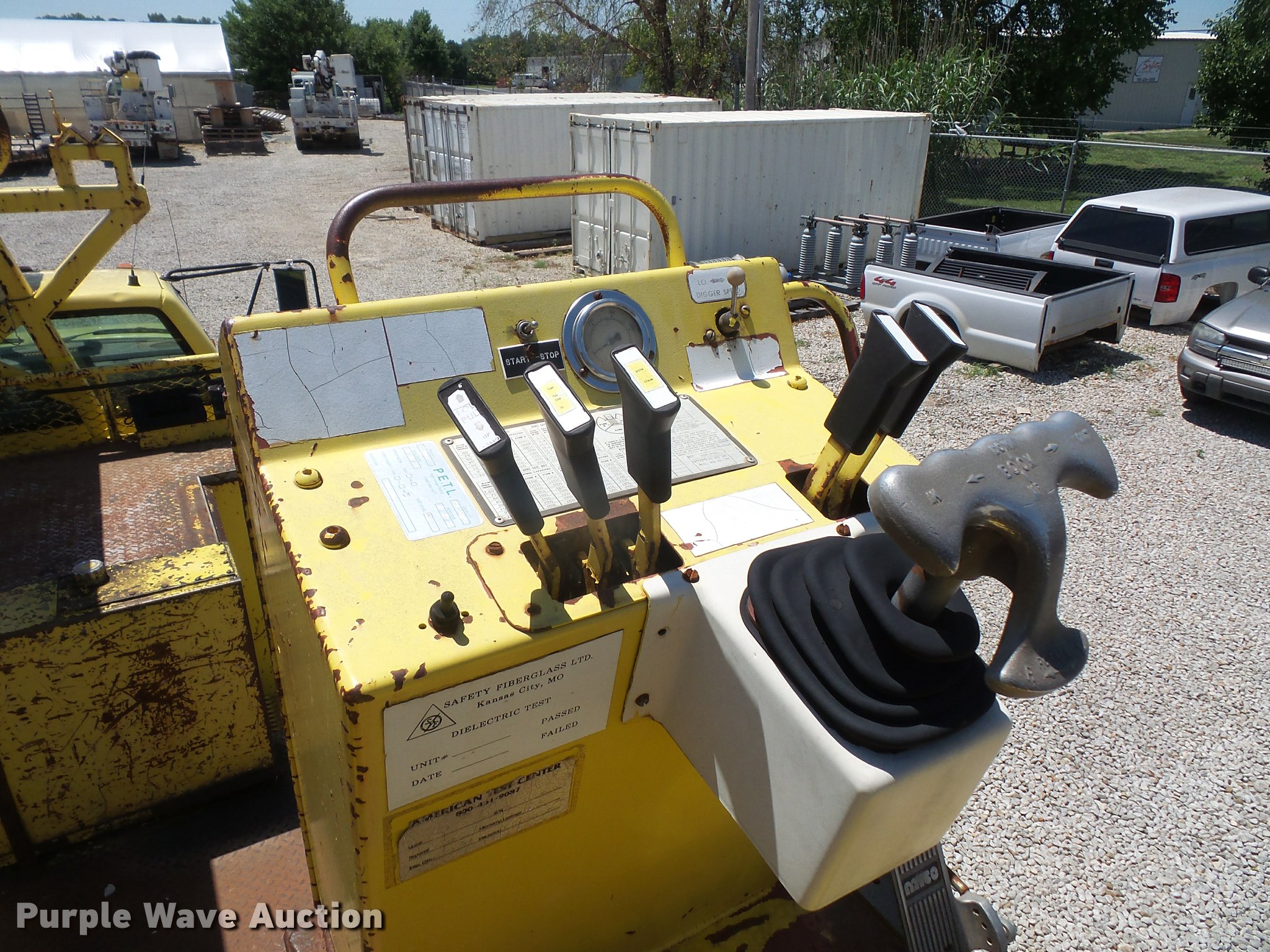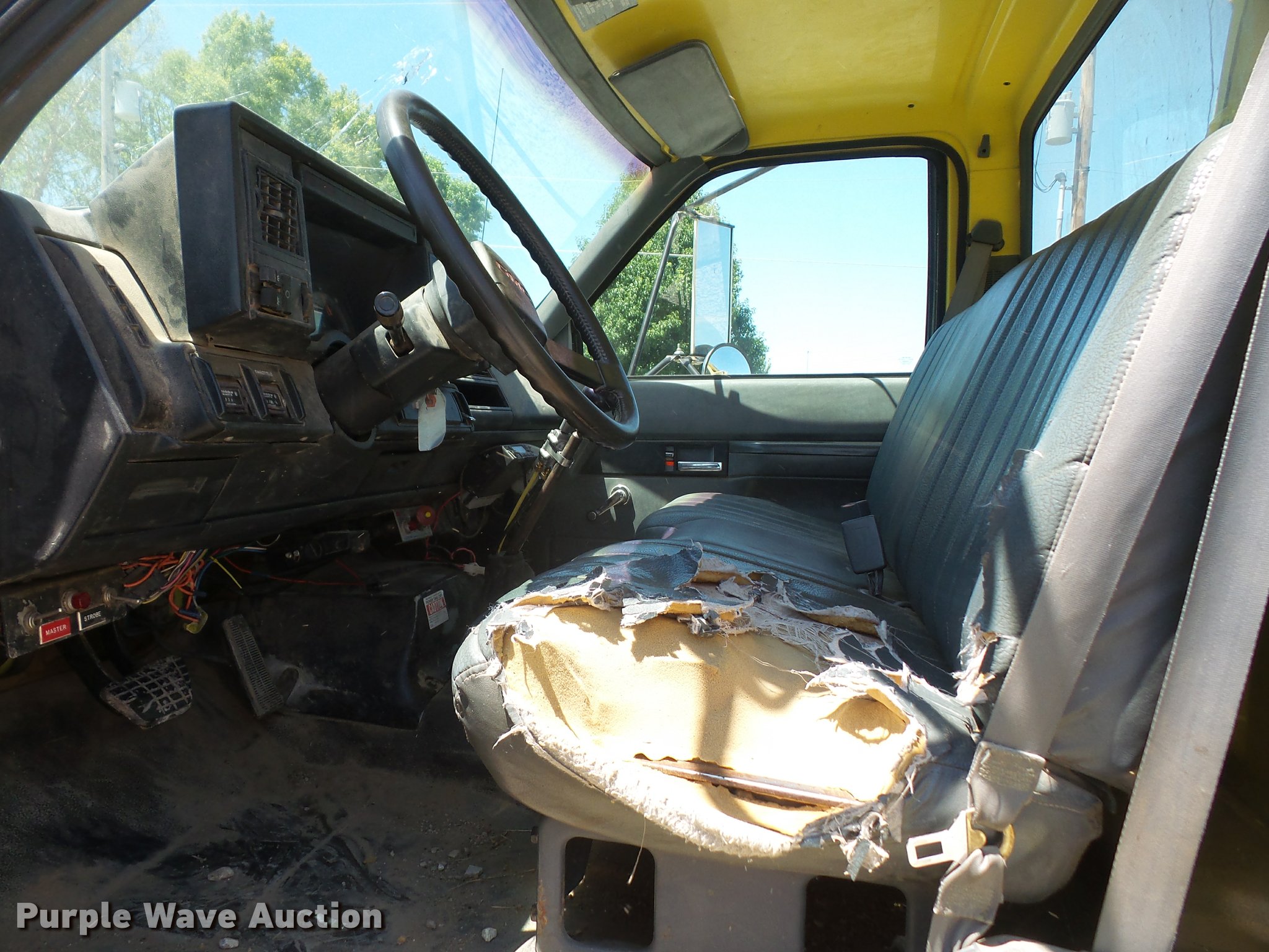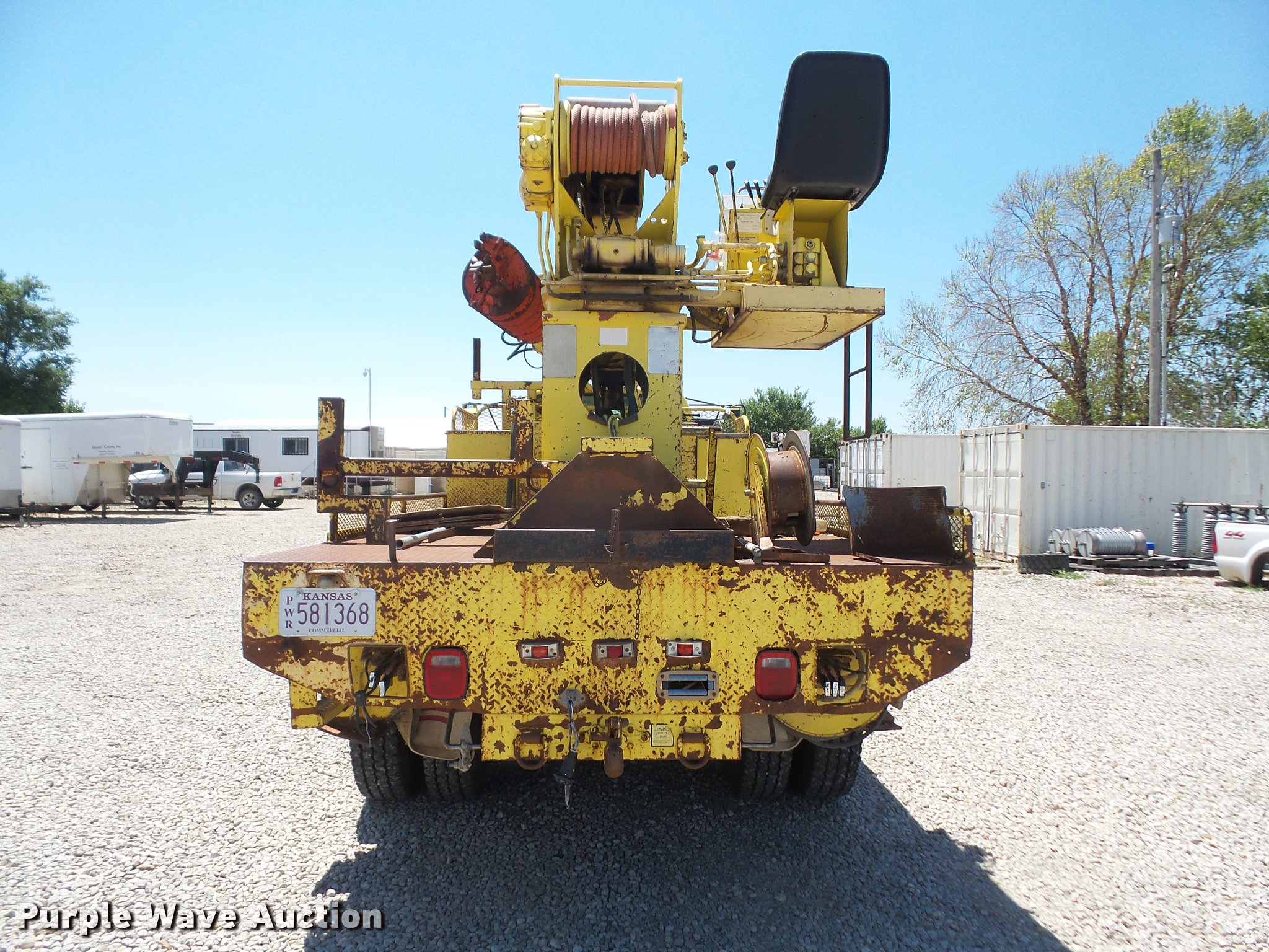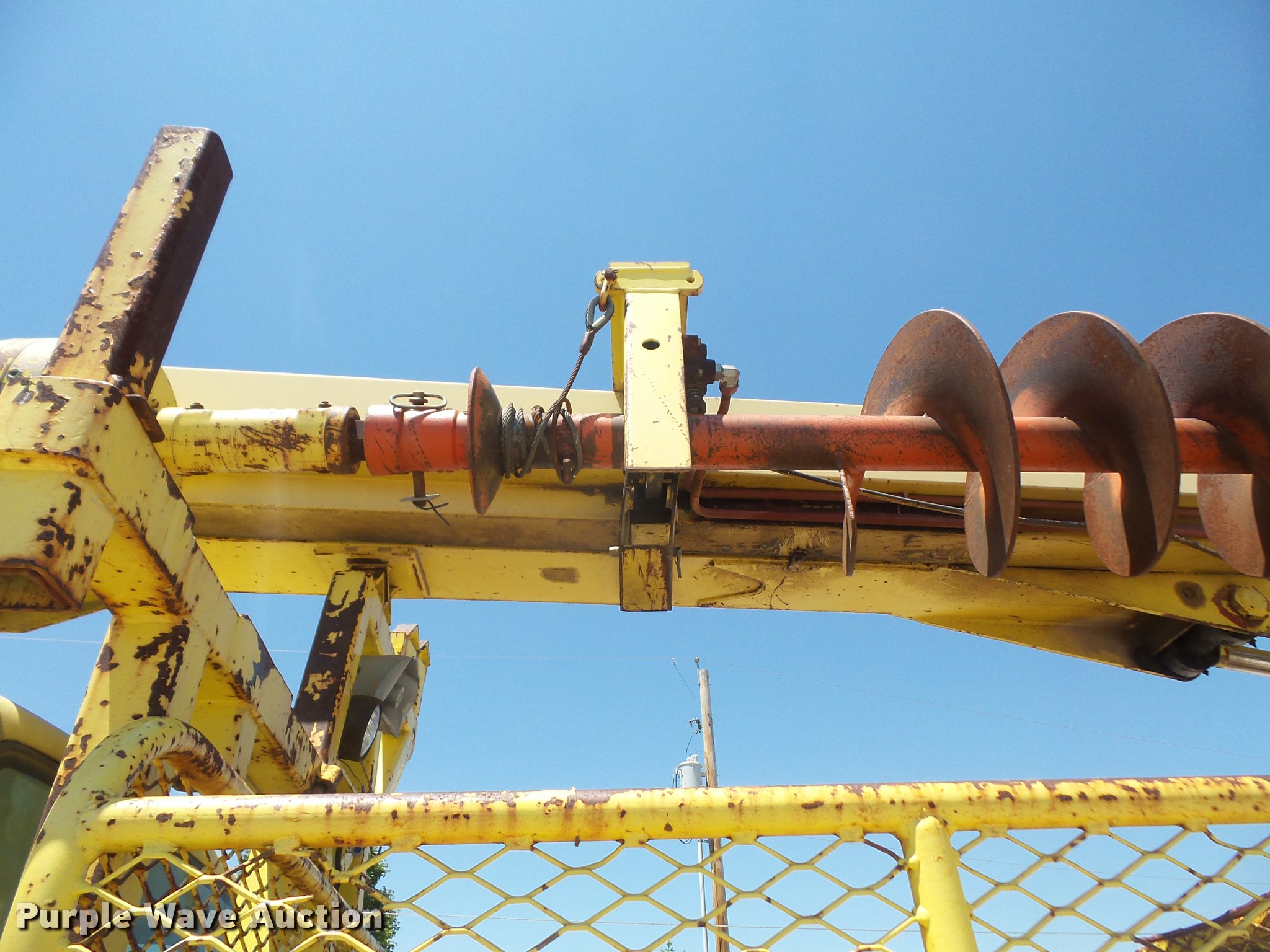 Purple Wave is selling a used Bucket Truck in Kansas. This item is a 1994 GMC TopKick digger derrick truck with the following: 120,243 miles on odometer, 13,025 hours on meter, Caterpillar 3116 6.6L six cylinder turbo diesel engine, 250 HP, Automatic transmission, Tandem axle, AC and heat, AM/FM, Suspension seat, PTO, 16'L service bed, Hydraulic hose reel, Simon Telelect 92-45 digger derrick, Ground boom controls, Boom rotation, Pole guide, Articulating boom, 18" diameter auger, Rope material handler, (4) outriggers, Serial 1834CBB, Dual fuel tanks, Pintle hitch, Air brakes, 11R22.5 tires, GVWR 46,000 lbs