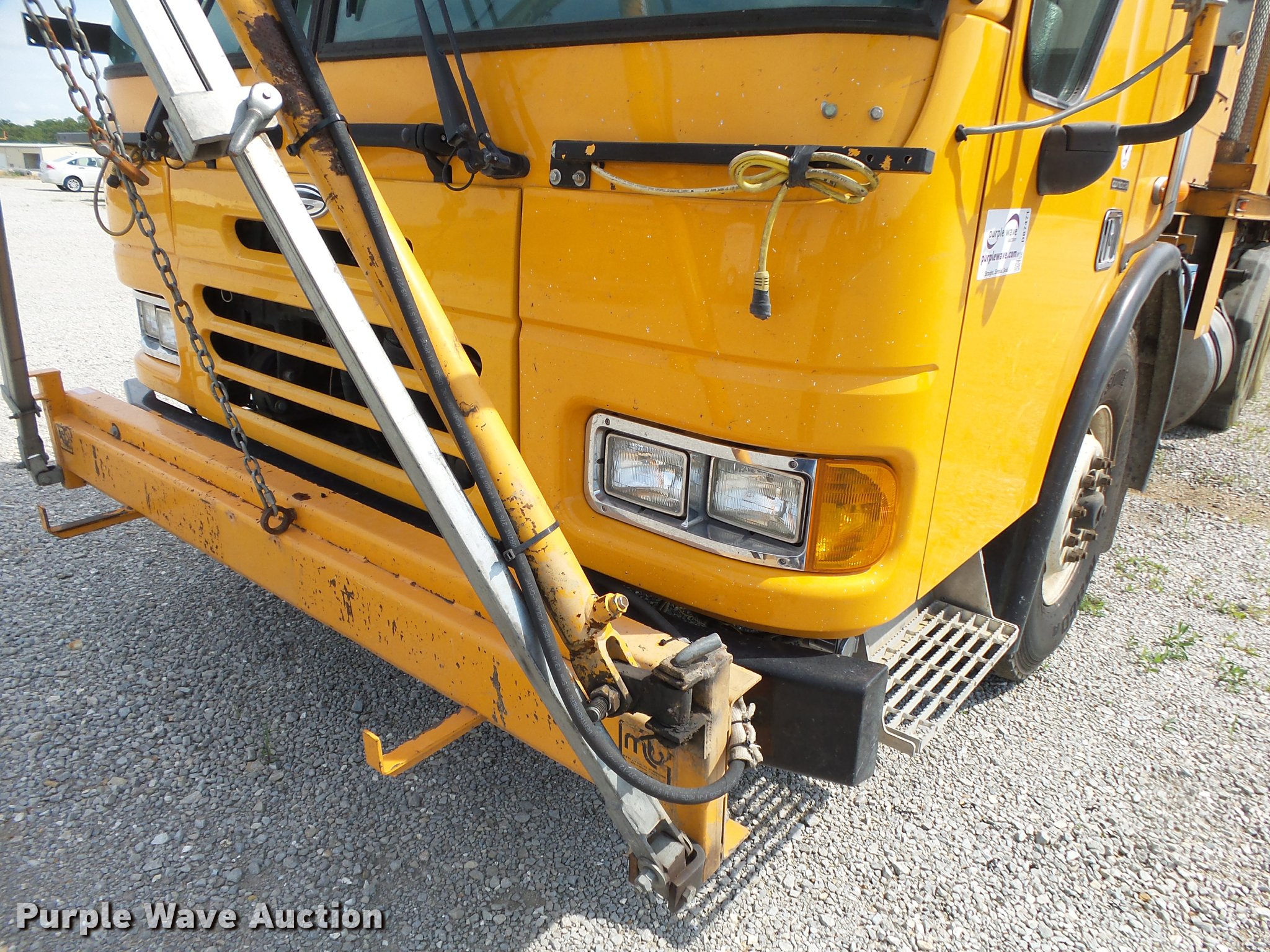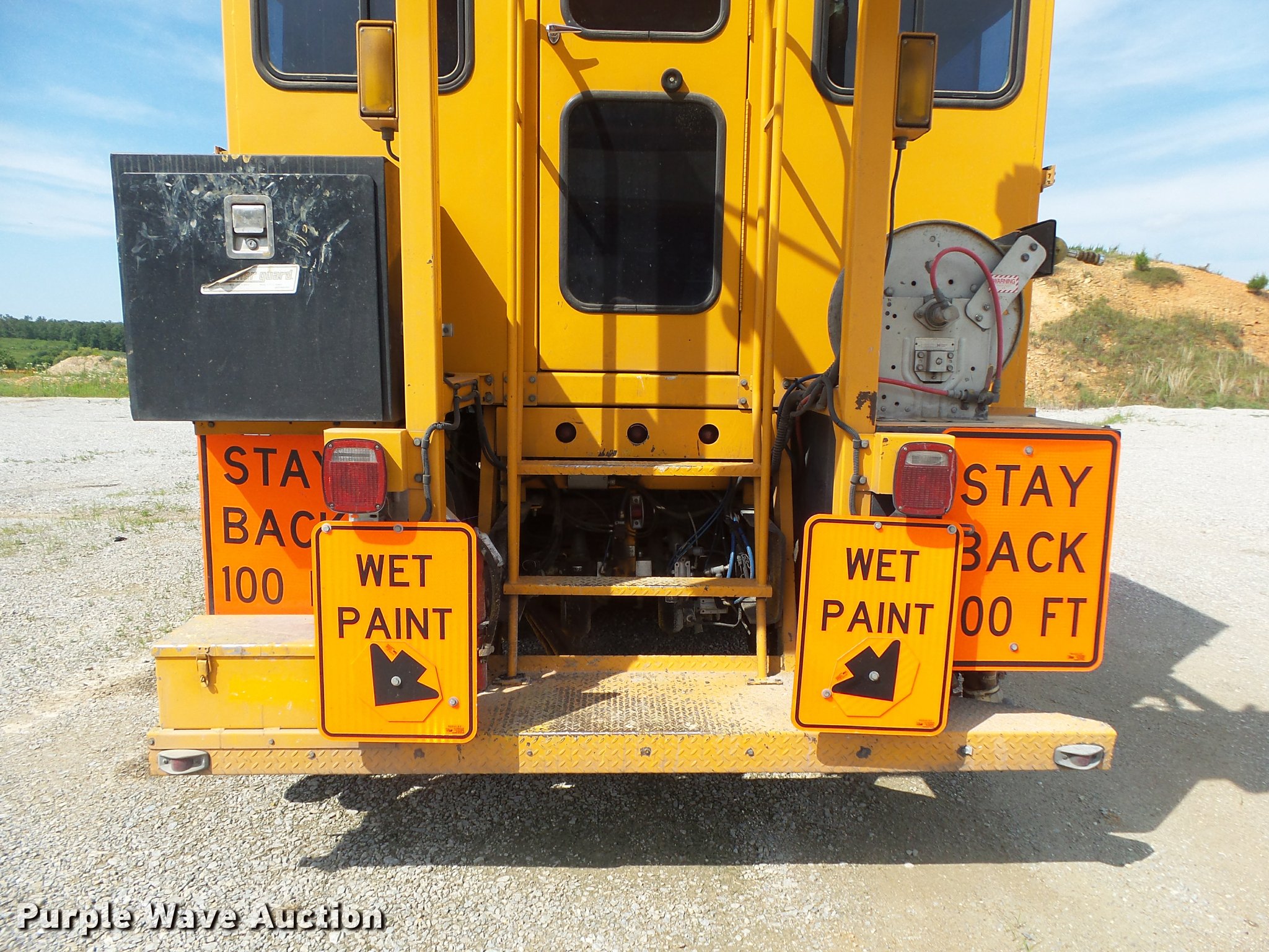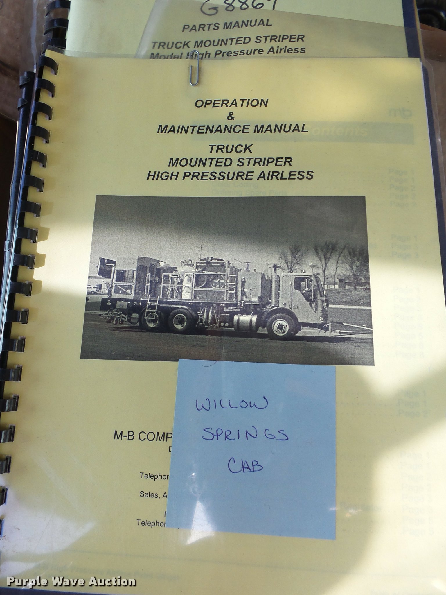 2003 Sterling Condor paint striper truck. 201,088 miles on odometer, Cummins ISL 8.9L L6 turbo diesel engine, Automatic transmission, Inter-axle differential lock, Tandem axle, AC and heat, AM/FM, Air suspension seat, Dual operator stations, 425 gallon white paint tank, 200 gallon yellow paint tank, 6,000 lbs bead pot, 2,000 lbs bead pot, Solvent tank, Rear traffic control board, Sullair 250 air compressor, John Deere four cylinder diesel engine, Dual fuel tanks, Single rear exhaust stack, Air suspension, Air brakes, 315/80R22.5 tires, GVWR 58,000 lbs, MODOT ID G8869. Missouri title. 49HHBVCY43RL90613. Missouri Department of Transportation (MODOT). 3956 E Street. Willow Springs, MO 65793