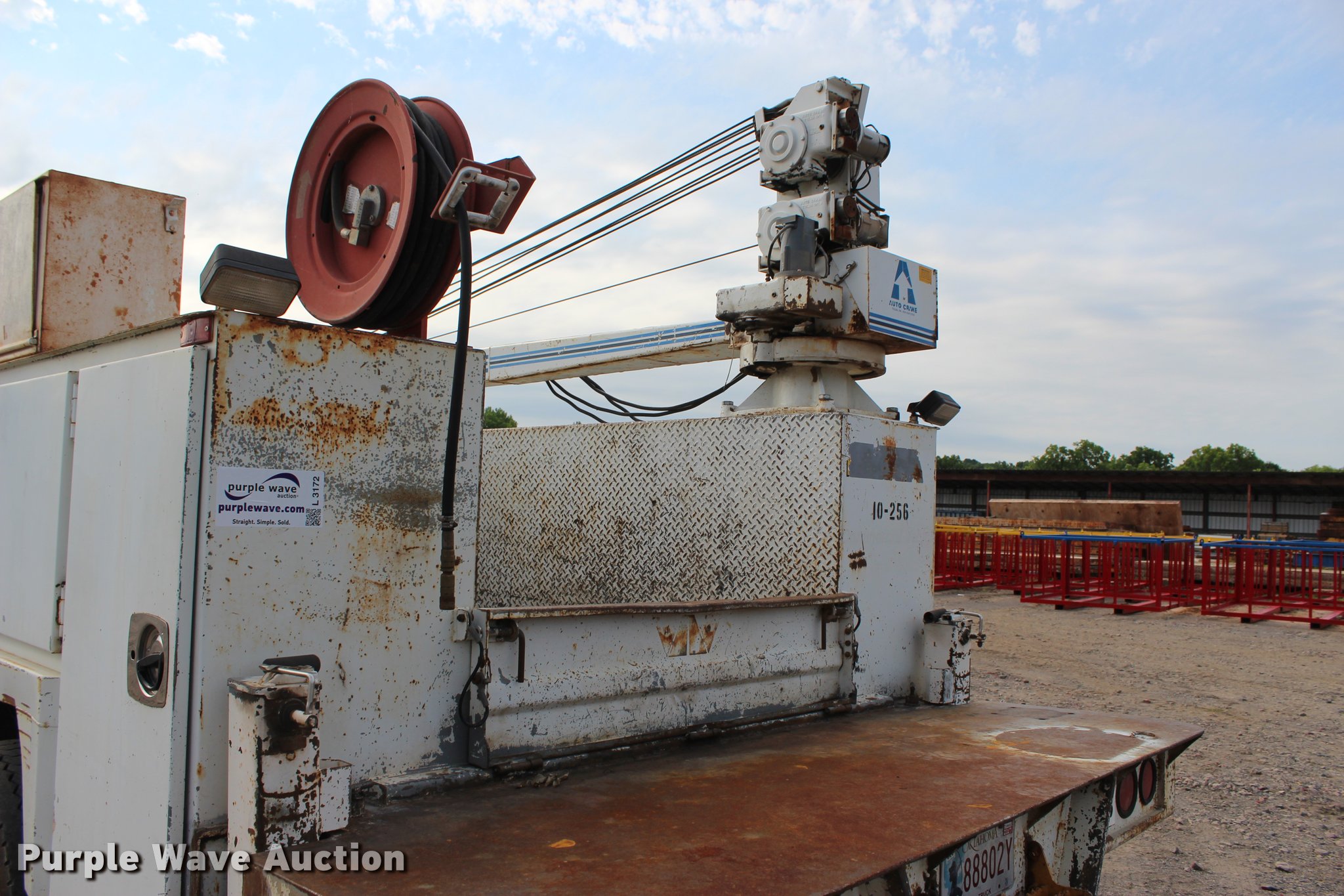 Purple Wave is selling a used Service Truck in Oklahoma. This item is a 2002 International 4300 service truck with crane with the following: 376,087 miles on odometer, International DT466 7.6L L6 turbo diesel engine, Eaton Fuller six speed manual transmission, Single axle, AC and heat, AM/FM/CD, Power windows and locks, Air suspension seat, Block heater, Backup alarm, Beacon light, Dutec service bed, 14'L, Shelving, Slide-out drawers, Work lights, Torch bottle rack, Hose reel, Auto Crane 6006 crane, Remote control, (2) outriggers, Front tow hooks, Receiver hitch, Trailer wiring, Spring suspension, Air brakes, 255/70R22.5, Unit# 10-256