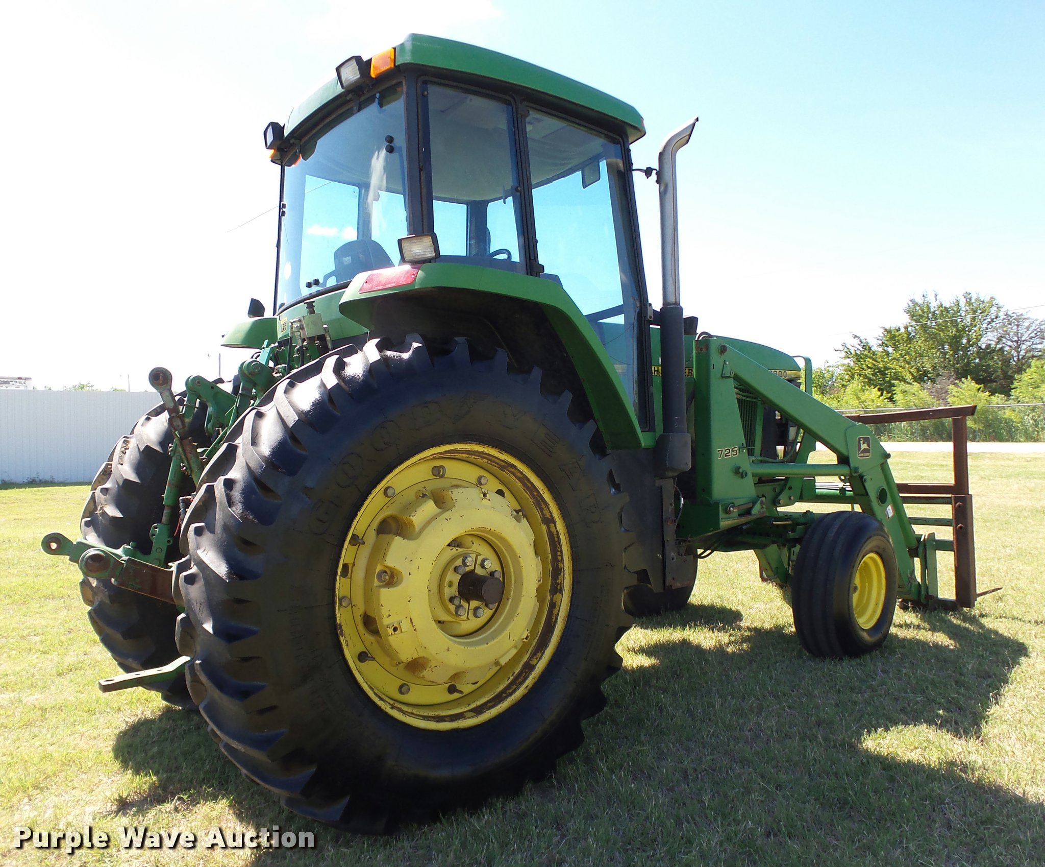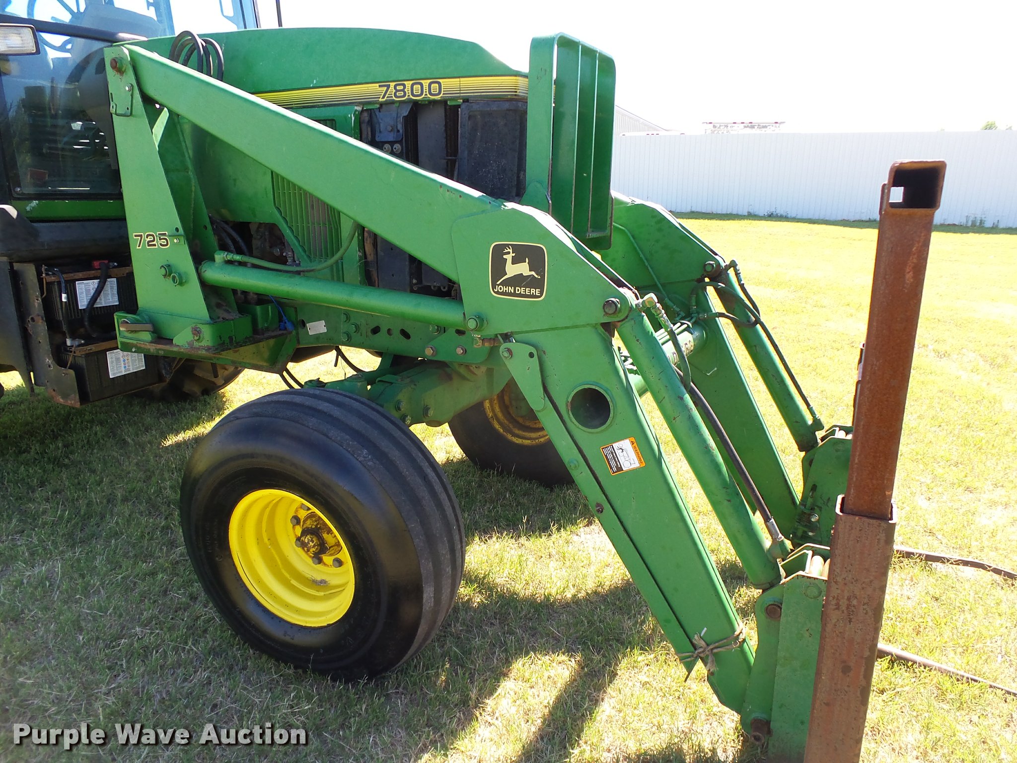 Purple Wave is selling a used Tractor in Oklahoma. This item is a 1993 John Deere 7800 tractor with the following: 2,001 hours on meter, John Deere 6076TRW30 7.6L six cylinder turbo diesel engine, 159 HP, Serial RG6076T513704, John Deere Powr Quad partial powershift transmission, 16F-12R gears, AC and heat, Tilt steering wheel, AM/FM/cassette/weatherband, Suspension seat, Front and rear work lights, John Deere 725 loader, Tri-L three spear bale spear, Joystick controls, Three point, Top link, Seven pin outlet, 540/1000 PTO, (2) rear hydraulic remote sets, (4) rear wheel weights, 114" wheelbase, Firestone 11.00-16 front tires, Goodyear 520/85R38 rear tires, Engine blow-by, Serial RW7800H003980