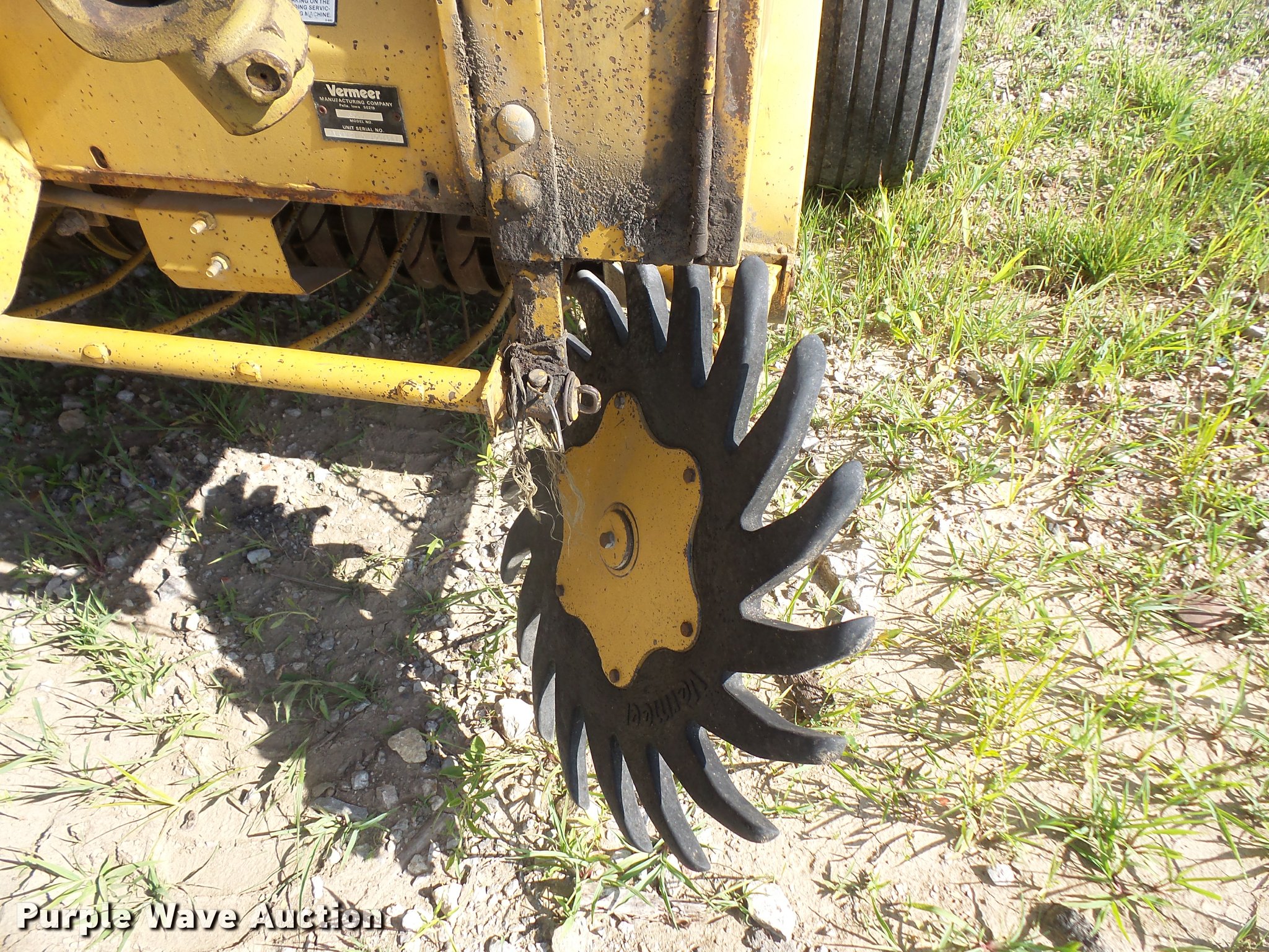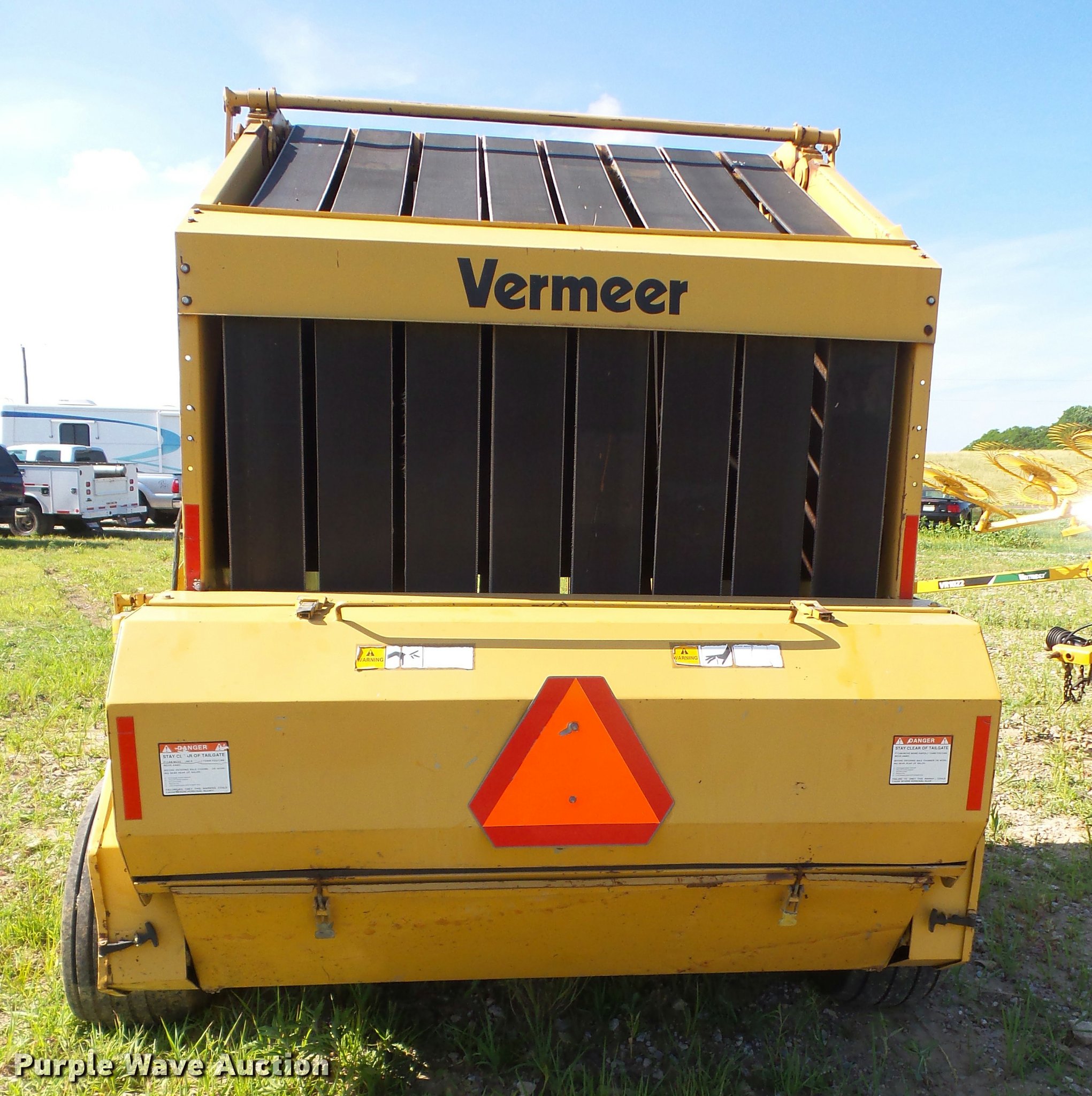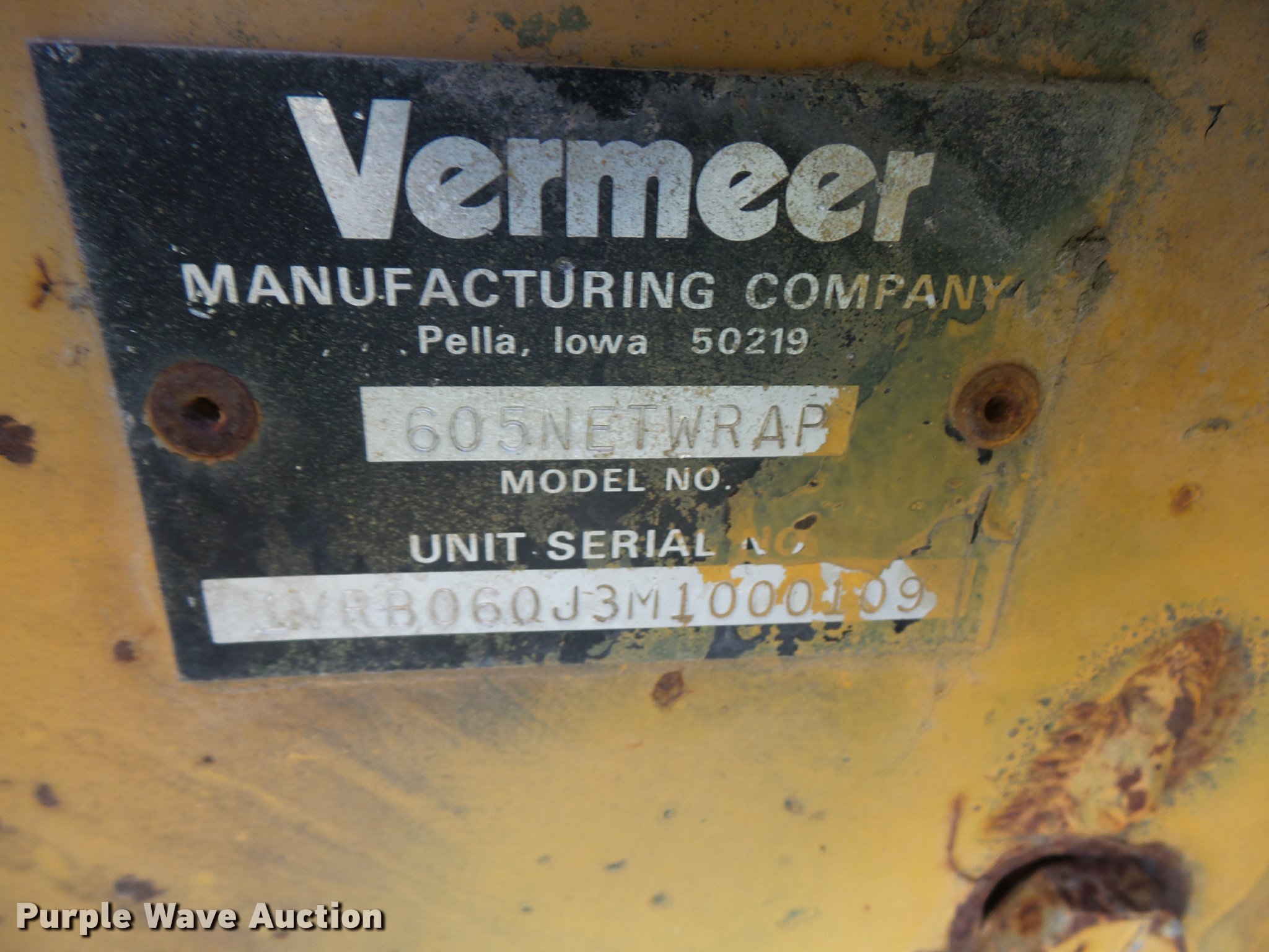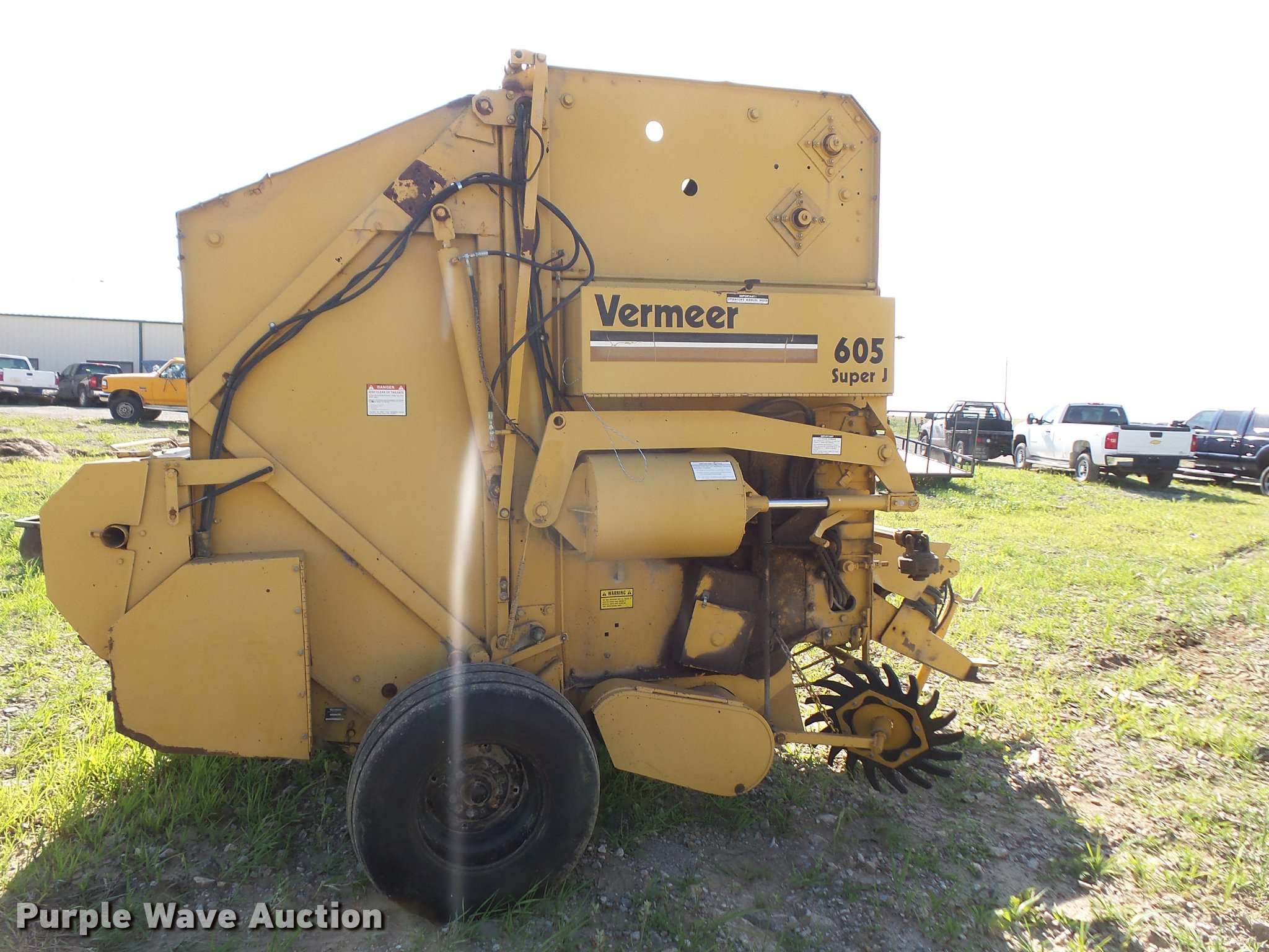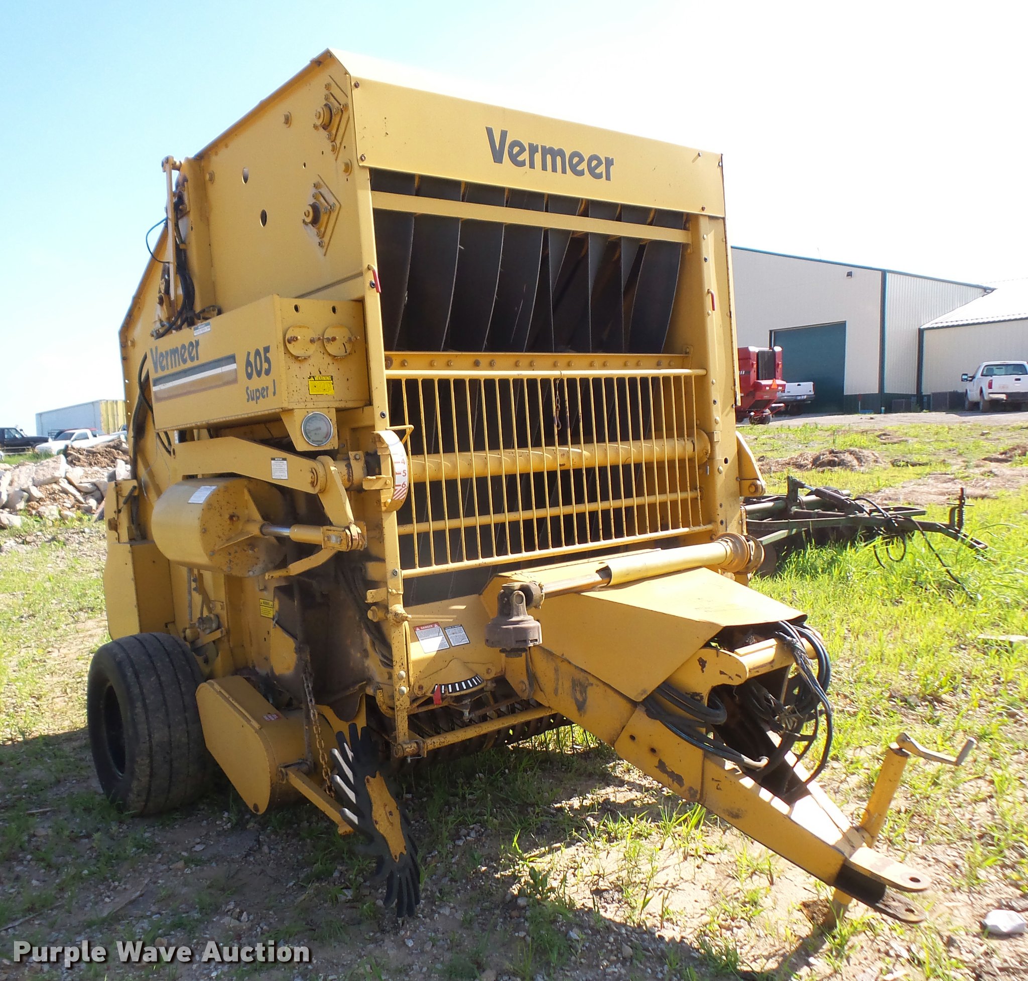 Purple Wave is selling a used Round Baler in Kansas. This item is a 1991 Vermeer 605 Super J round baler with the following: 5' x 6' bale capacity, 60"W pickup, Gathering wheels, Auto lube system, Monitor, Twin twine tie, Net-wrap, Bale ramp, 540 PTO, Pin hitch, 13.50-15 tires, Serial 1VRA121RXM1004647