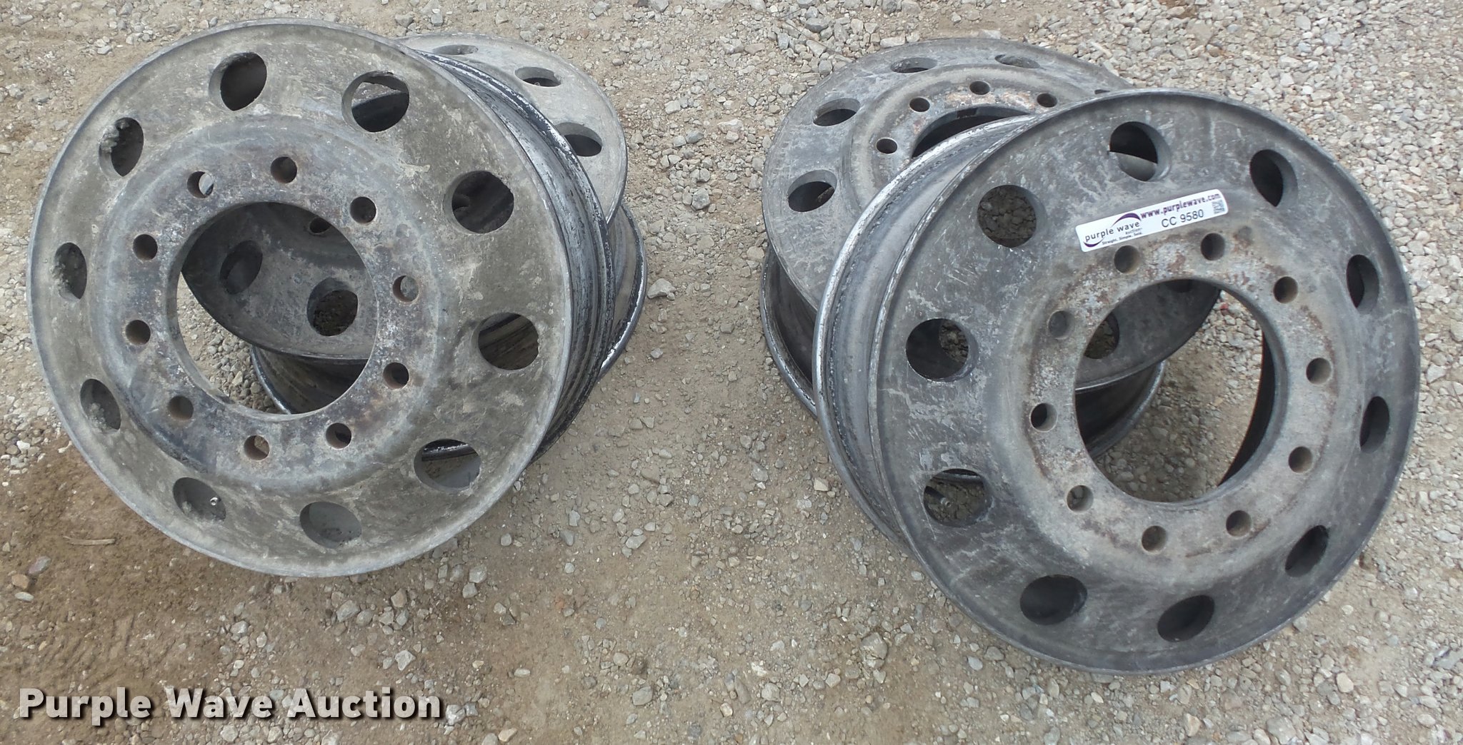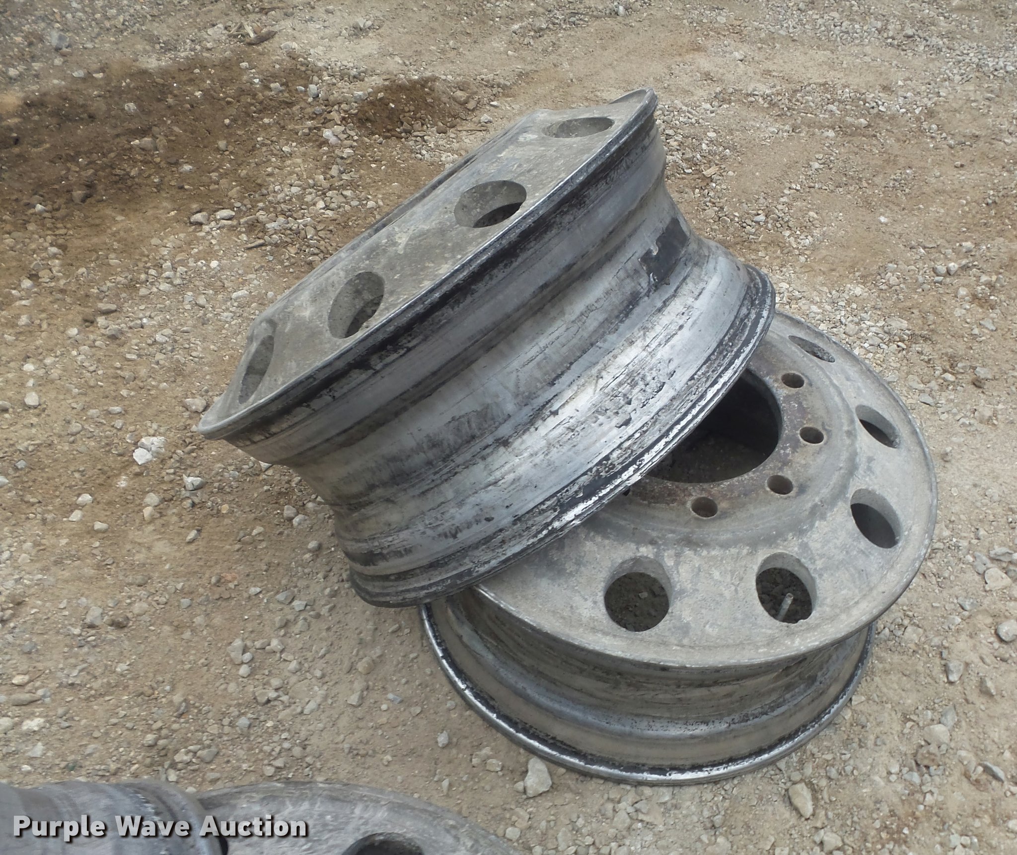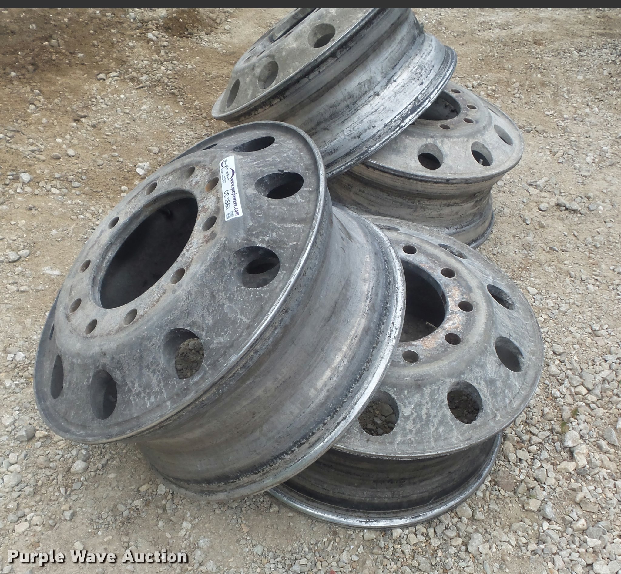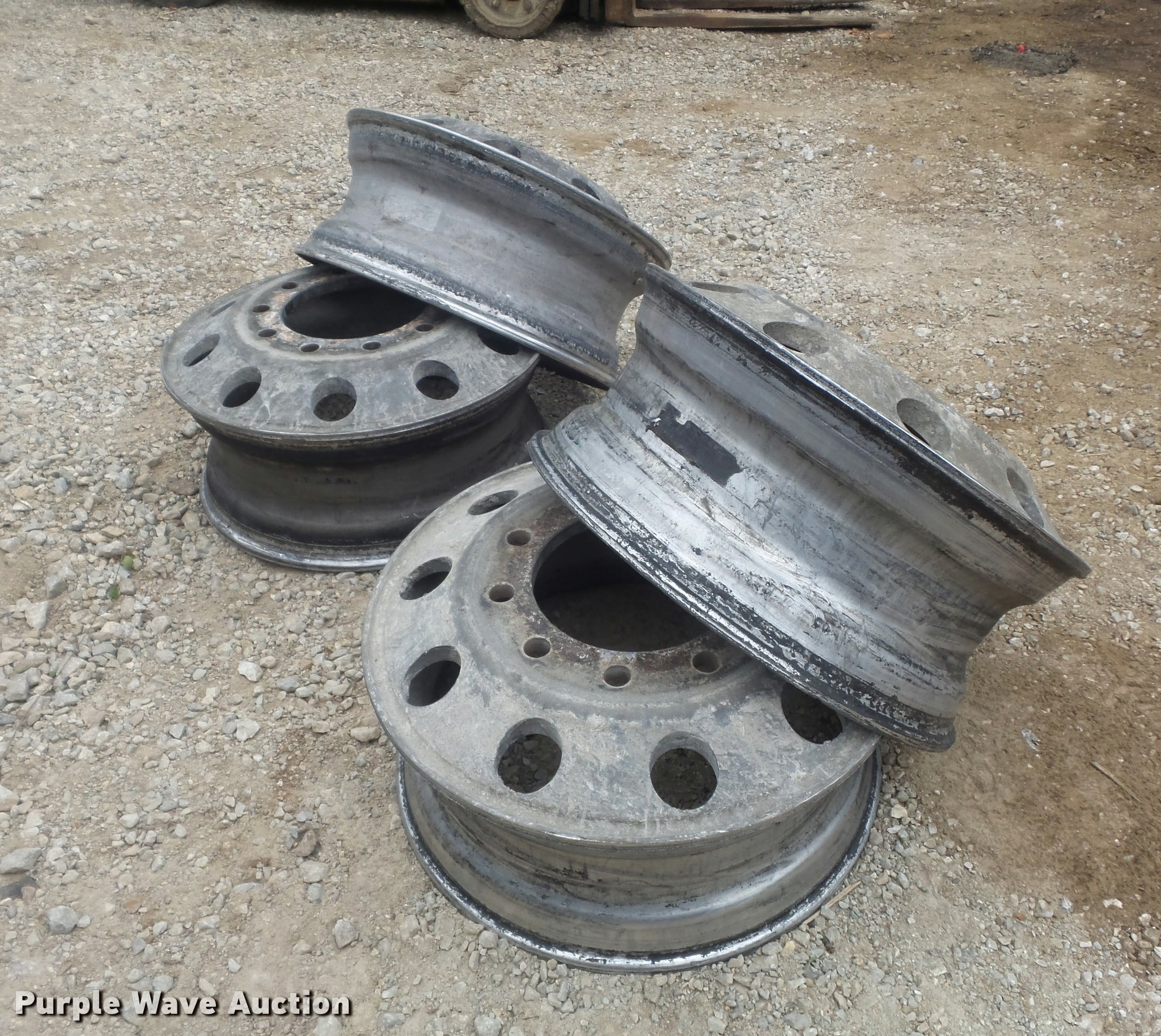Purple Wave is selling a used Industrial Tires or Tracks in Missouri. This item is a (4) 8.25x22.5 aluminum wheels with the following: 10 lug, Pilot hub