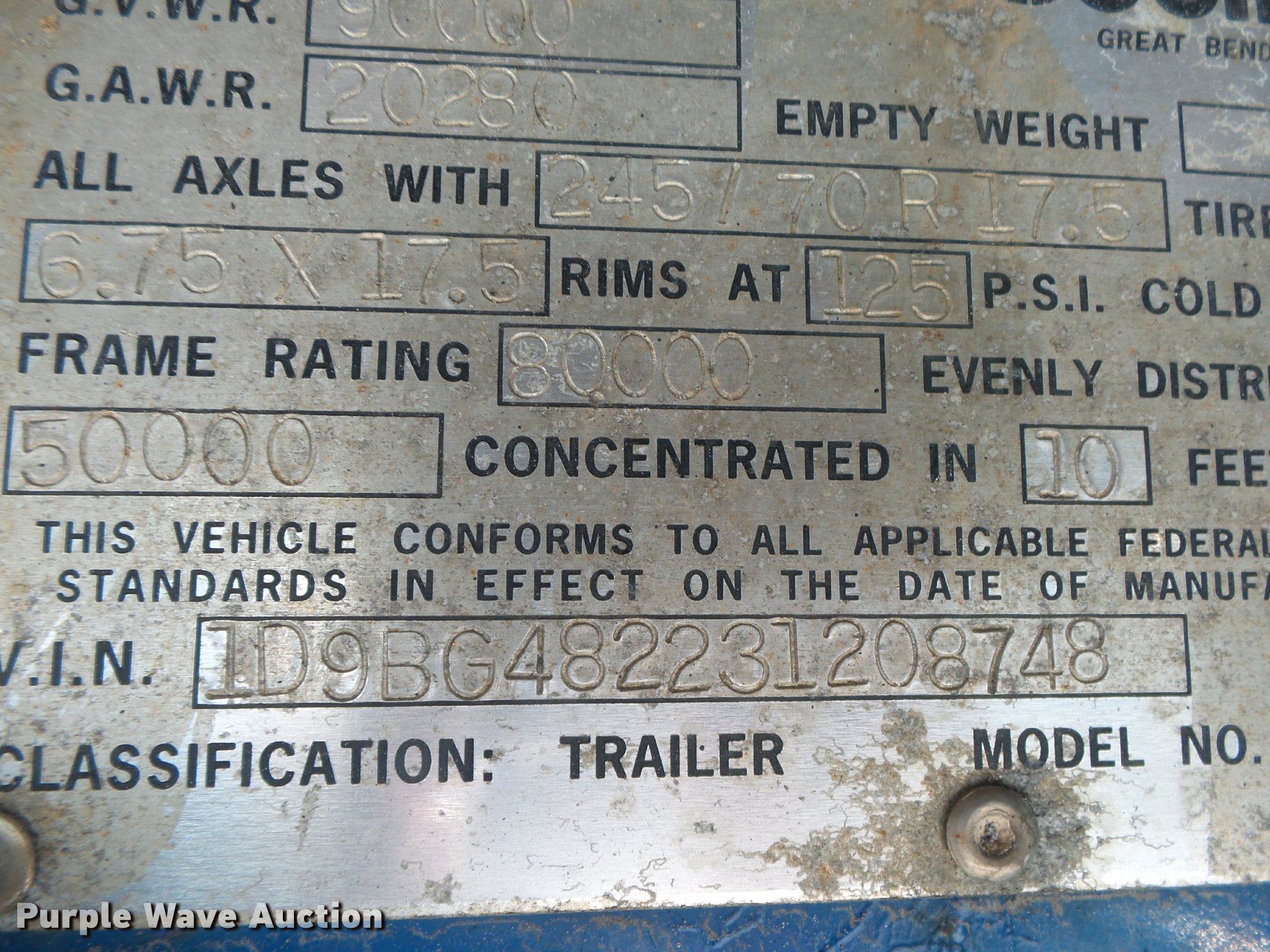 Purple Wave is selling a used Flat or Drop Deck Trailer in Missouri. This item is a 2002 Doonan drop deck trailer with the following: 48'L x 102"W overall, 10'L top deck, 38'L main deck, 33" floor height, Stake pockets, Fifth wheel plate, Dual leg landing gear, Air suspension, Air brakes, Tandem axle, Aluminum wheels, 235/75R17.5 tires, GVWR 90,000 lbs, GAWR 20,280 lbs