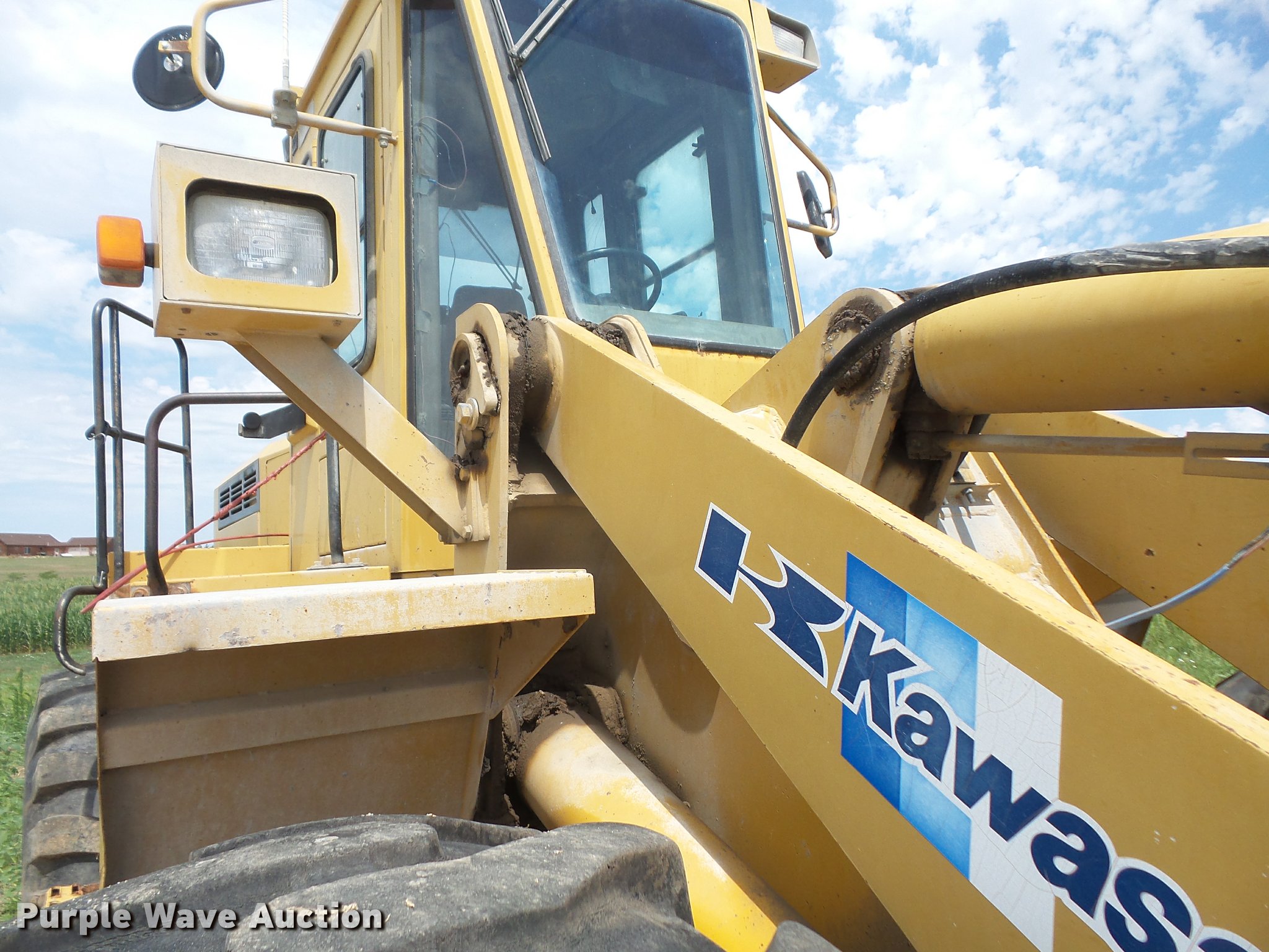 Purple Wave is selling a used Wheel Loader in Kansas. This item is a Kawasaki 80Z III wheel loader with the following: 8,763 hours on meter, Cummins 6CT-8.3-C 8.3L six cylinder turbo diesel engine, 178 HP, Powershift transmission, 4F gears, Enclosed cab, Two lever bucket controls, Front and rear work lights, 110"W bucket, Bolt-on cutting edge, 3.25 cu. yd. capacity, 23.5-25 tires, Non-operational transmission, unit will not move, Serial 80C15135