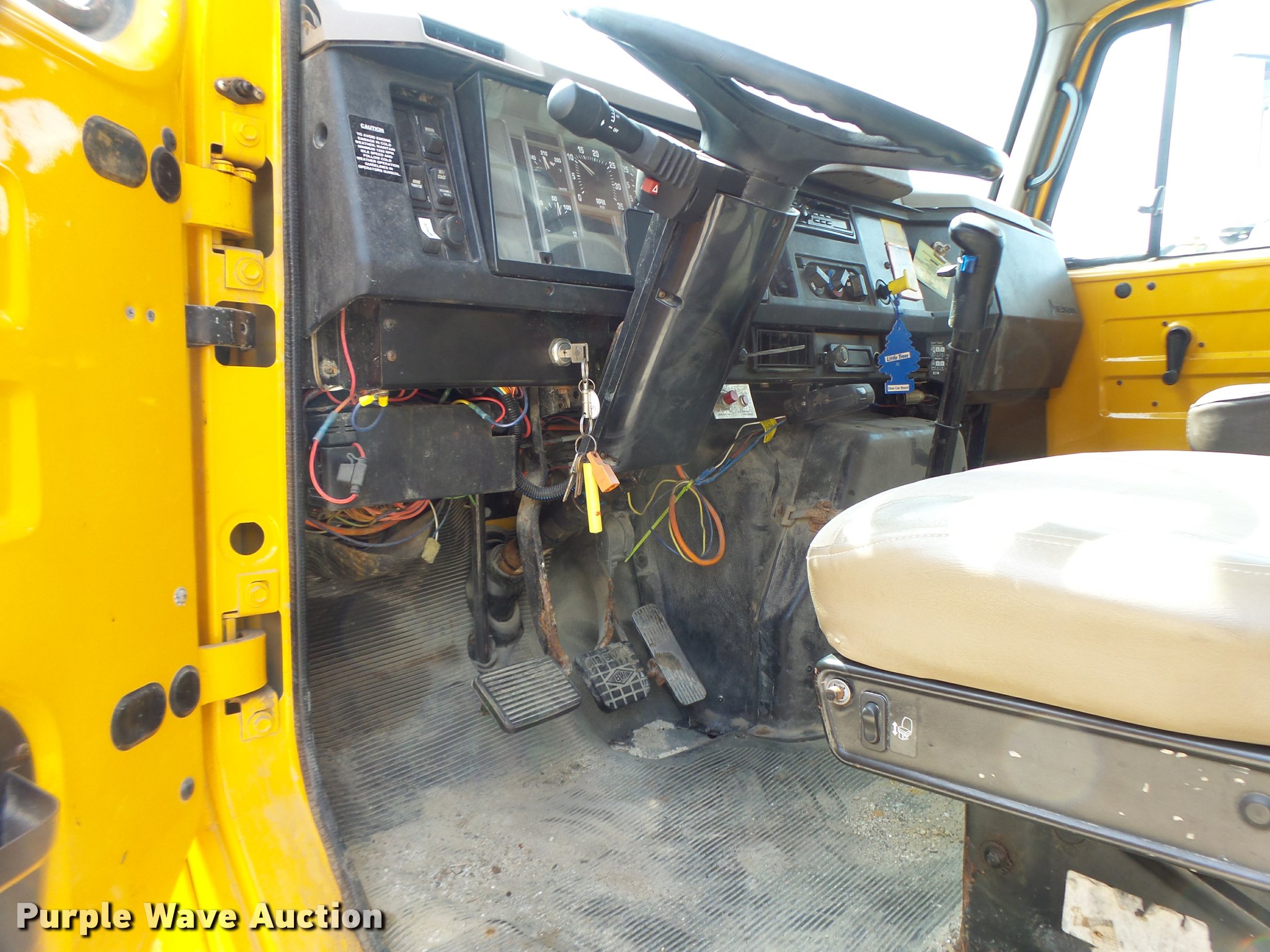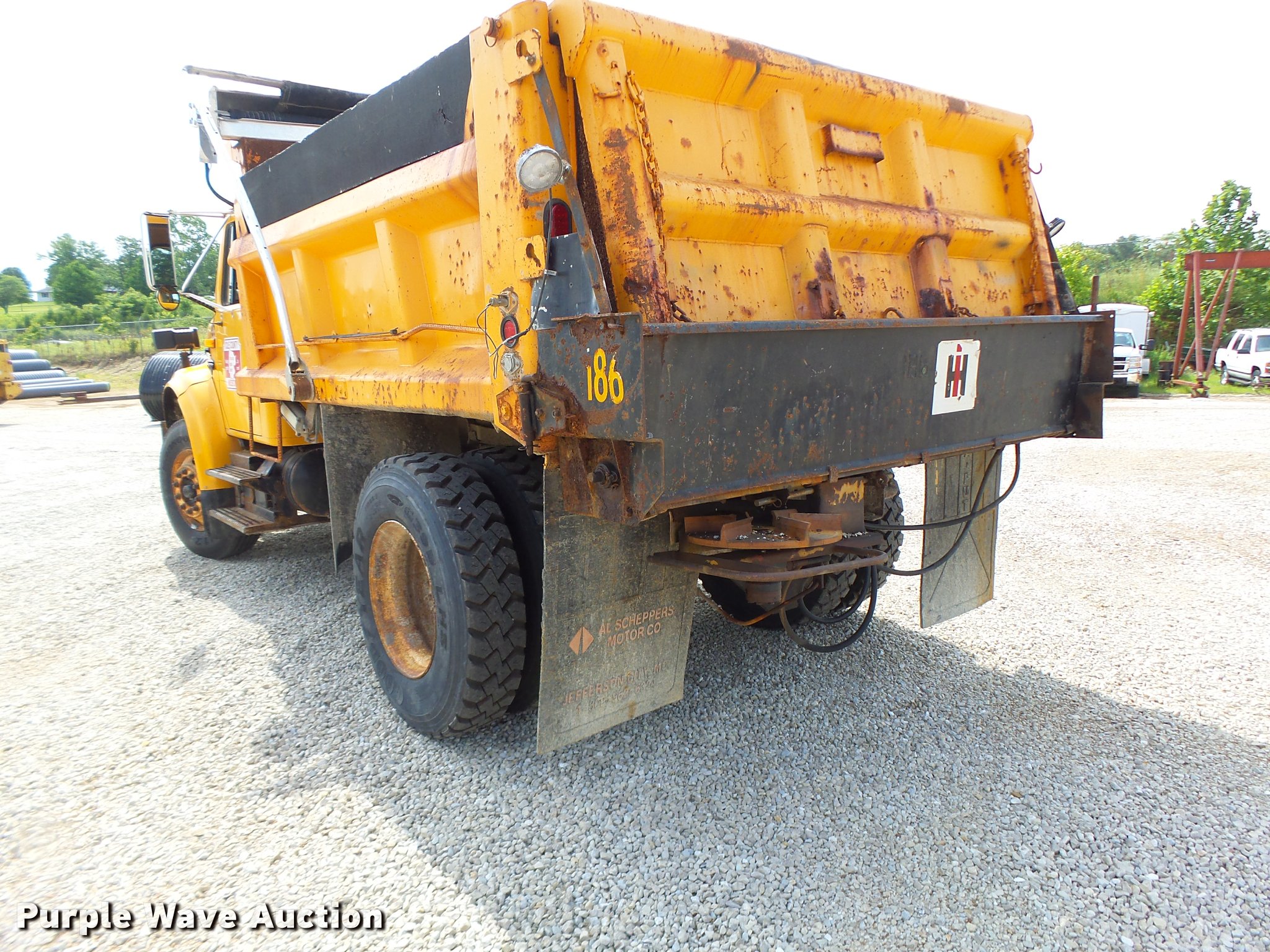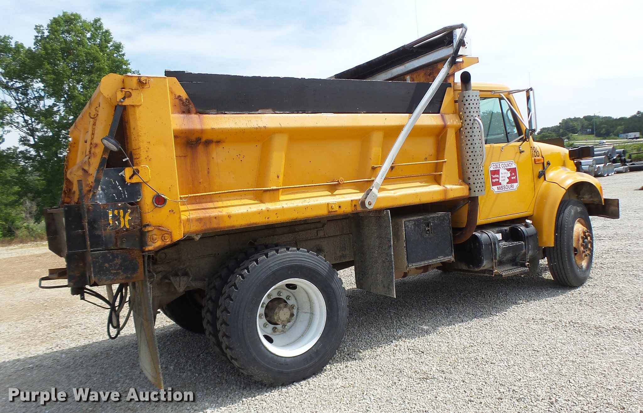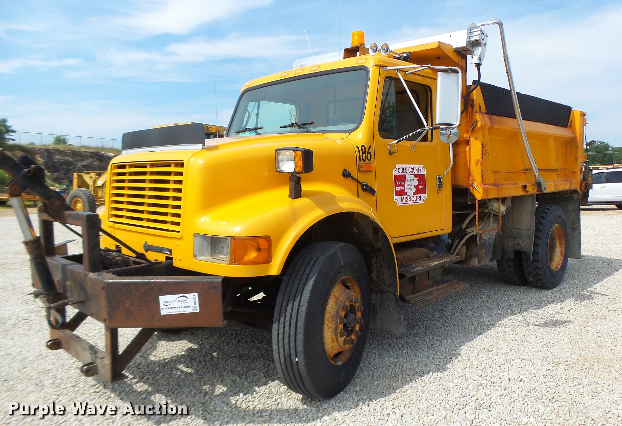 Purple Wave is selling a used Construction Dump Truck in Missouri. This item is a 2001 International 4900 dump truck with the following: 111,129 miles on odometer, International DT530 8.7L L6 turbo diesel engine, Eaton Fuller eight speed manual transmission, Single axle, AC and heat, Cruise, AM/FM/cassette, Heated mirrors, Air suspension seat, PTO, Steel dump bed, 10'L x 8'W, 32" side height, 12" side board height, Single ram hoist, Roll tarp, Hydraulic spreader wheel, Single fuel tank, Pintle hitch, Trailer wiring, Spring suspension, Air brakes, 11R22.5 tires, CB radio not included, Unit# 186