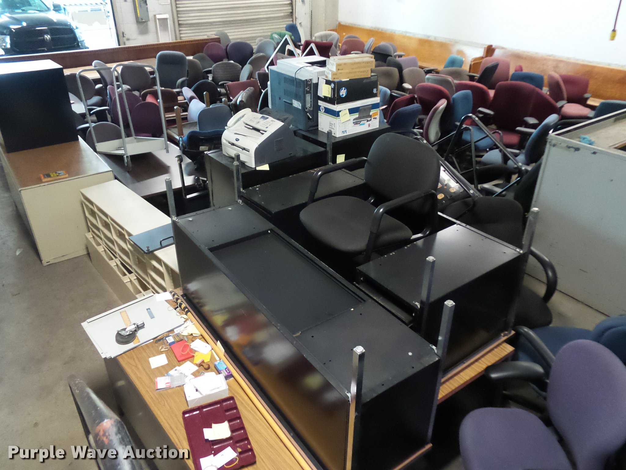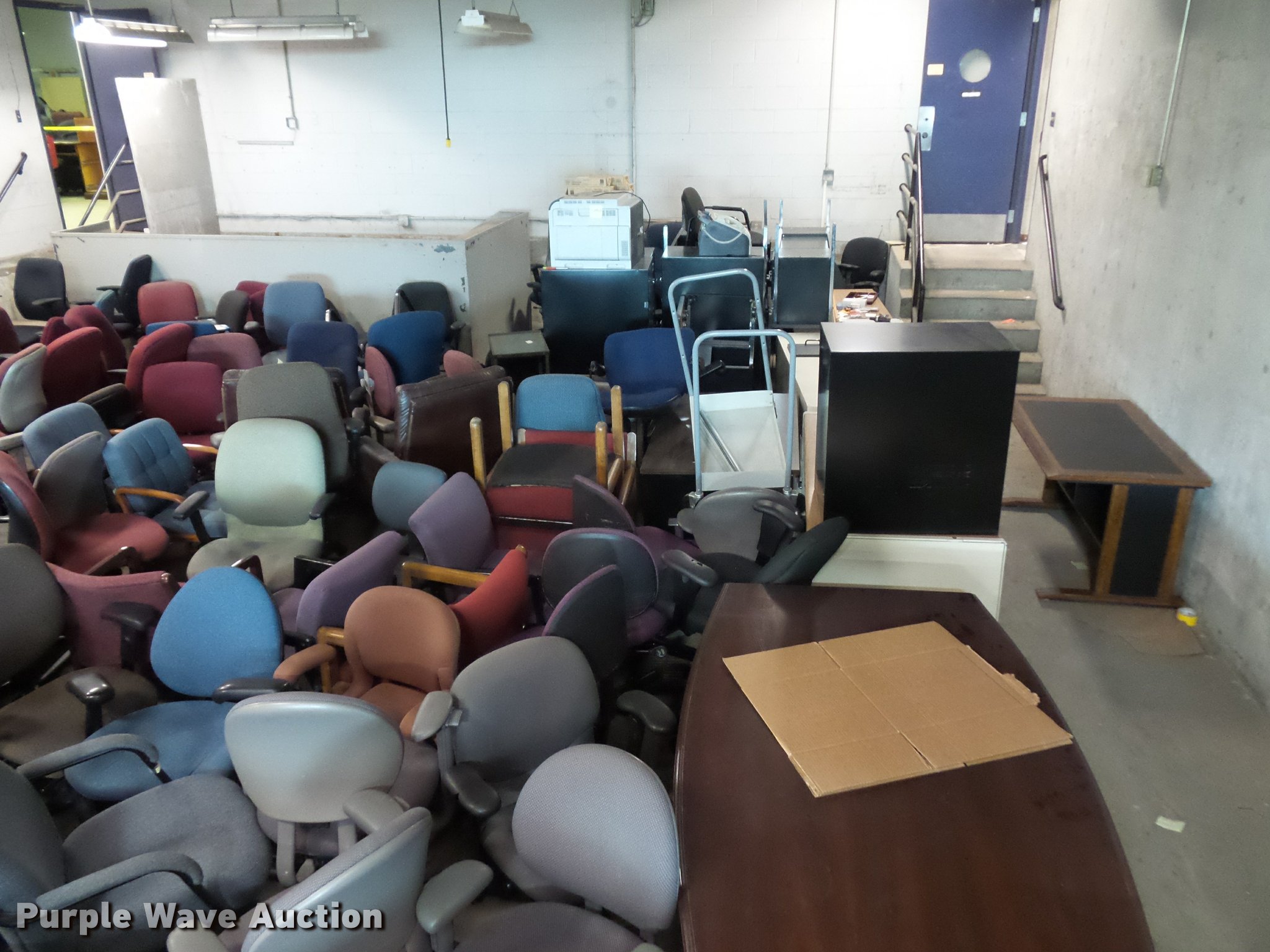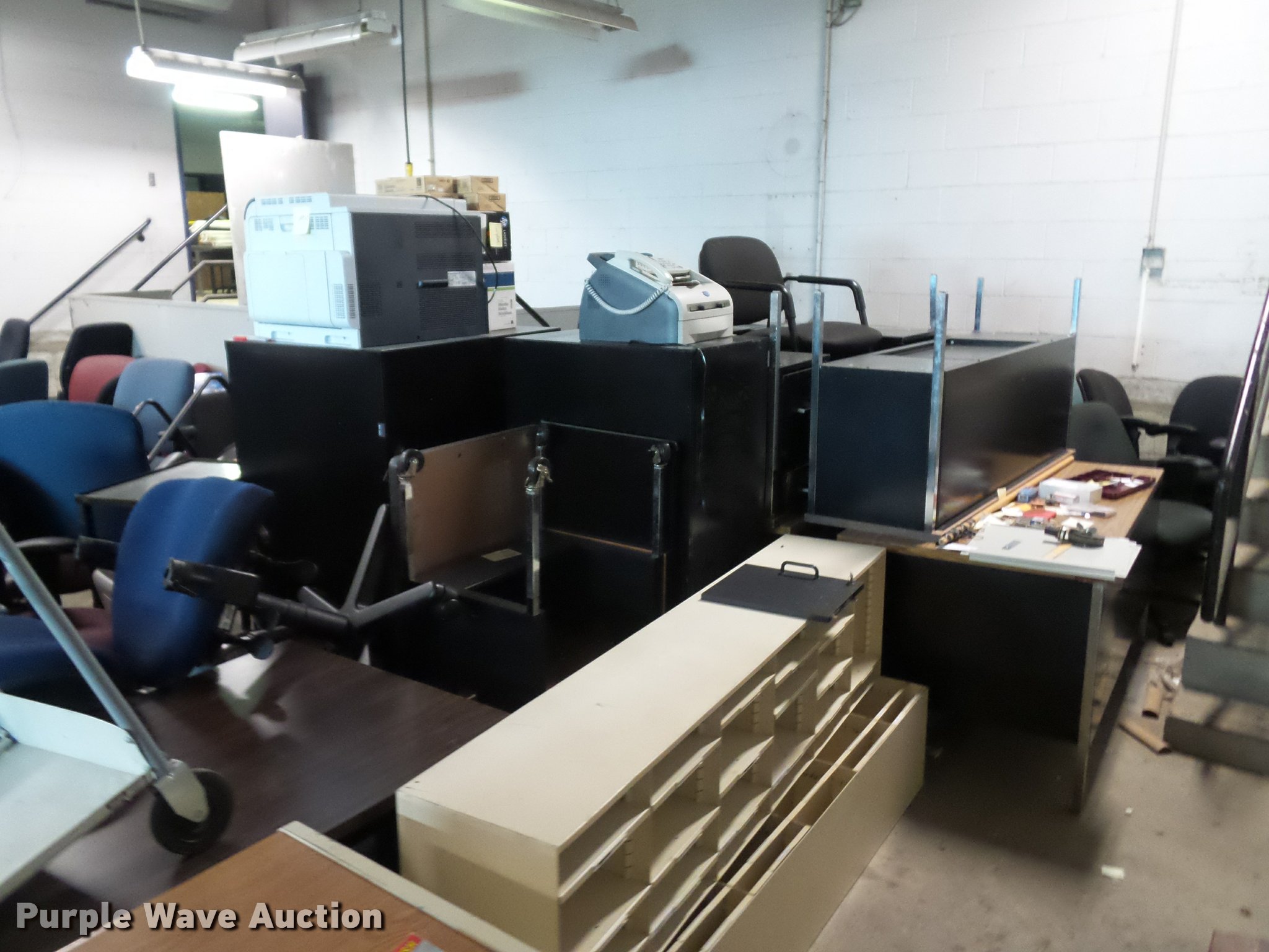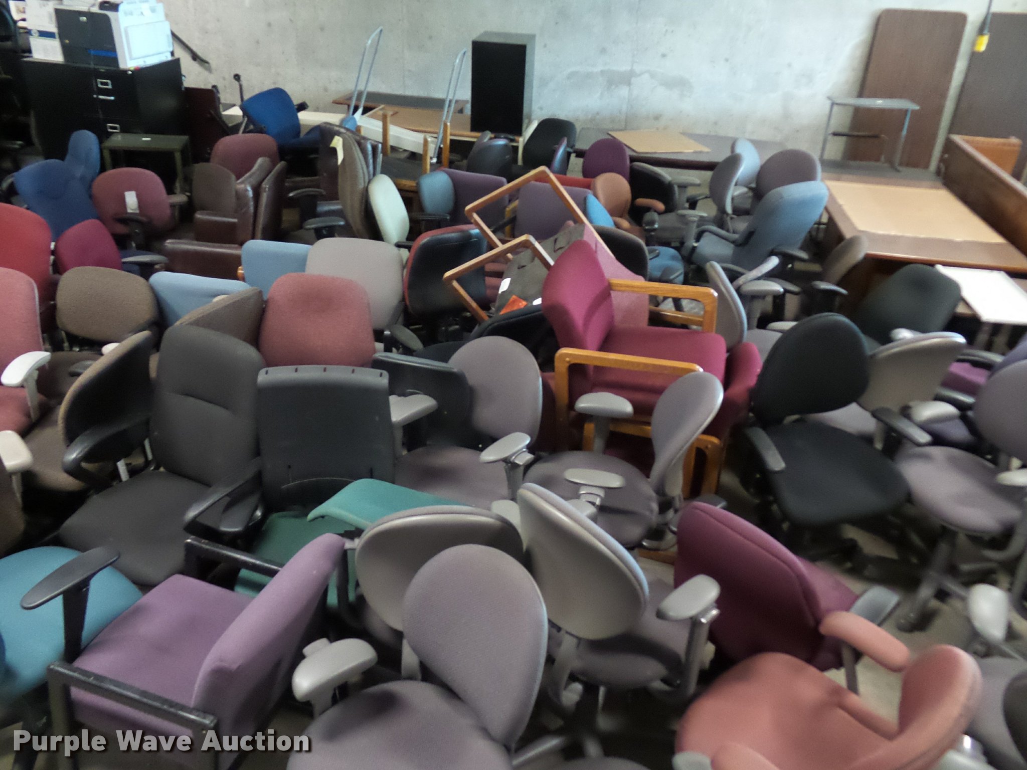 Purple Wave is selling a used Furniture in Missouri. This item is a Office furniture with the following: Benches, Approx. 75 chairs, Desks, File cabinets, Printers and more
