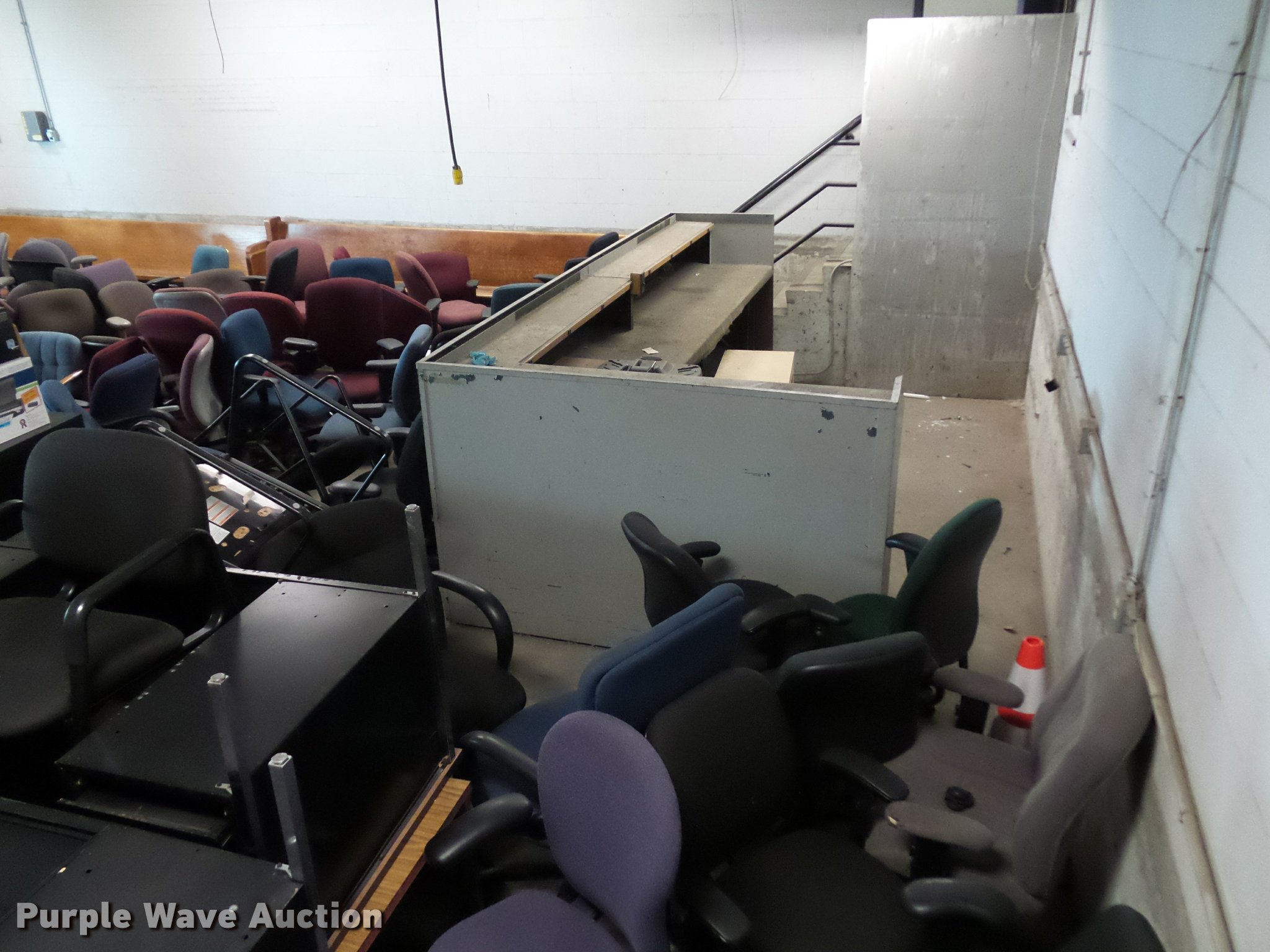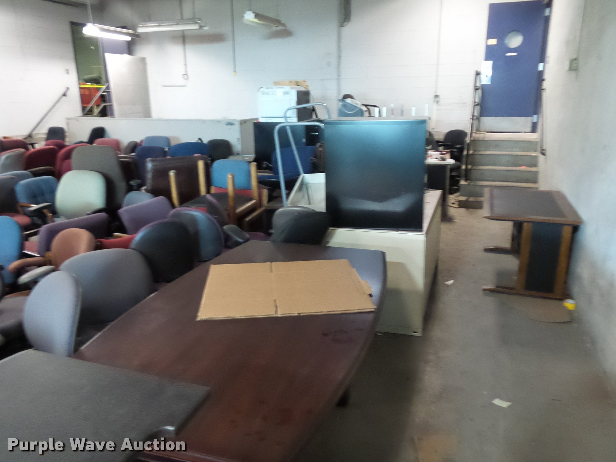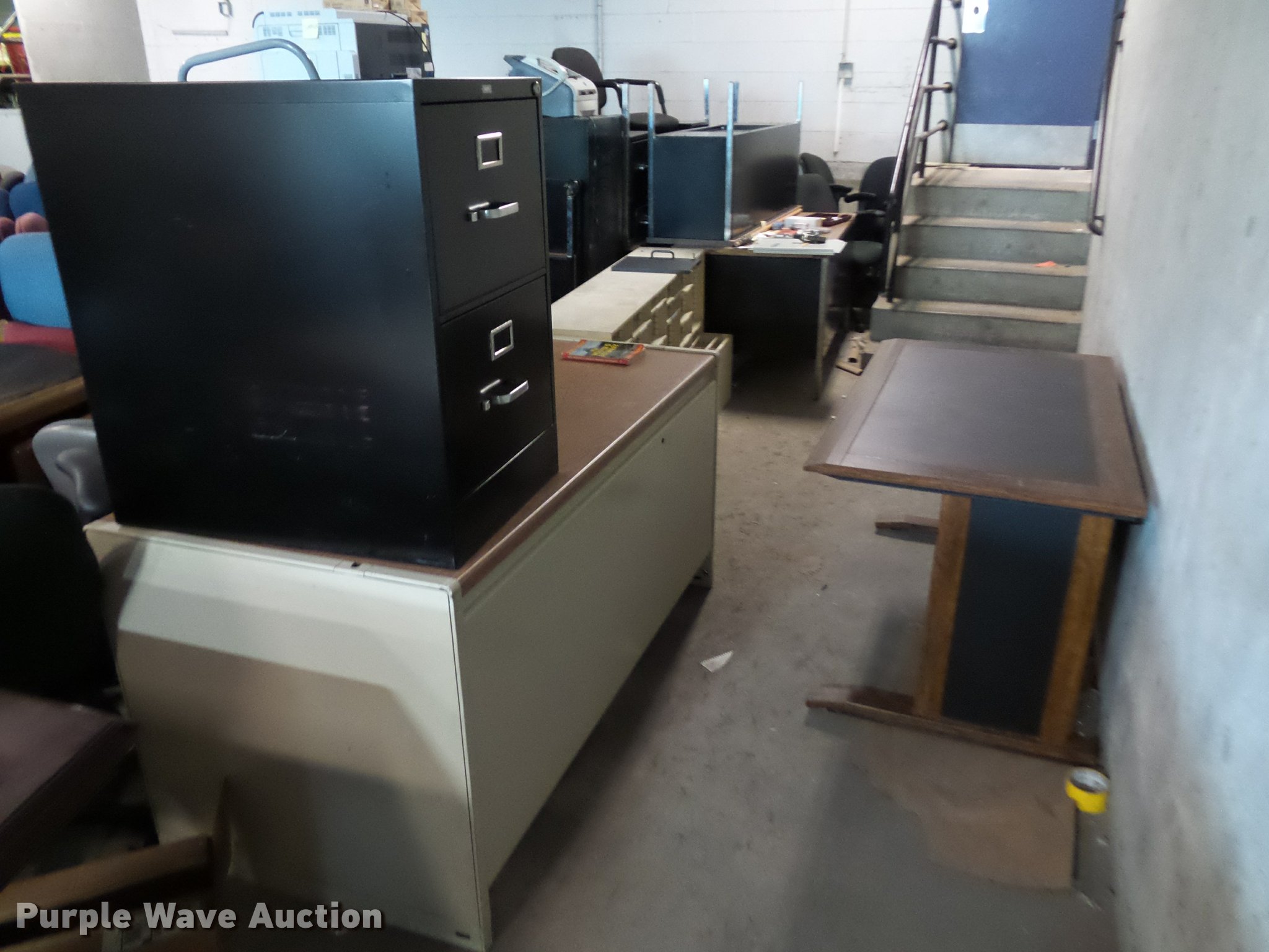Purple Wave is selling a used Furniture in Missouri. This item is a Office furniture with the following: Benches, Approx. 75 chairs, Desks, File cabinets, Printers and more