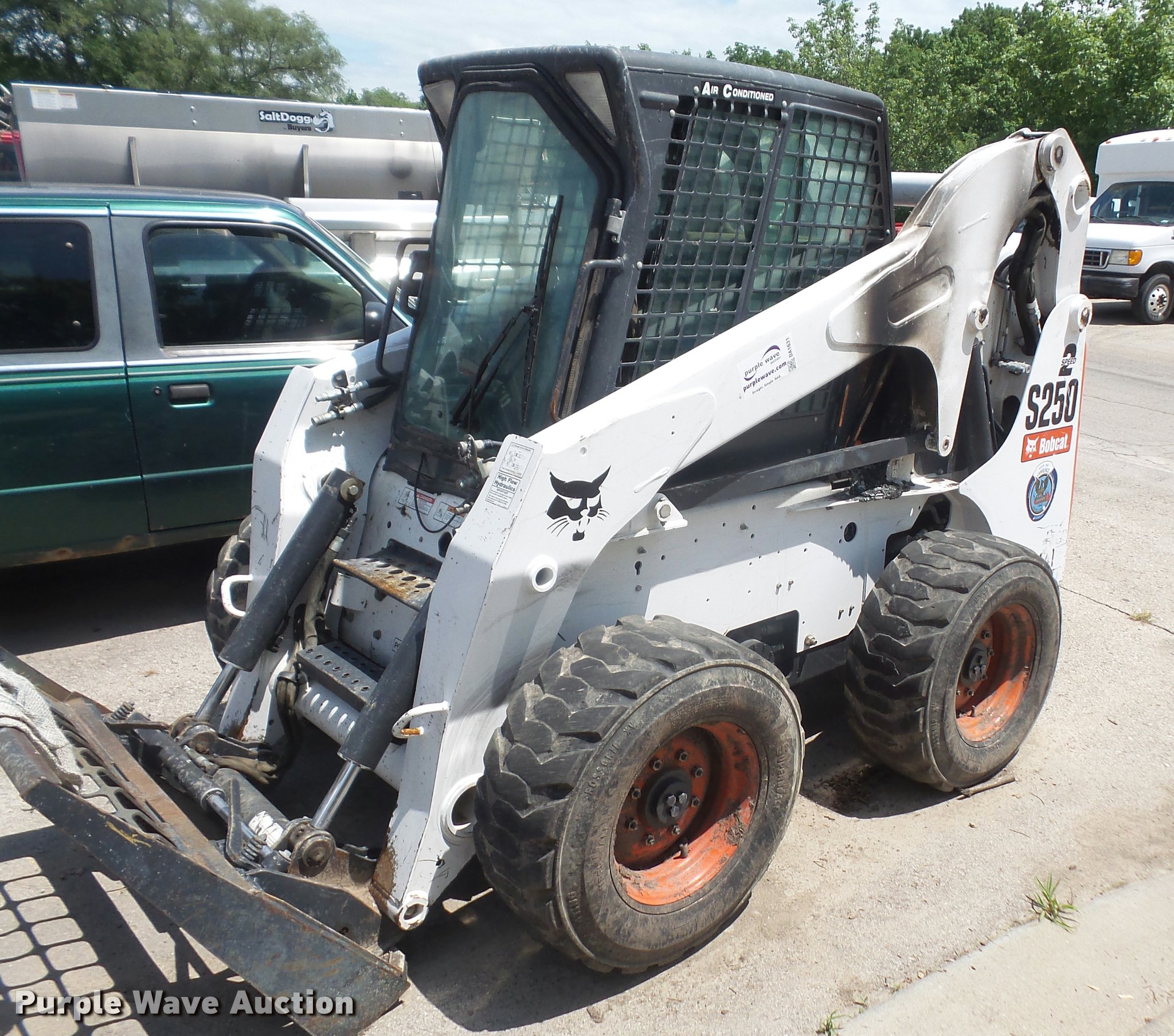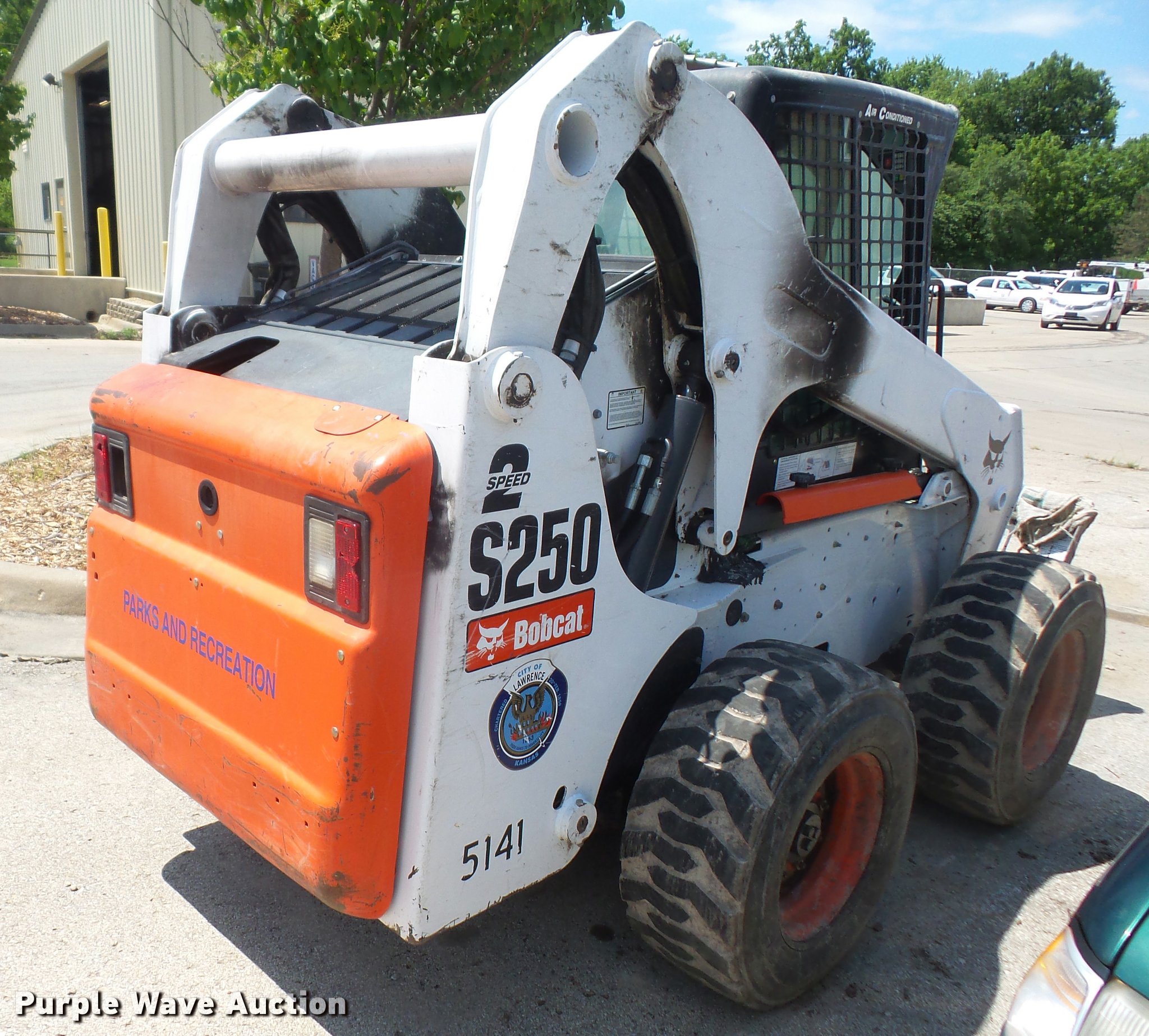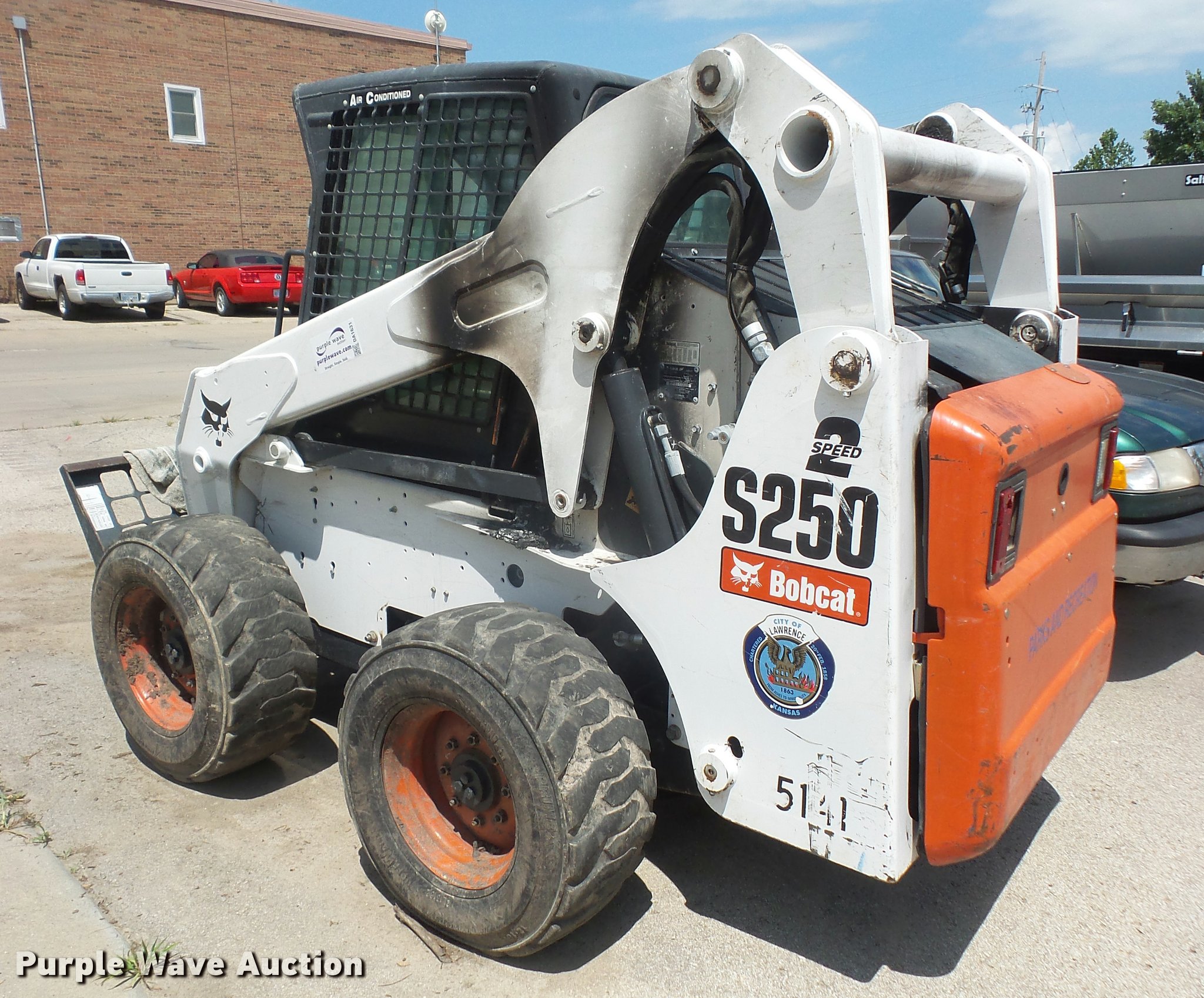 Purple Wave is selling a used Skid Steer Loader in Kansas. This item is a 2007 Bobcat S250 skid steer with the following: Approx. 2,000 hours, Turbo diesel engine, Two speed hydrostatic transmission, Auxiliary hydraulics, Power Bobtach, 12-16.5 tires, Pallet fork mount not included, Turbo locked up, Fire damage, Non-operational unit, parts only, Serial 530917451, Unit# 5141