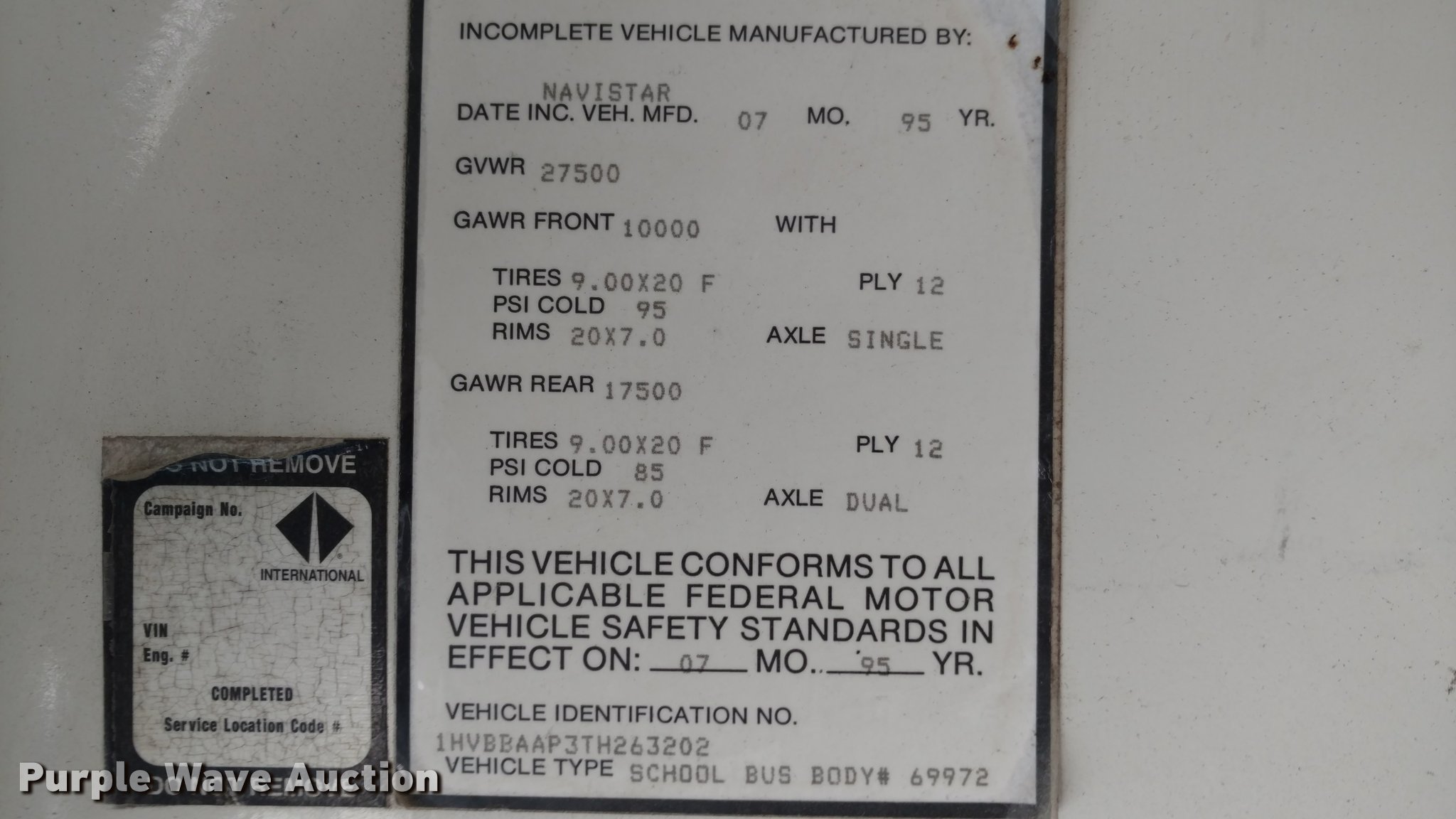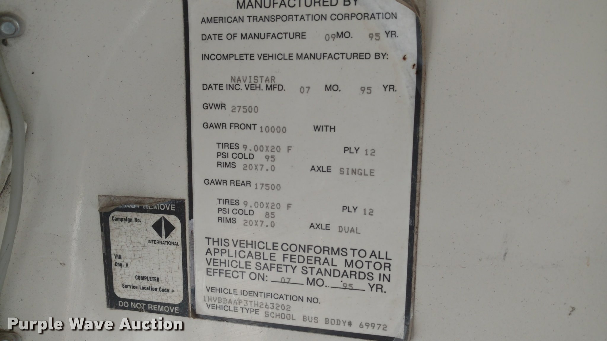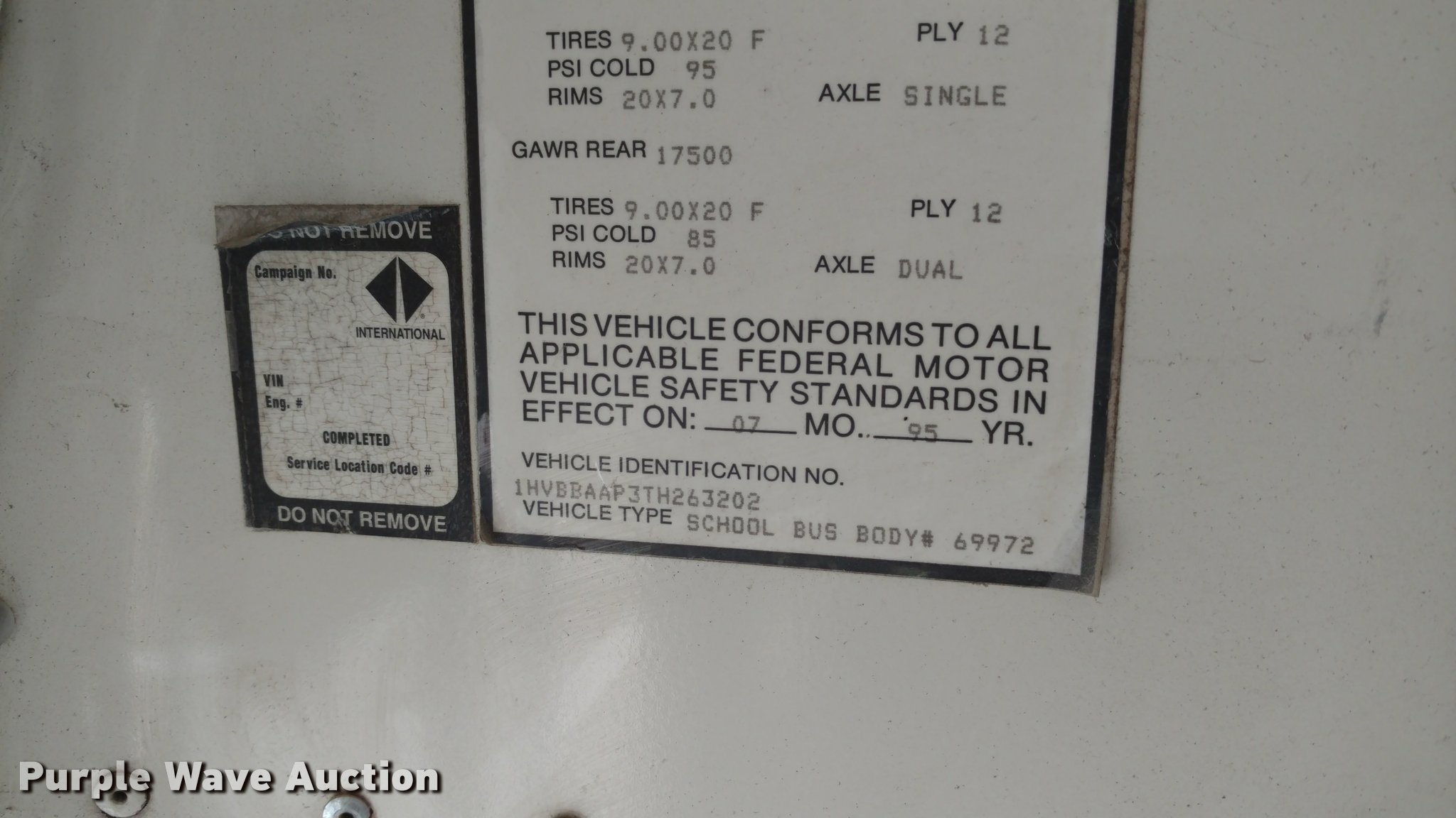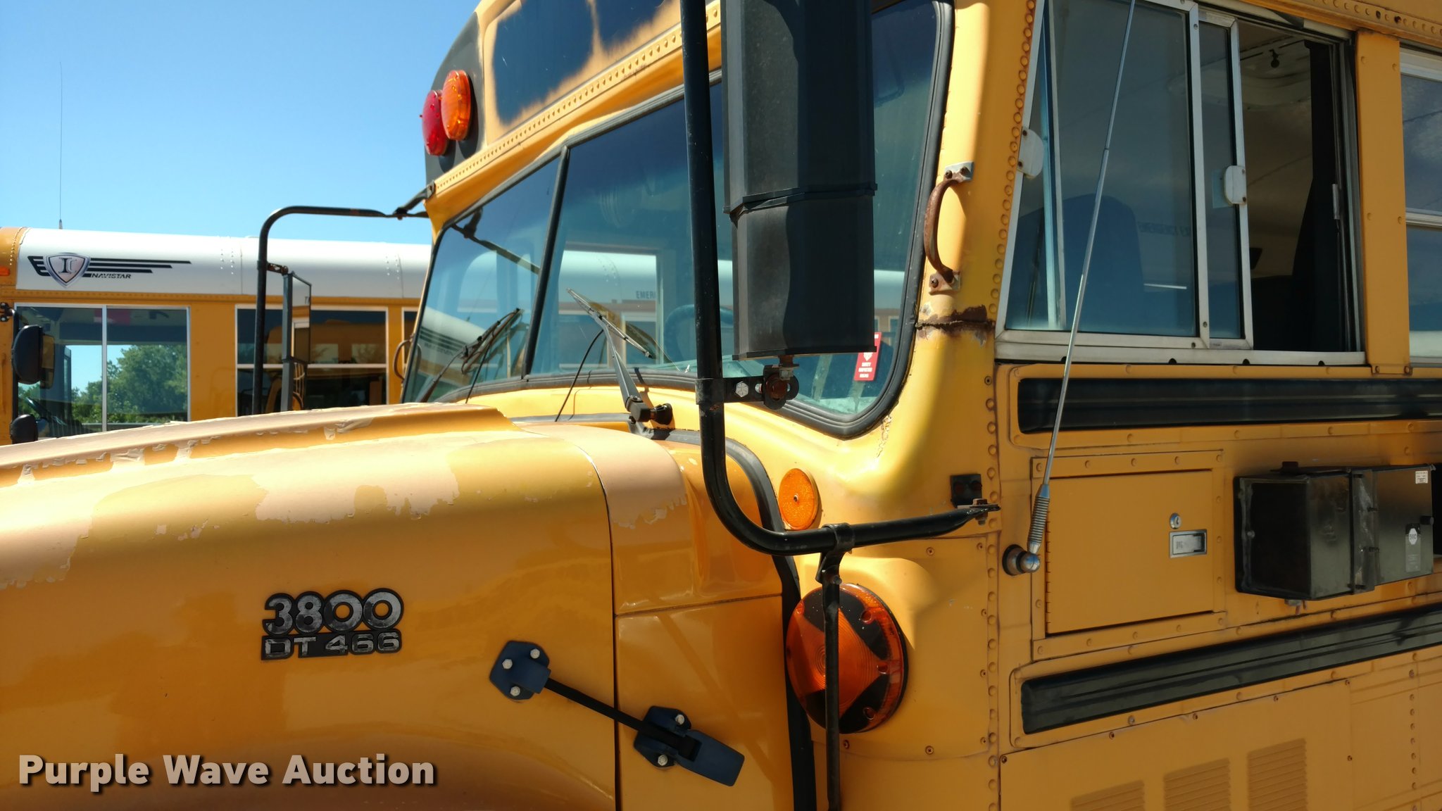 Purple Wave is selling a used Bus in Kansas. This item is a 1996 International 3800 school bus with the following: 302,799 miles on odometer, 9,114 hours on meter, International DT466 7.6L L6 diesel engine, Automatic transmission, Heat, Vinyl interior, Hydraulic brakes, 10R22.5 tires, Vehicle needs battery, Unit# 952