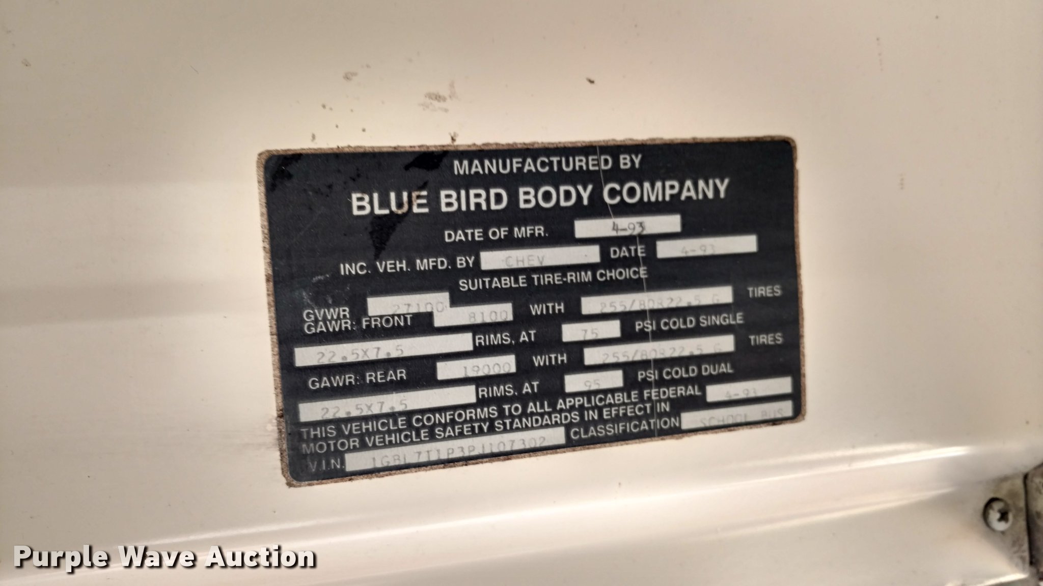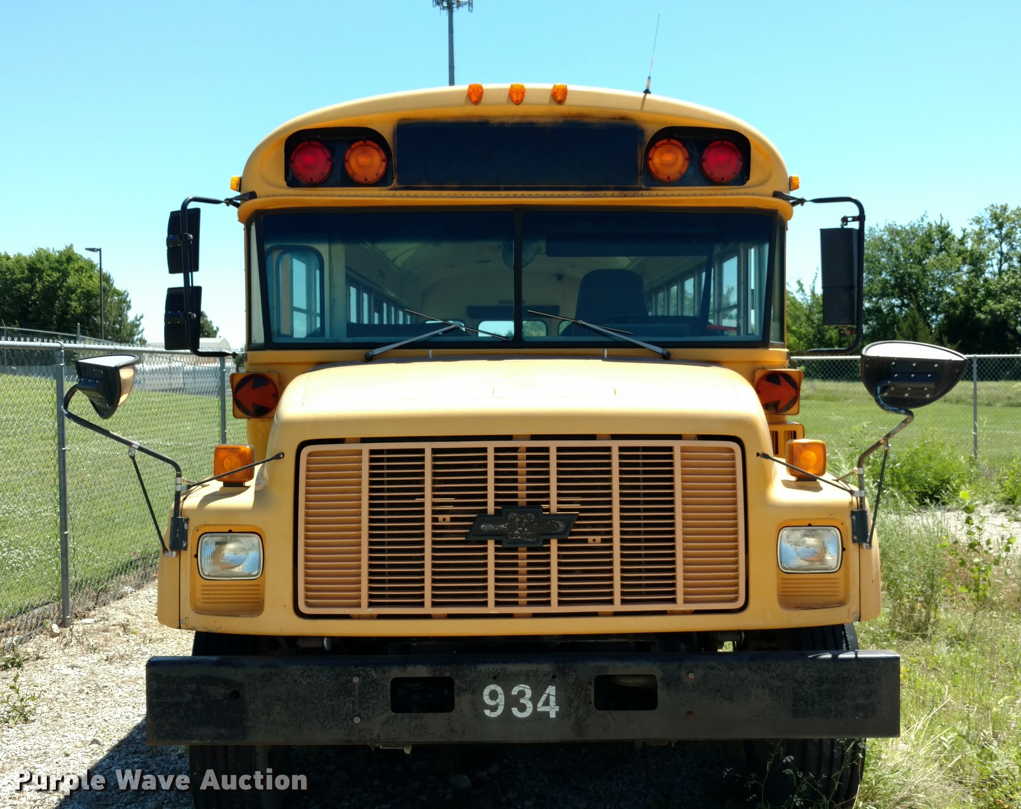 Purple Wave is selling a used Bus in Kansas. This item is a 1993 Chevrolet B7 school bus with the following: 172,185 miles on odometer, 6.0L V8 gas engine, Automatic transmission, Heat, Vinyl interior, 265/75R22.5 tires, Vehicle needs battery, Unit# 934