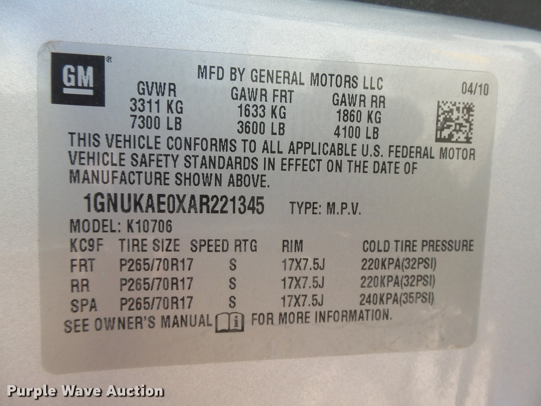 Purple Wave is selling a used Passenger Vehicle in Kansas. This item is a 2010 Chevrolet Tahoe SUV with the following: 118,347 miles on odometer, 5.3L V8 OHV 16V FFV gas engine, Automatic transmission, Four wheel drive, AC and heat, Tilt, Cruise, AM/FM/CD, Power windows, locks, mirrors, and seats, Cloth front interior, Vinyl rear interior, Spotlight, Fog lights, Running boards, Receiver hitch, Trailer wiring, LT265/70R17 tires, Gas cap door sprung, Service records available upon request