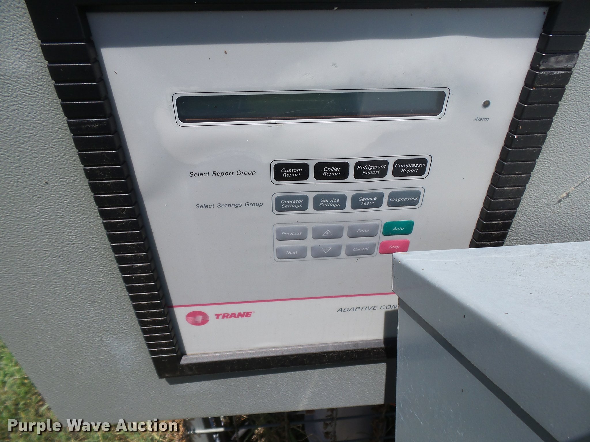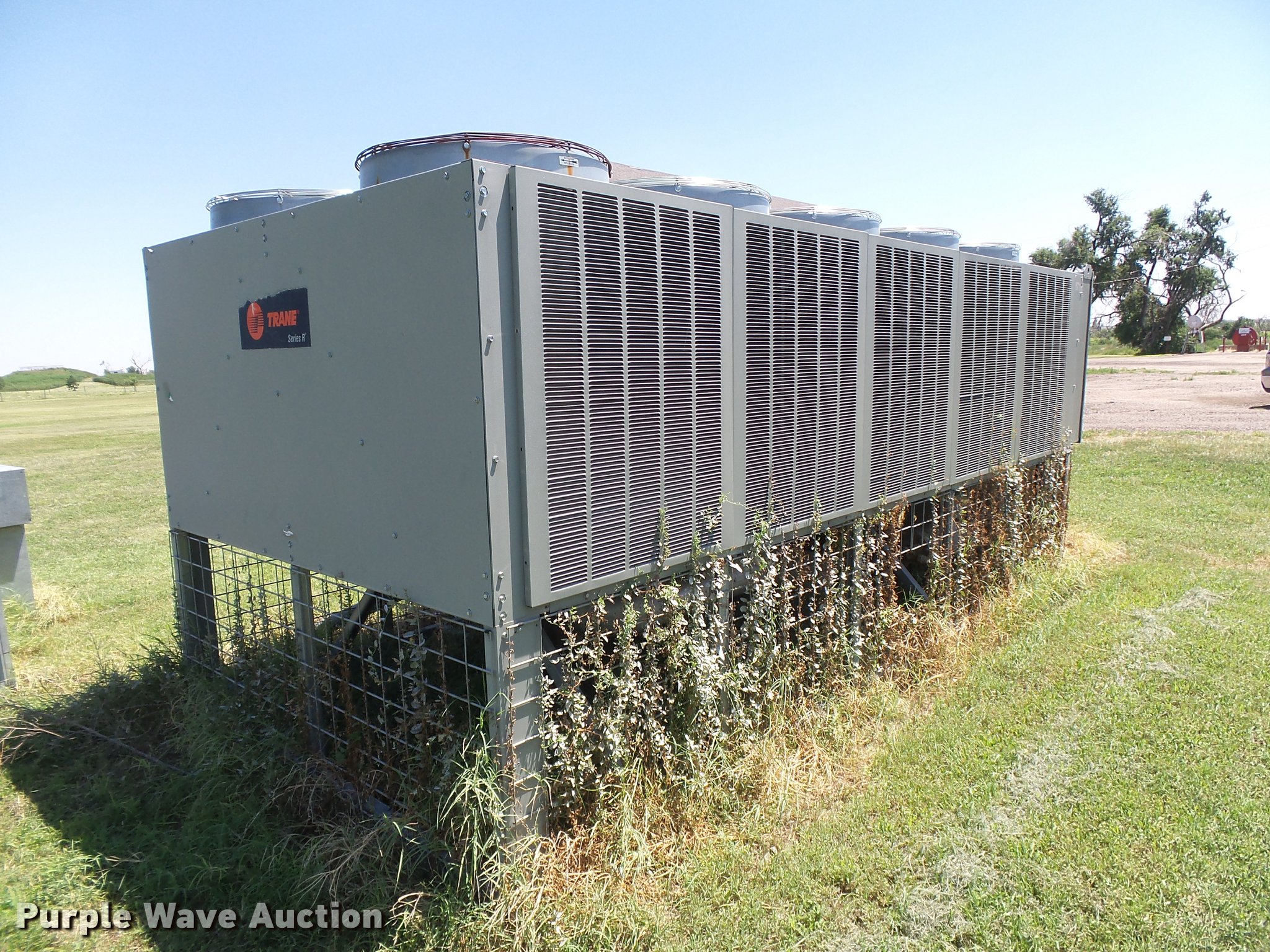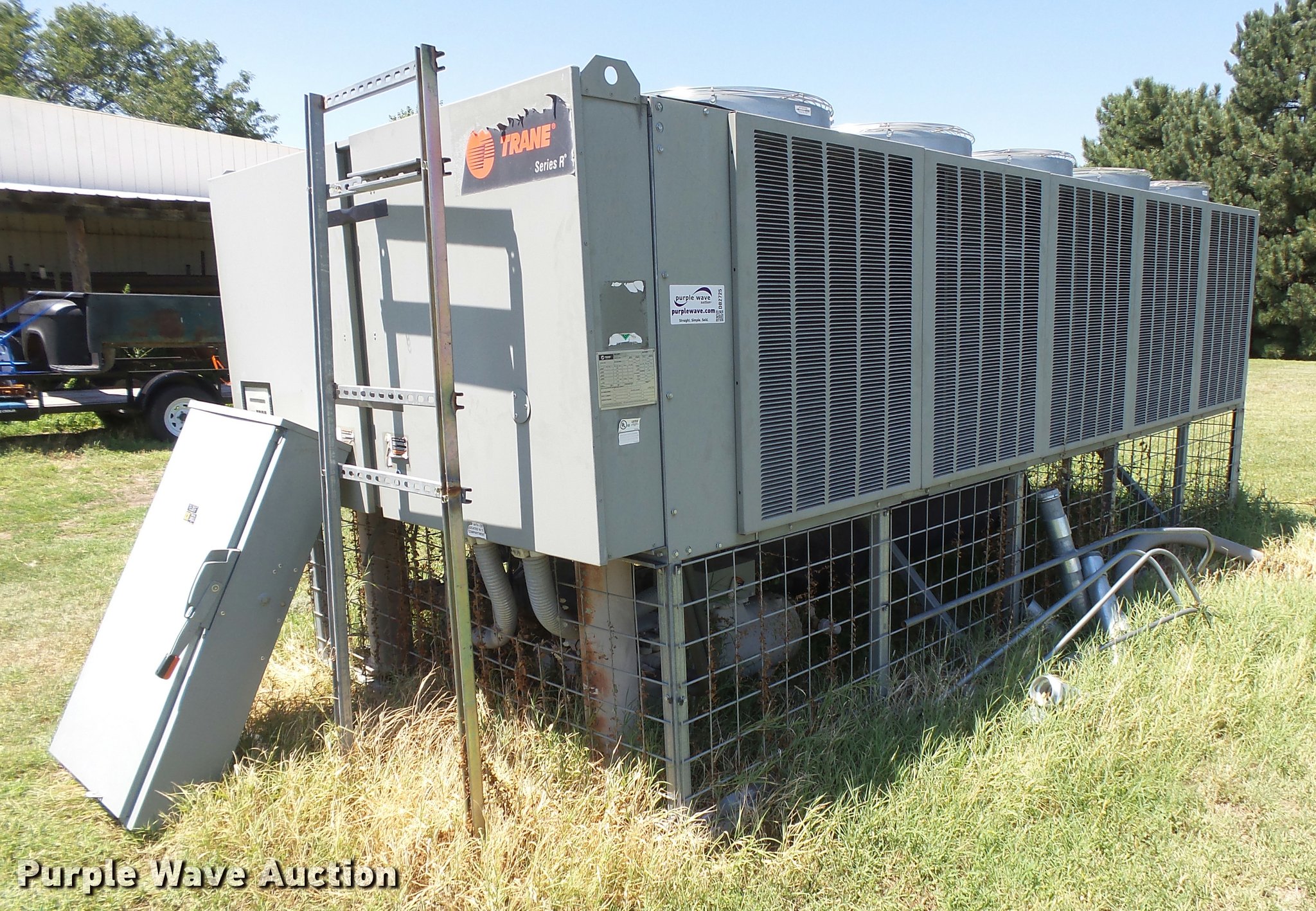 Purple Wave is selling a used Appliances in Kansas. This item is a Trane Series R two pipe AC chiller unit with the following: Model RTAA100AYQ01A3D0BKM2, 17'L x 90"W x 7'H, 200V, Three phase, Adaptive control panel, Breaker box, Splitter, Coil unit, Serial U04E05959