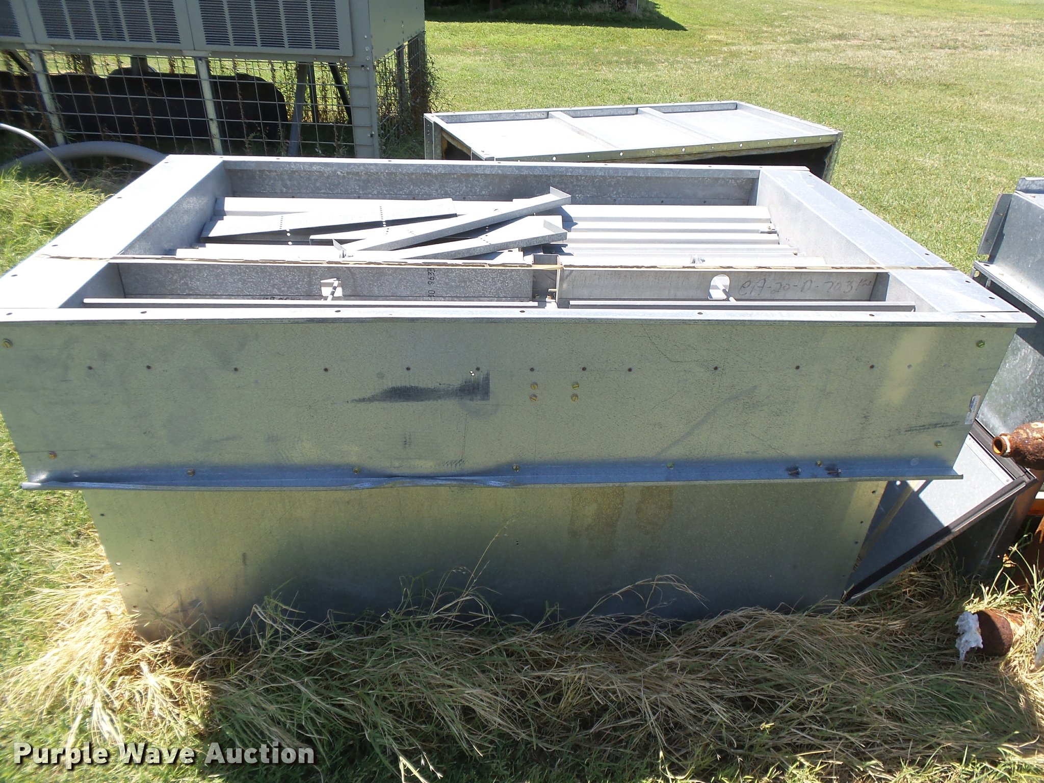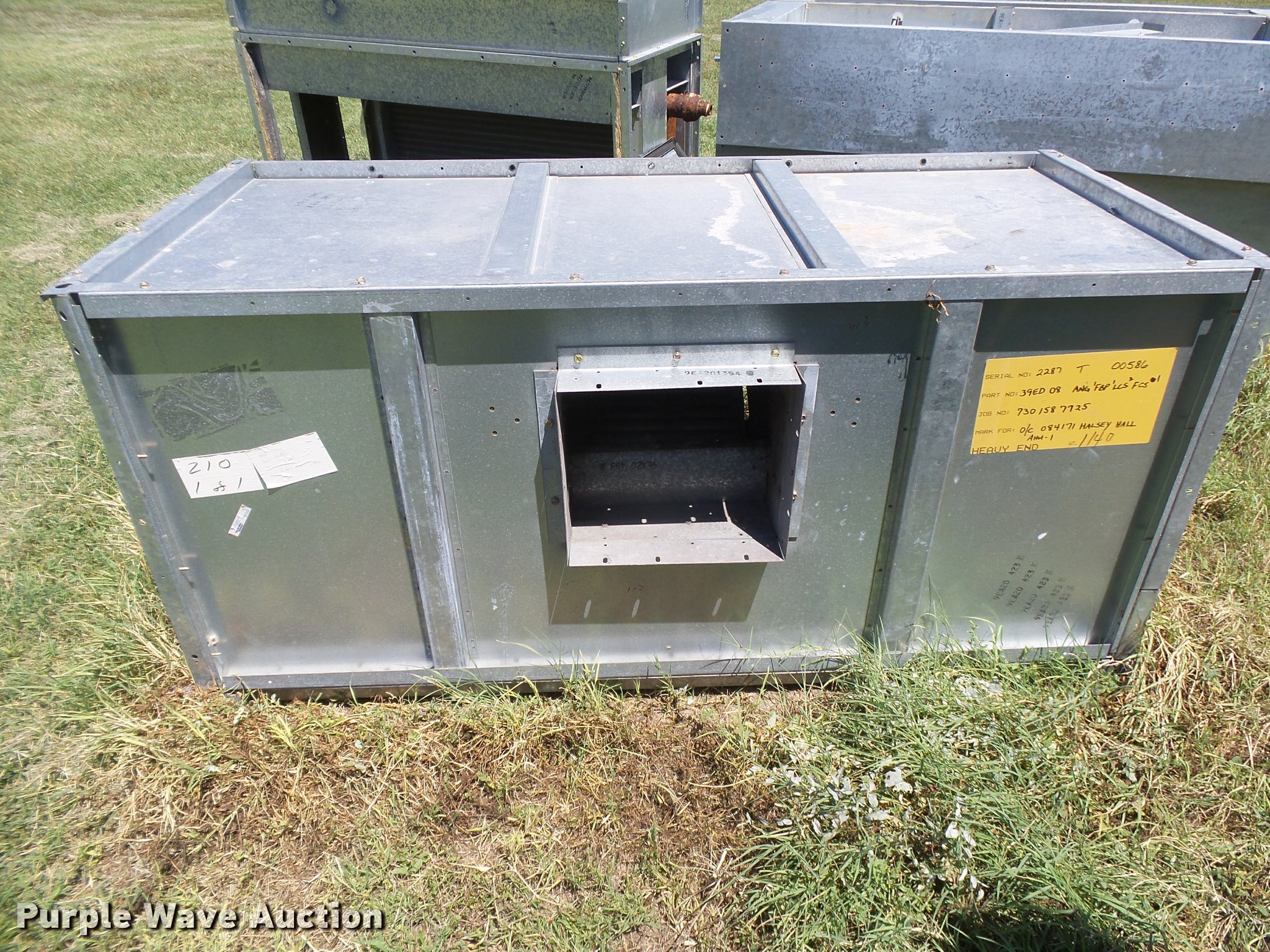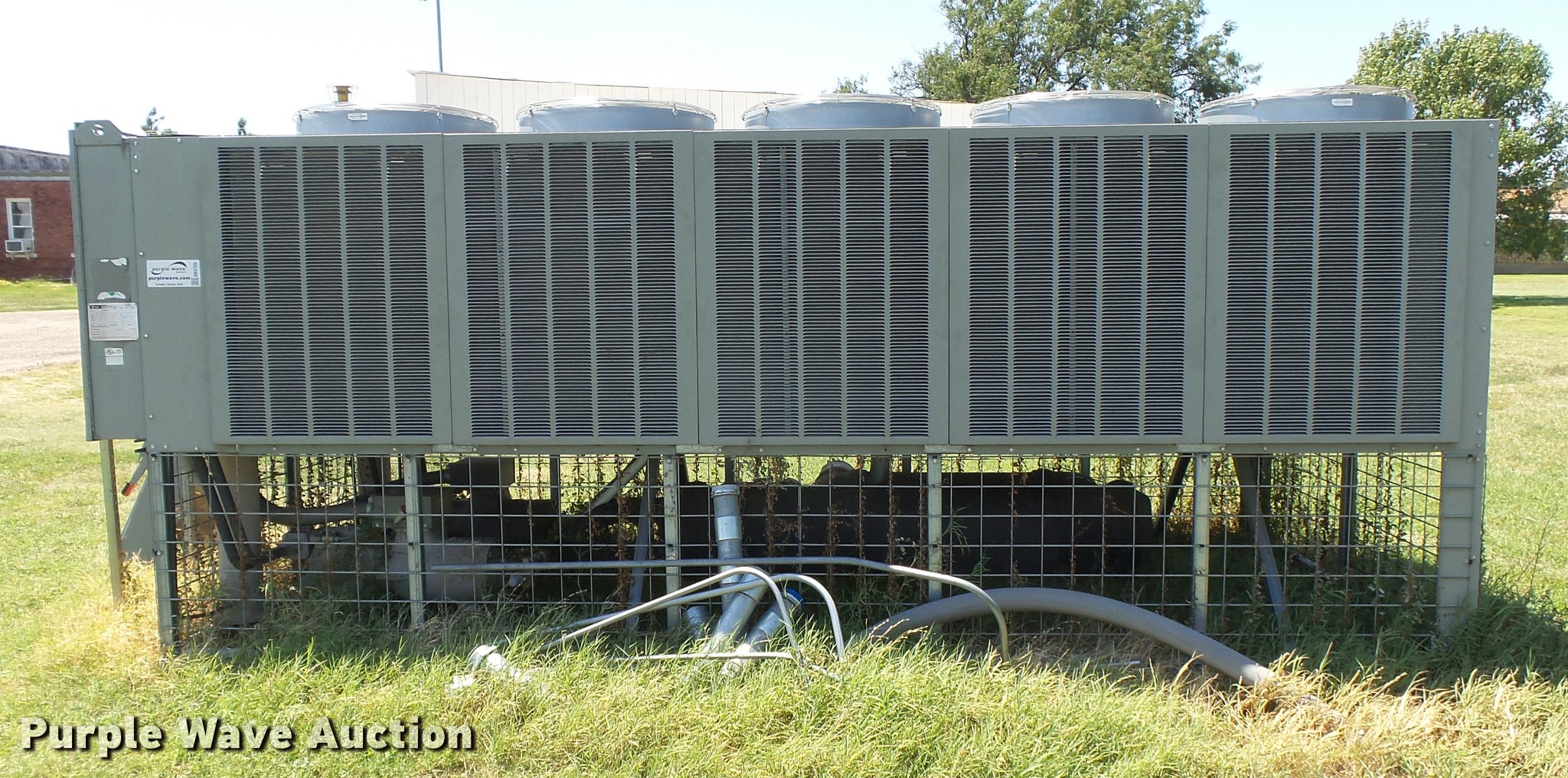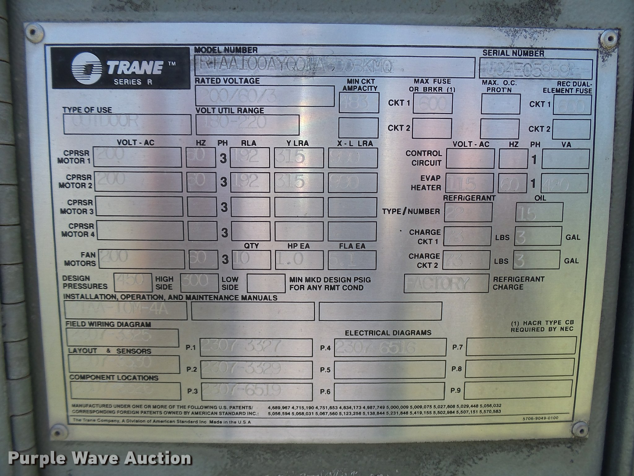 Purple Wave is selling a used Appliances in Kansas. This item is a Trane Series R two pipe AC chiller unit with the following: Model RTAA100AYQ01A3D0BKM2, 17'L x 90"W x 7'H, 200V, Three phase, Adaptive control panel, Breaker box, Splitter, Coil unit, Serial U04E05959