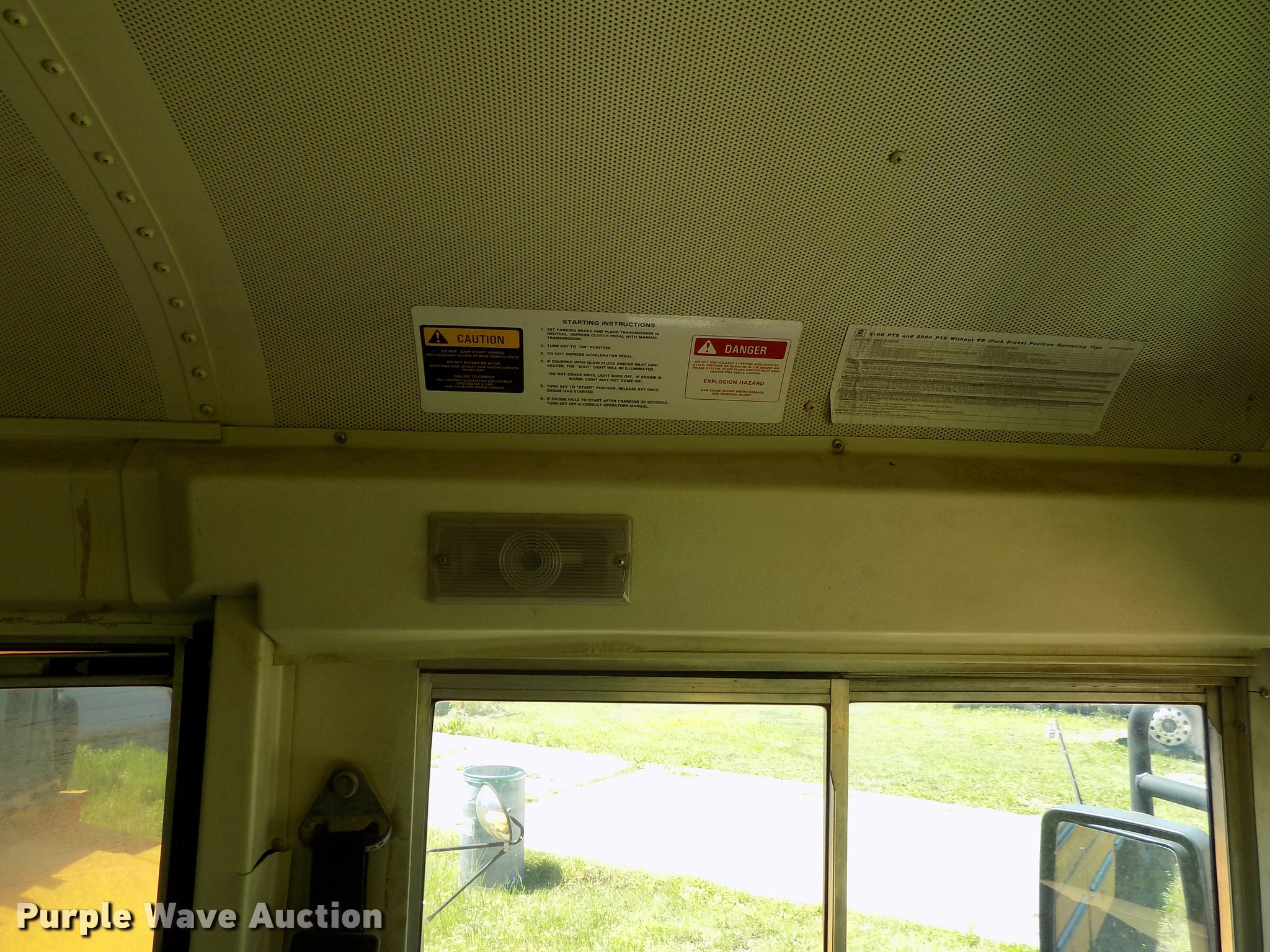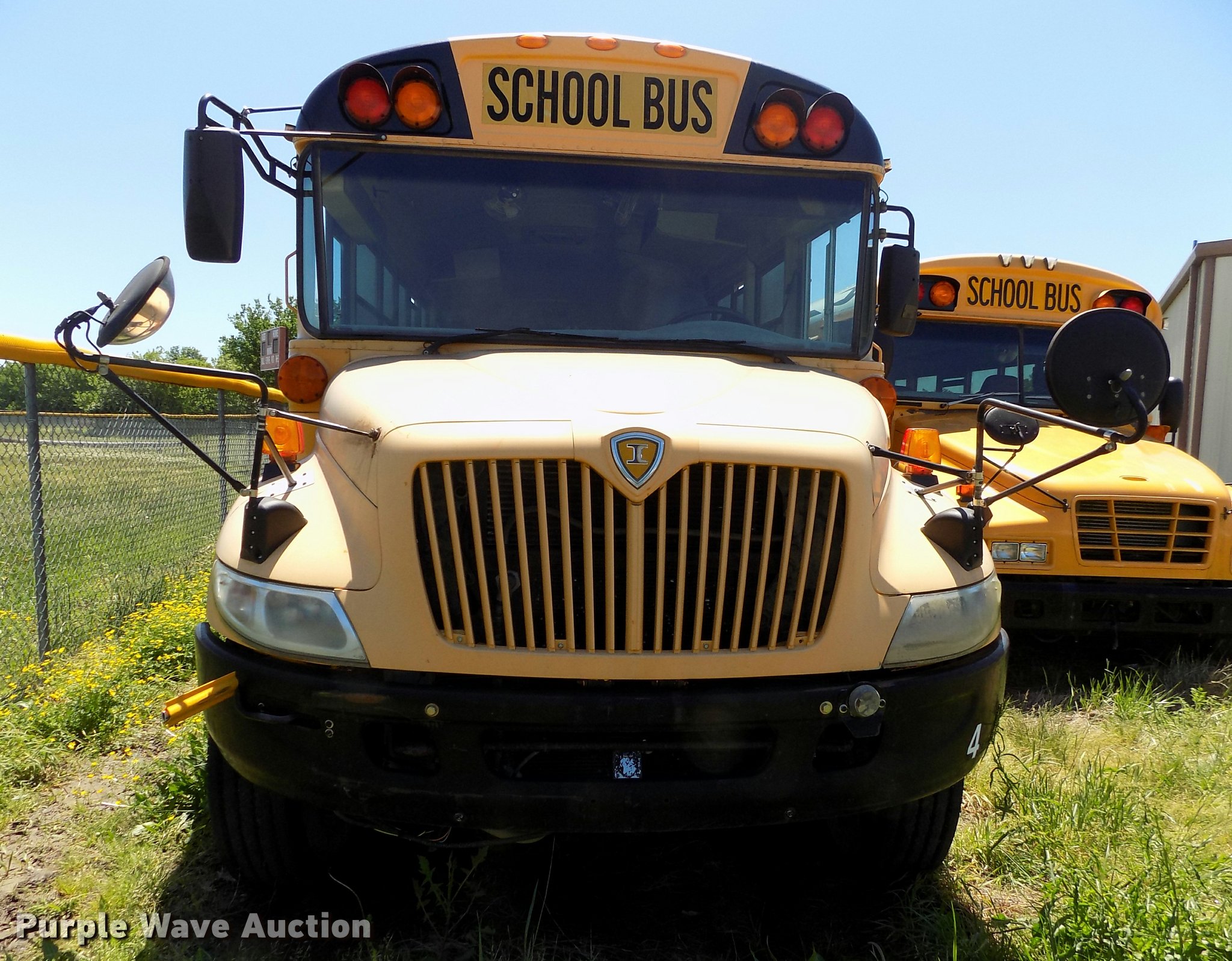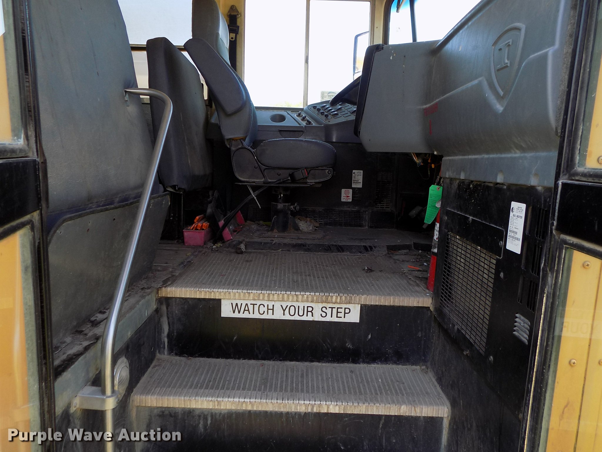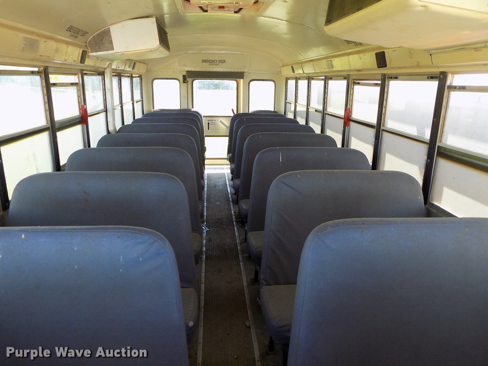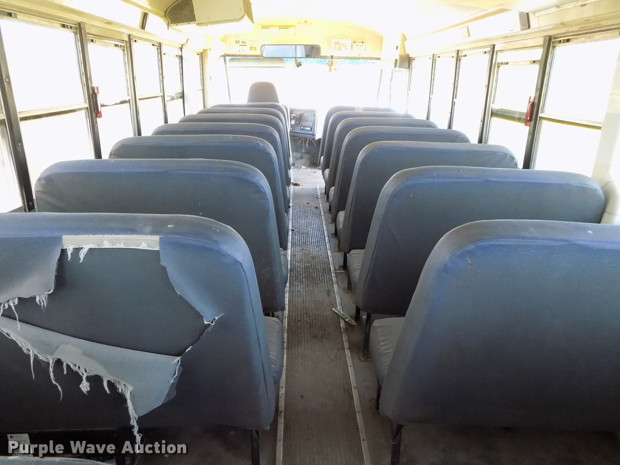 Purple Wave is selling a used Bus in Oklahoma. This item is a 2007 International CE school bus with the following: Approx. 125,000 miles, International VT365 6.0L V8 turbo diesel engine, Automatic transmission, Single axle, AC and heat, AM/FM/CD, Heated mirrors, Cloth driver interior, Vinyl passenger interior, Electric passenger sliding door, Block heater, 47 passenger capacity, Ceiling, rear, and side emergency exits, Emergency door alarms, Lighted stop sign, Crossing arm rod, Trans Air AC roof unit, Front and rear tow hooks, Hydraulic suspension, 238" wheelbase, 11R22.5 tires, GVWR 27,500 lbs, Seat damage, Unit# 4
