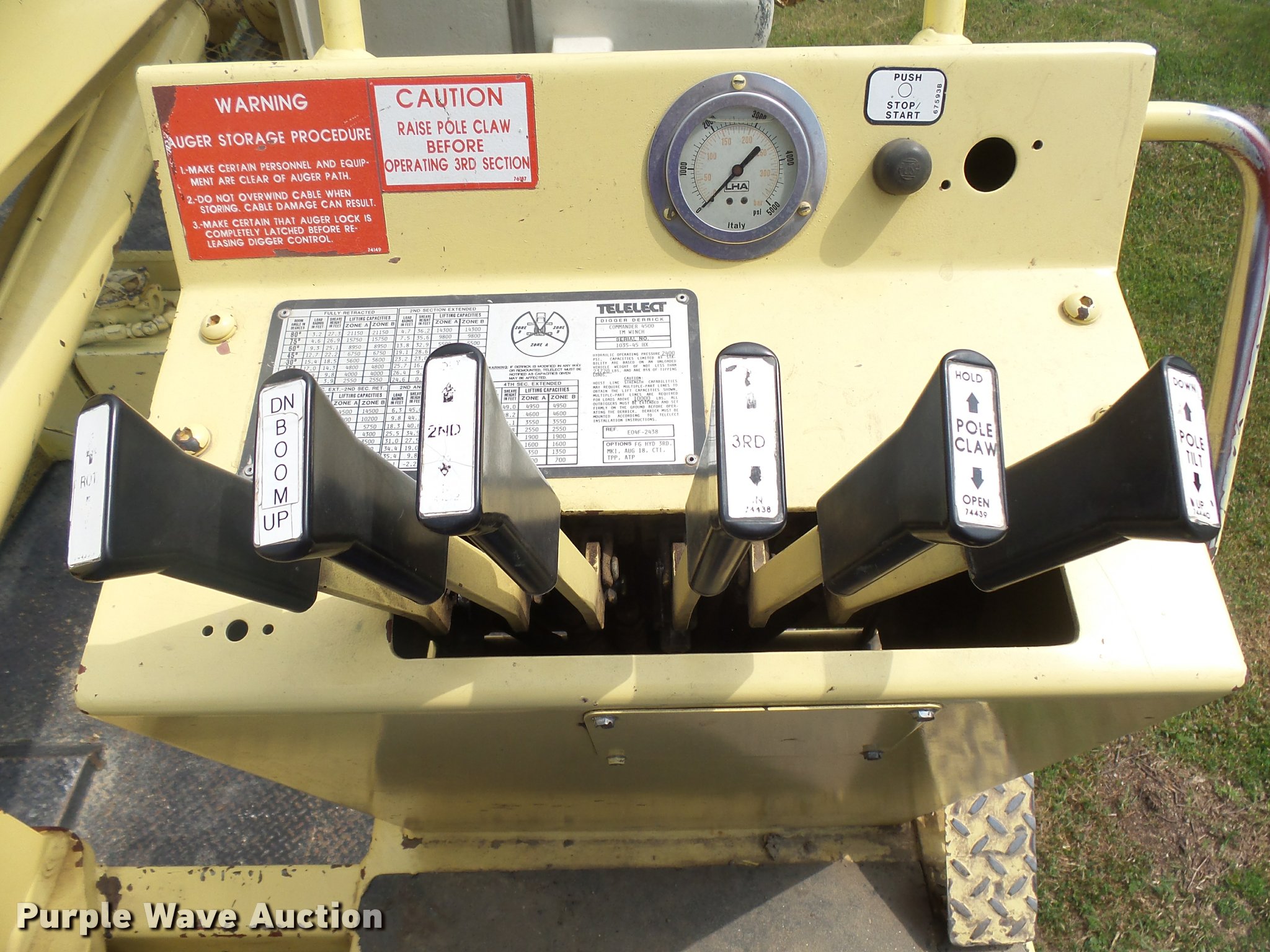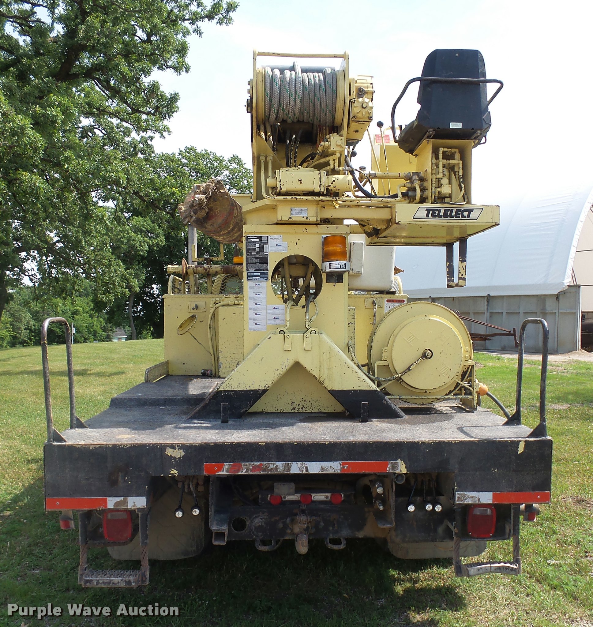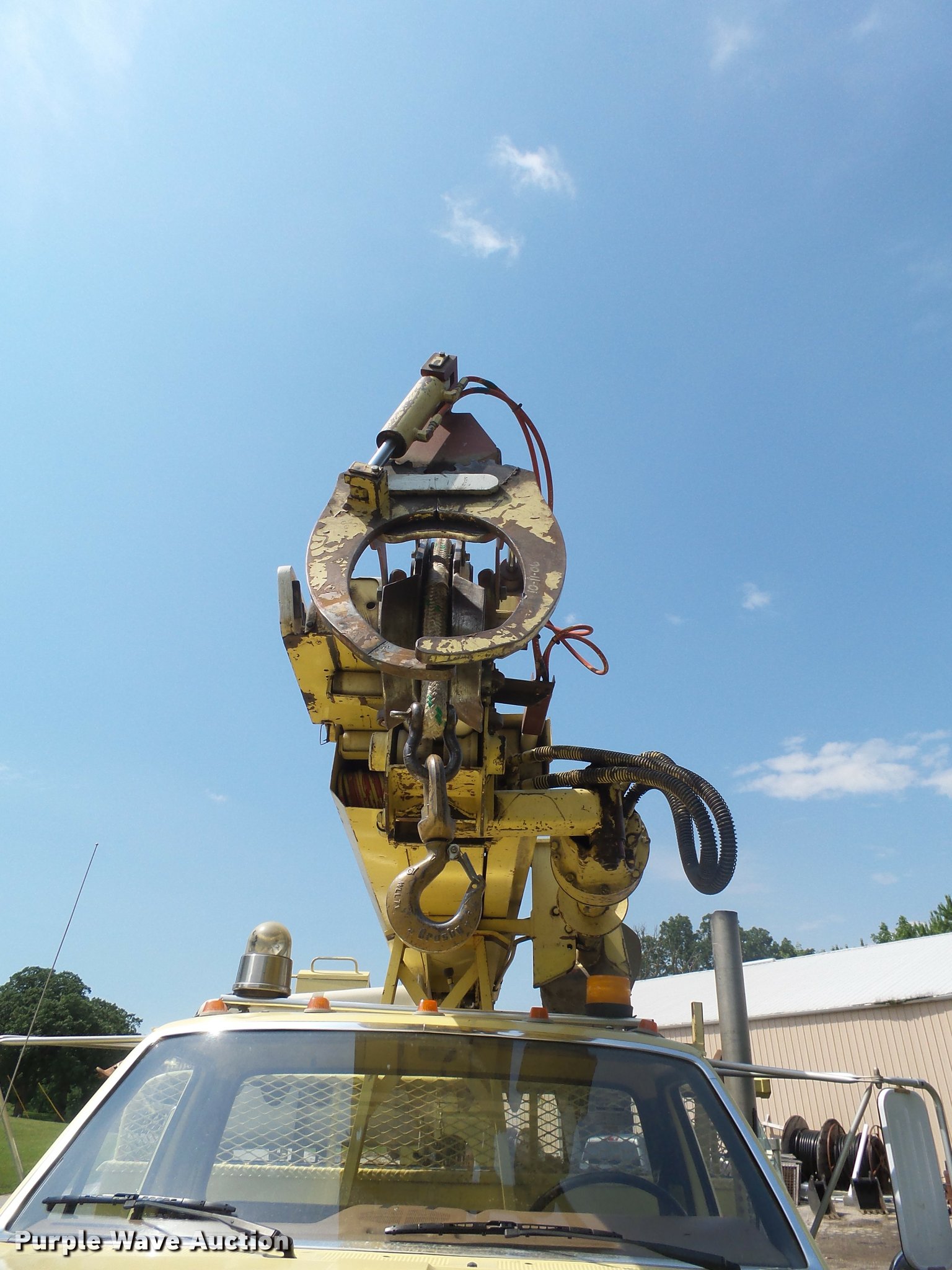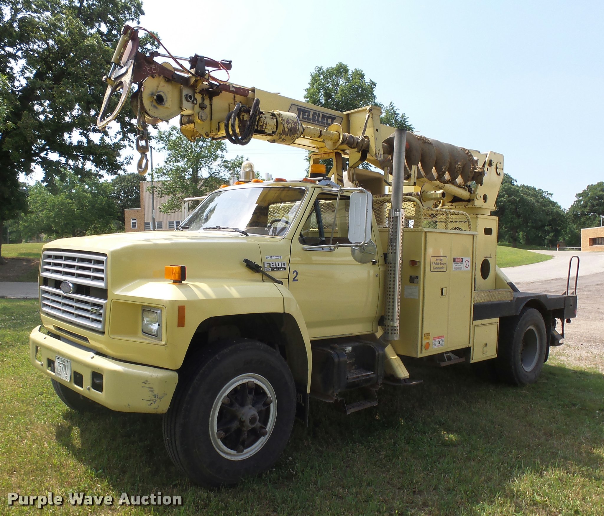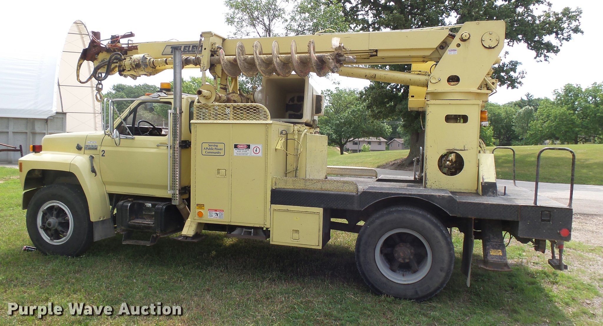 Purple Wave is selling a used Digger Derrick Truck in Iowa. This item is a 1990 Ford F800 digger derrick truck with the following: 42,724 miles on odometer, 3,723 hours on meter, 7.8L L6 diesel engine, Allison automatic transmission, Single axle, Heat, AM/FM, Spring suspension seat, Auxiliary controls, Beacon light, Backup alarm, Block heater, Front tow hooks, Service bed, 118"L x 93"W, Shelving, Slide-out drawers, Utility rack, Telelect Commander boom, Boom tip basket, Platform controls, Turret winch, Boom rotation, Pole guide, 8" auger, 18" auger, Rope material handler, Outriggers, Serial 1035-45HX, Certification valid through November 2015, Capstan hoist motor, Grounding cable, Single exhaust stack, Dual fuel tanks, Spring suspension, Pintle hitch, Trailer wiring, Hydraulic brakes, Samson 11R22.5 front tires, 10.00R20 rear tires