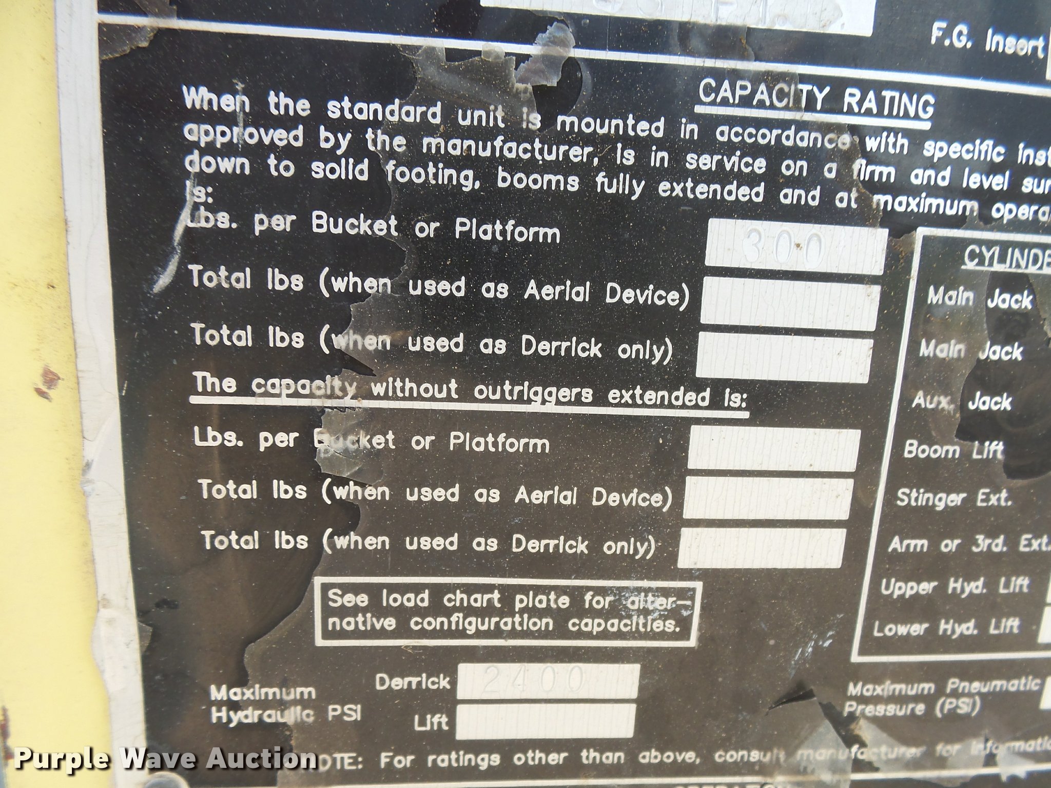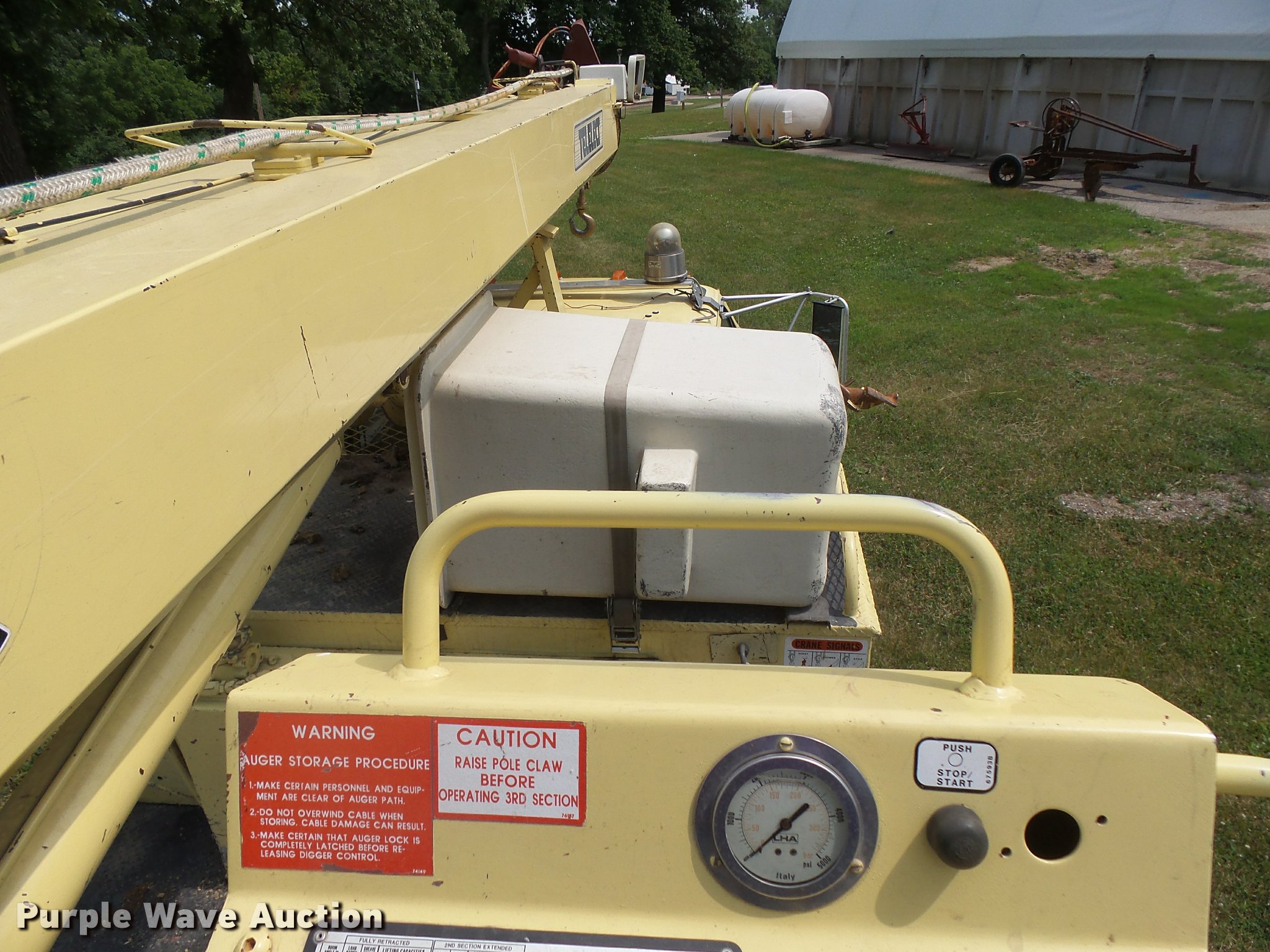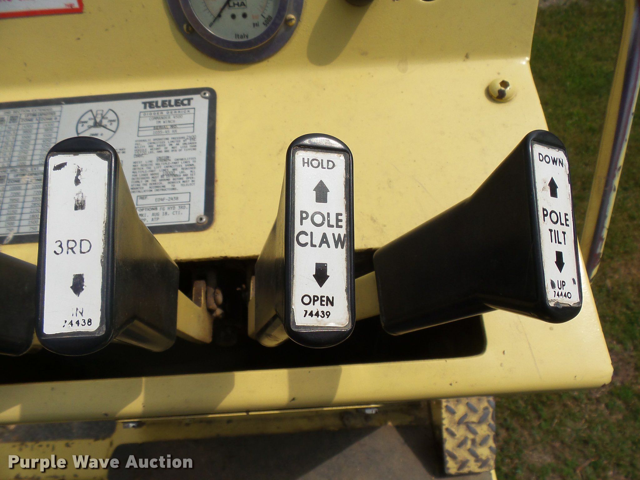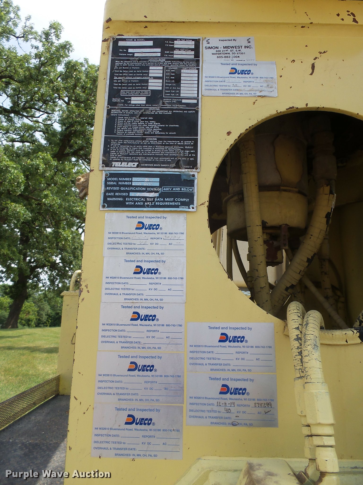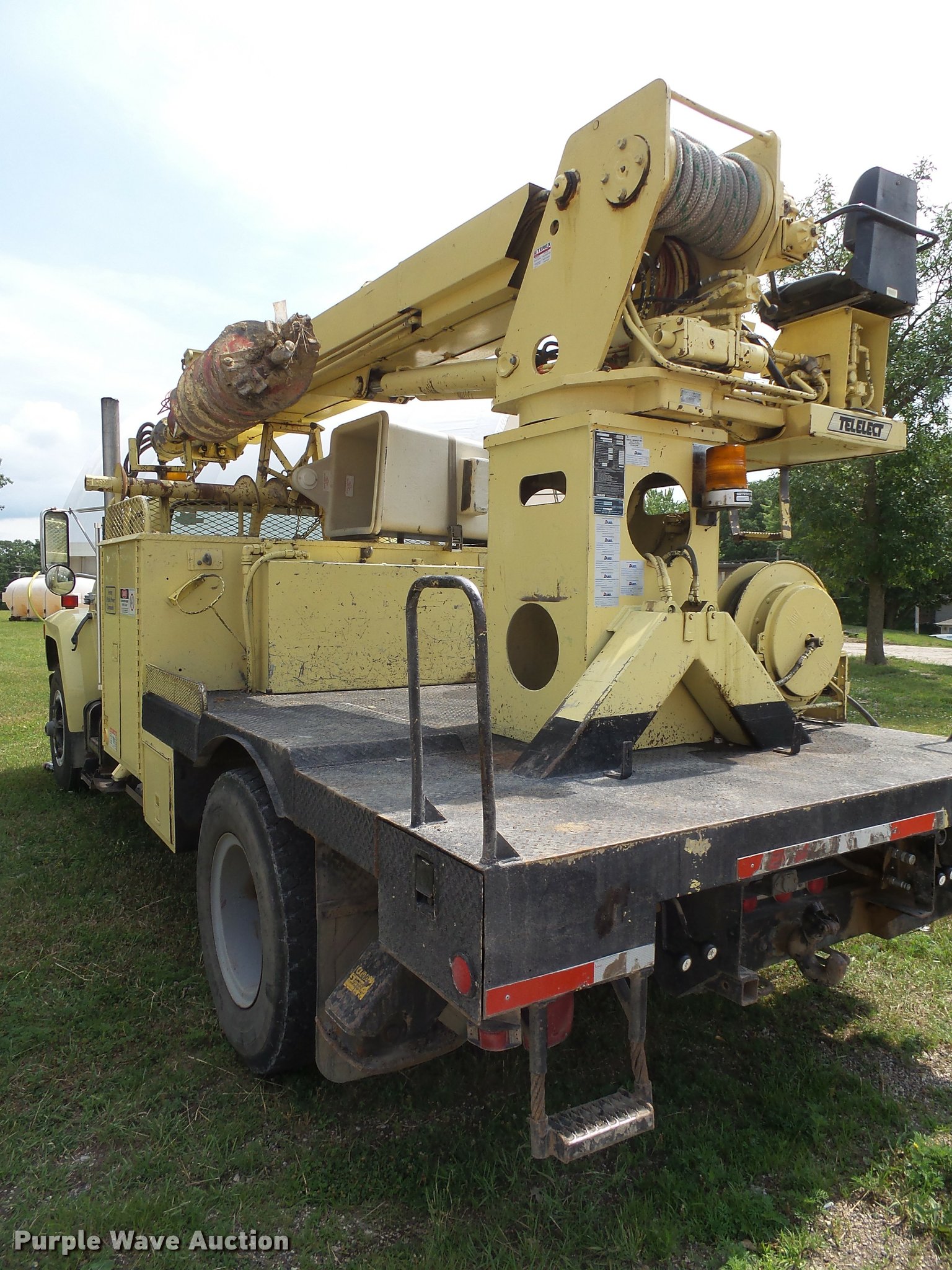 Purple Wave is selling a used Digger Derrick Truck in Iowa. This item is a 1990 Ford F800 digger derrick truck with the following: 42,724 miles on odometer, 3,723 hours on meter, 7.8L L6 diesel engine, Allison automatic transmission, Single axle, Heat, AM/FM, Spring suspension seat, Auxiliary controls, Beacon light, Backup alarm, Block heater, Front tow hooks, Service bed, 118"L x 93"W, Shelving, Slide-out drawers, Utility rack, Telelect Commander boom, Boom tip basket, Platform controls, Turret winch, Boom rotation, Pole guide, 8" auger, 18" auger, Rope material handler, Outriggers, Serial 1035-45HX, Certification valid through November 2015, Capstan hoist motor, Grounding cable, Single exhaust stack, Dual fuel tanks, Spring suspension, Pintle hitch, Trailer wiring, Hydraulic brakes, Samson 11R22.5 front tires, 10.00R20 rear tires