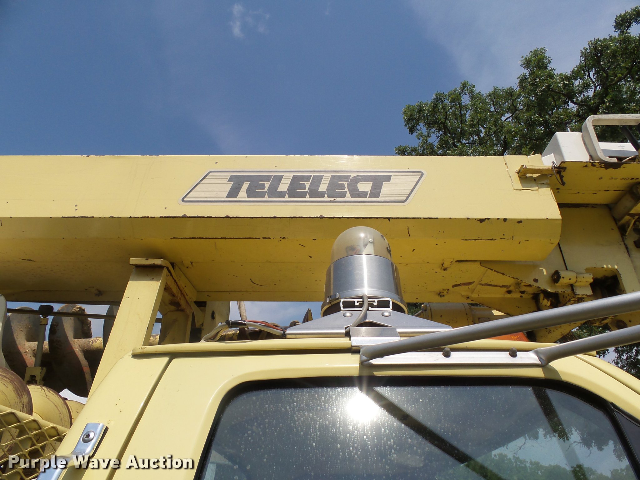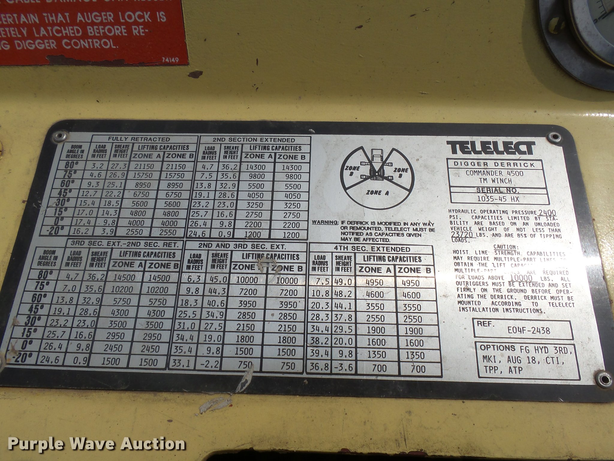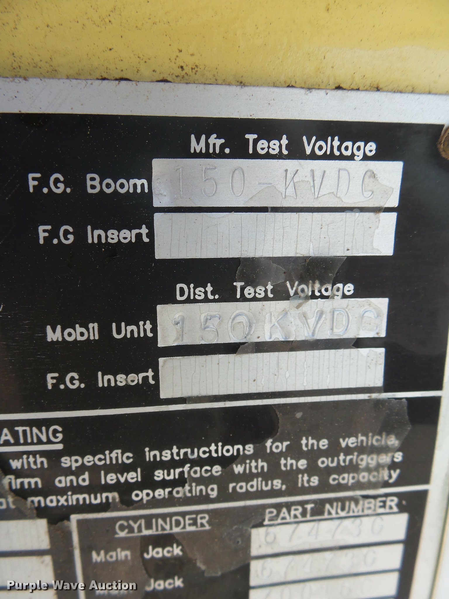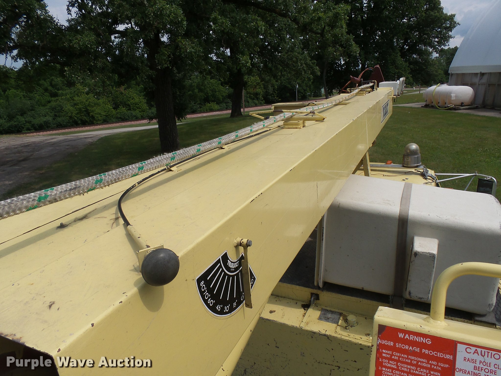 Purple Wave is selling a used Digger Derrick Truck in Iowa. This item is a 1990 Ford F800 digger derrick truck with the following: 42,724 miles on odometer, 3,723 hours on meter, 7.8L L6 diesel engine, Allison automatic transmission, Single axle, Heat, AM/FM, Spring suspension seat, Auxiliary controls, Beacon light, Backup alarm, Block heater, Front tow hooks, Service bed, 118"L x 93"W, Shelving, Slide-out drawers, Utility rack, Telelect Commander boom, Boom tip basket, Platform controls, Turret winch, Boom rotation, Pole guide, 8" auger, 18" auger, Rope material handler, Outriggers, Serial 1035-45HX, Certification valid through November 2015, Capstan hoist motor, Grounding cable, Single exhaust stack, Dual fuel tanks, Spring suspension, Pintle hitch, Trailer wiring, Hydraulic brakes, Samson 11R22.5 front tires, 10.00R20 rear tires