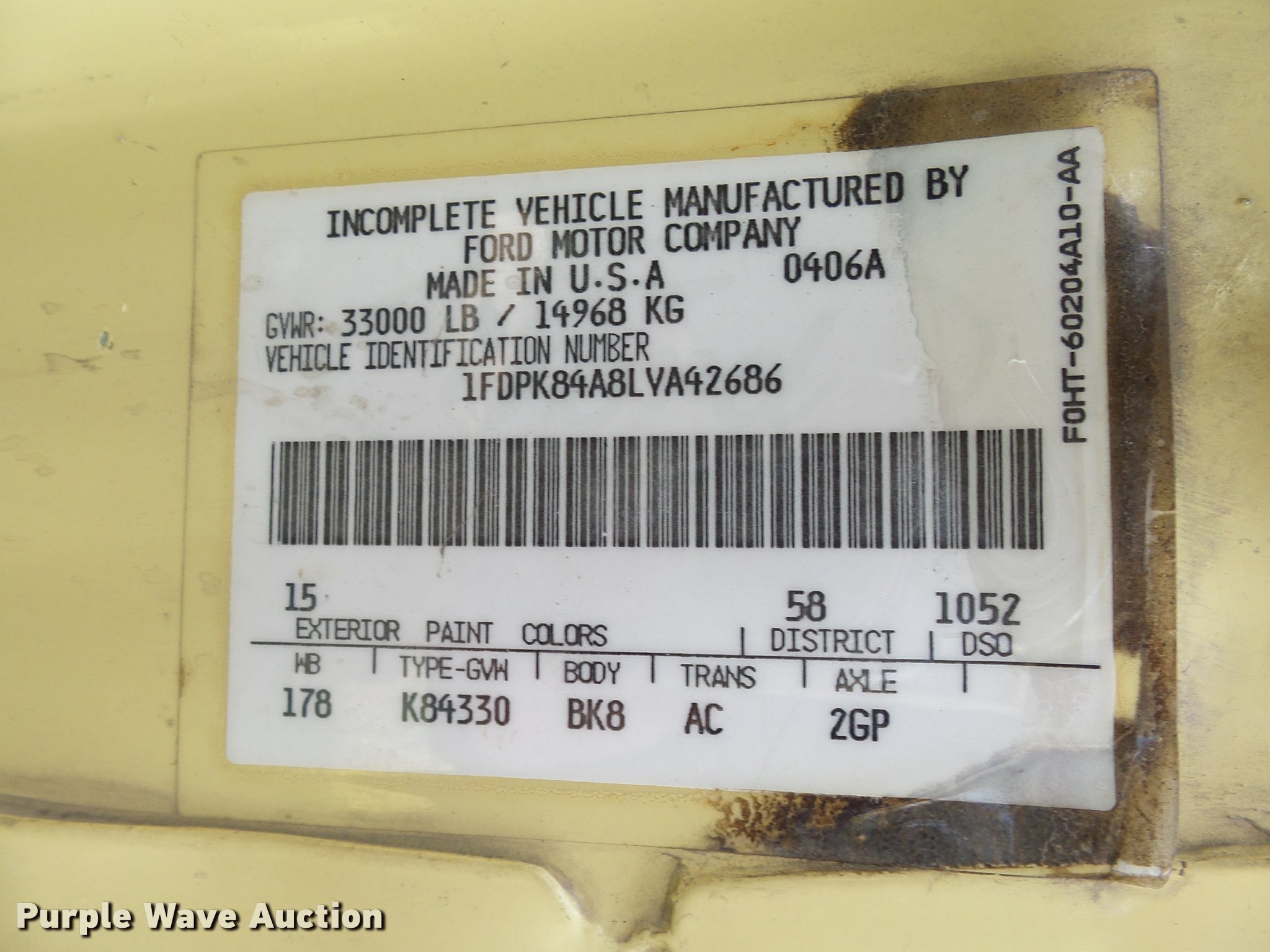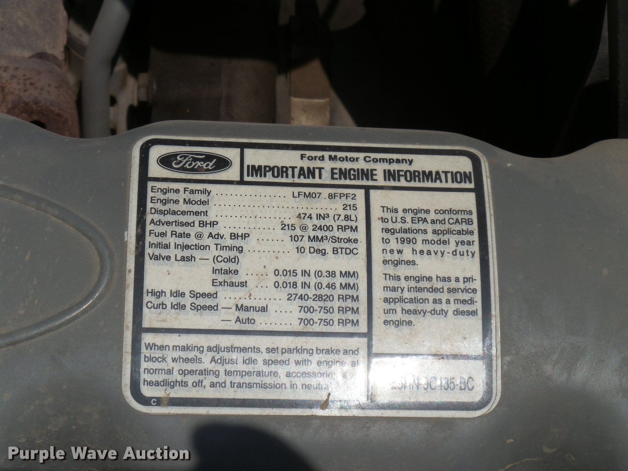 1990 Ford F800 digger derrick truck. 42,724 miles on odometer, 3,723 hours on meter, 7.8L L6 diesel engine, Allison automatic transmission, Single axle, Heat, AM/FM, Spring suspension seat, Auxiliary controls, Beacon light, Backup alarm, Block heater, Front tow hooks, Service bed 118"L x 93"W, Shelving, Slide-out drawers, Utility rack, Telelect Commander boom Boom tip basket, Platform controls, Turret winch, Boom rotation, Pole guide, 8" auger, 18" auger, Rope material handler, Outriggers, Serial 1035-45HX, Certification valid through November 2015, Capstan hoist motor, Grounding cable, Single exhaust stack, Dual fuel tanks, Spring suspension, Pintle hitch, Trailer wiring, Hydraulic brakes, Samson 11R22.5 front tires, 10.00R20 rear tires. Iowa title. 1FDPK84A8LVA42686. Algona Municipal Utilities. 104 W Call St. Algona, IA 50511