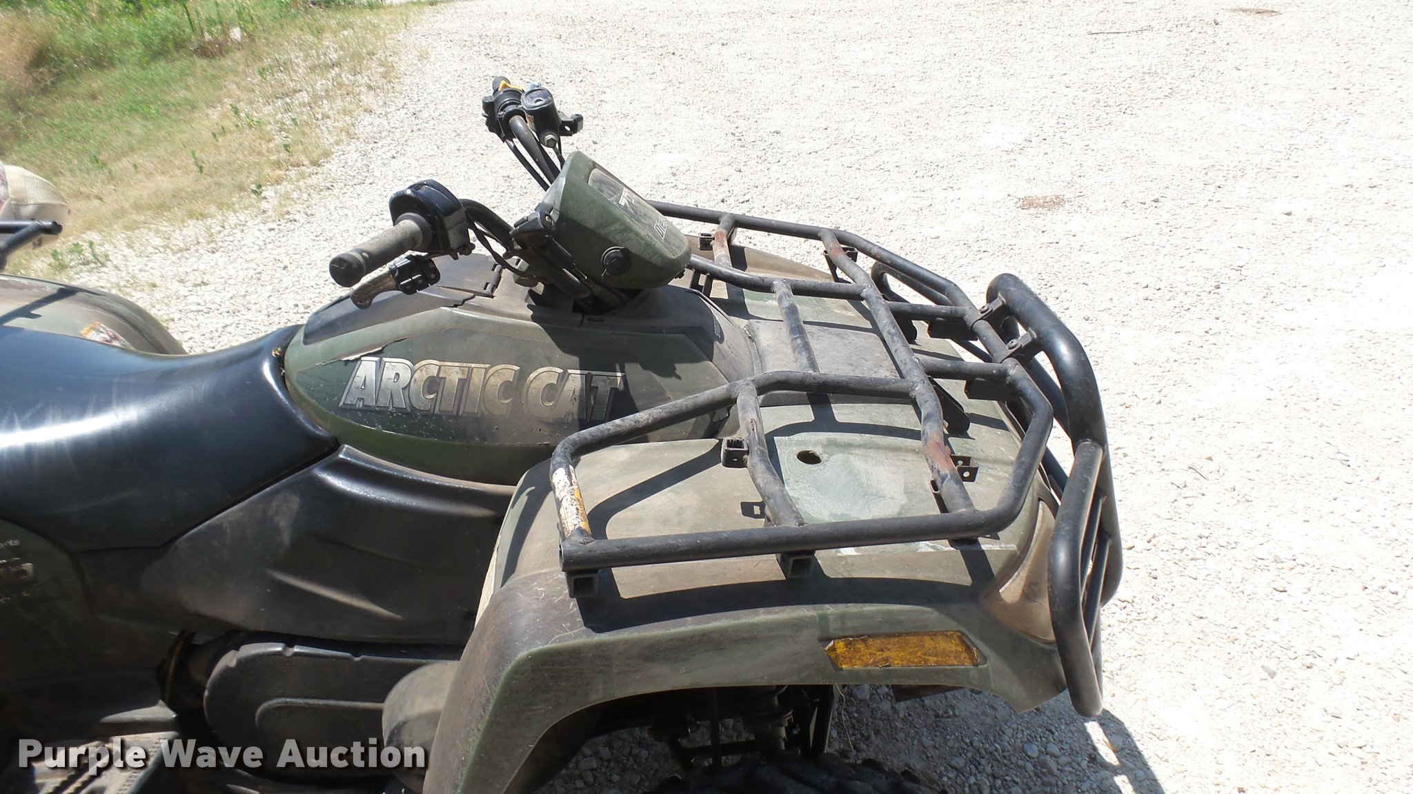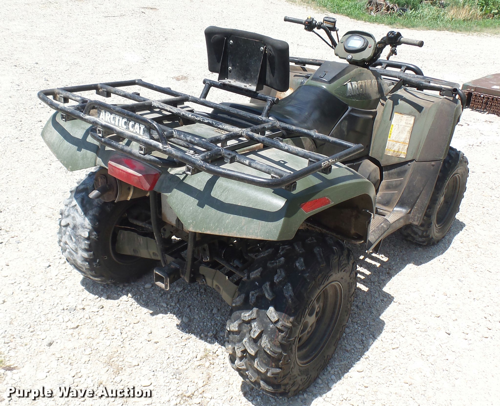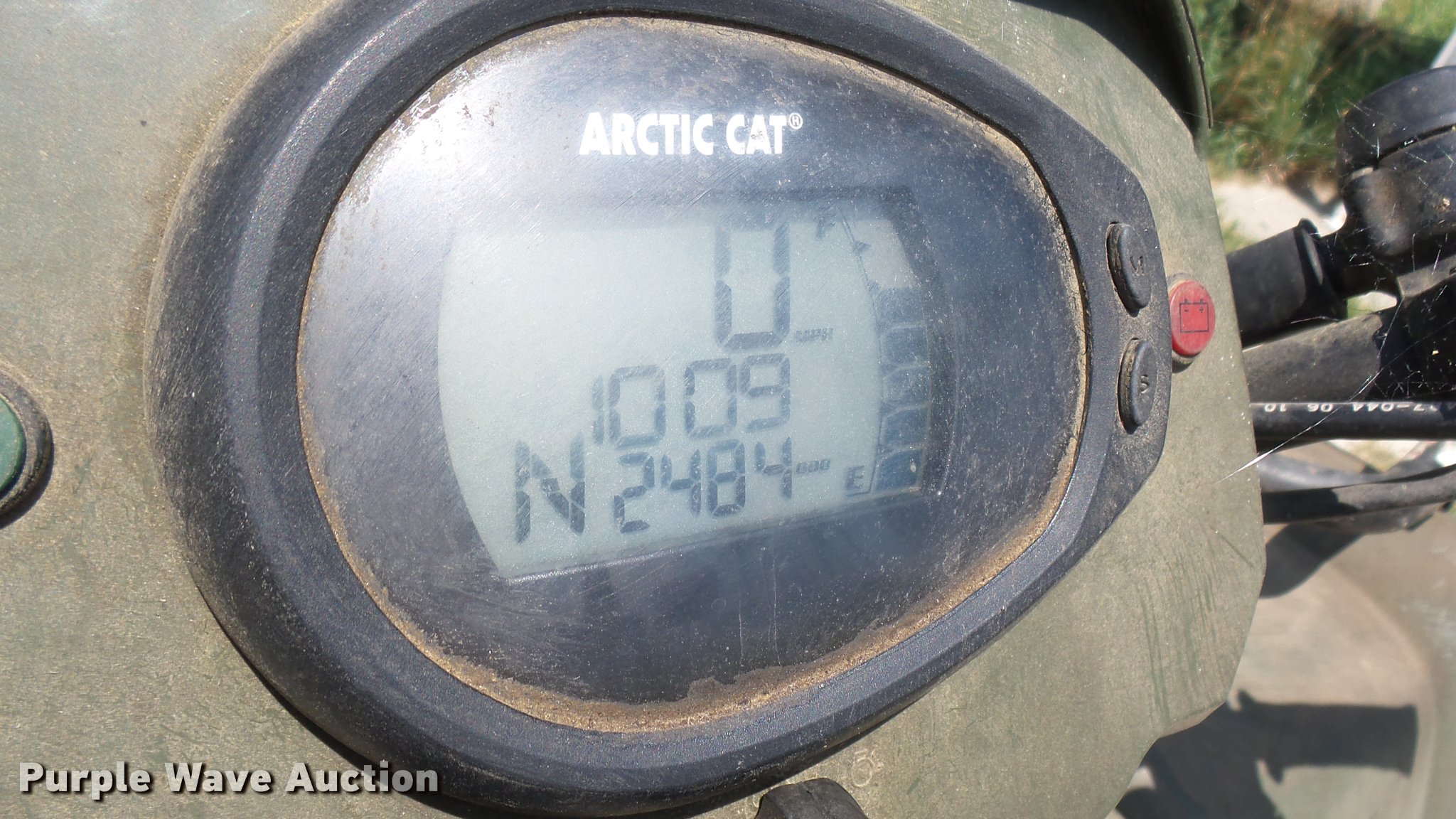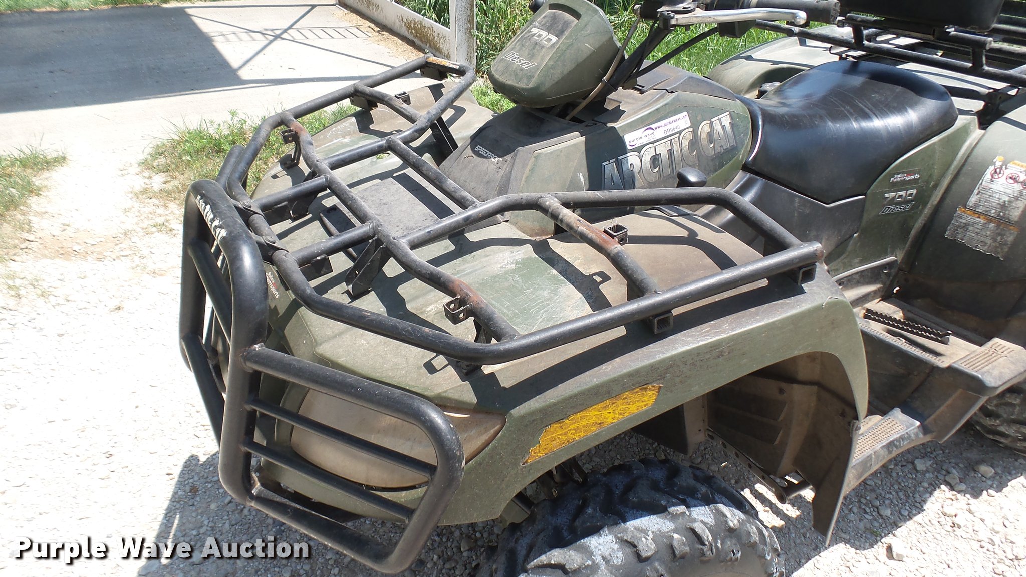 Purple Wave is selling a used ATV in Kansas. This item is a 2007 Arctic Cat 700 ATV with the following: 2,484 miles on odometer, Diesel engine, Automatic transmission, Four wheel drive, Lights, Brush guard, Receiver hitch, 25x8-12 front tires, 25x10-12 rear tires, Speed sensor needs replaced, CV axles needs replaced, Suspension bushings needs replaced, Alternator belt needs replaced, Possible clutch issues, sticking and may need adjusted, Engine issues, overheats