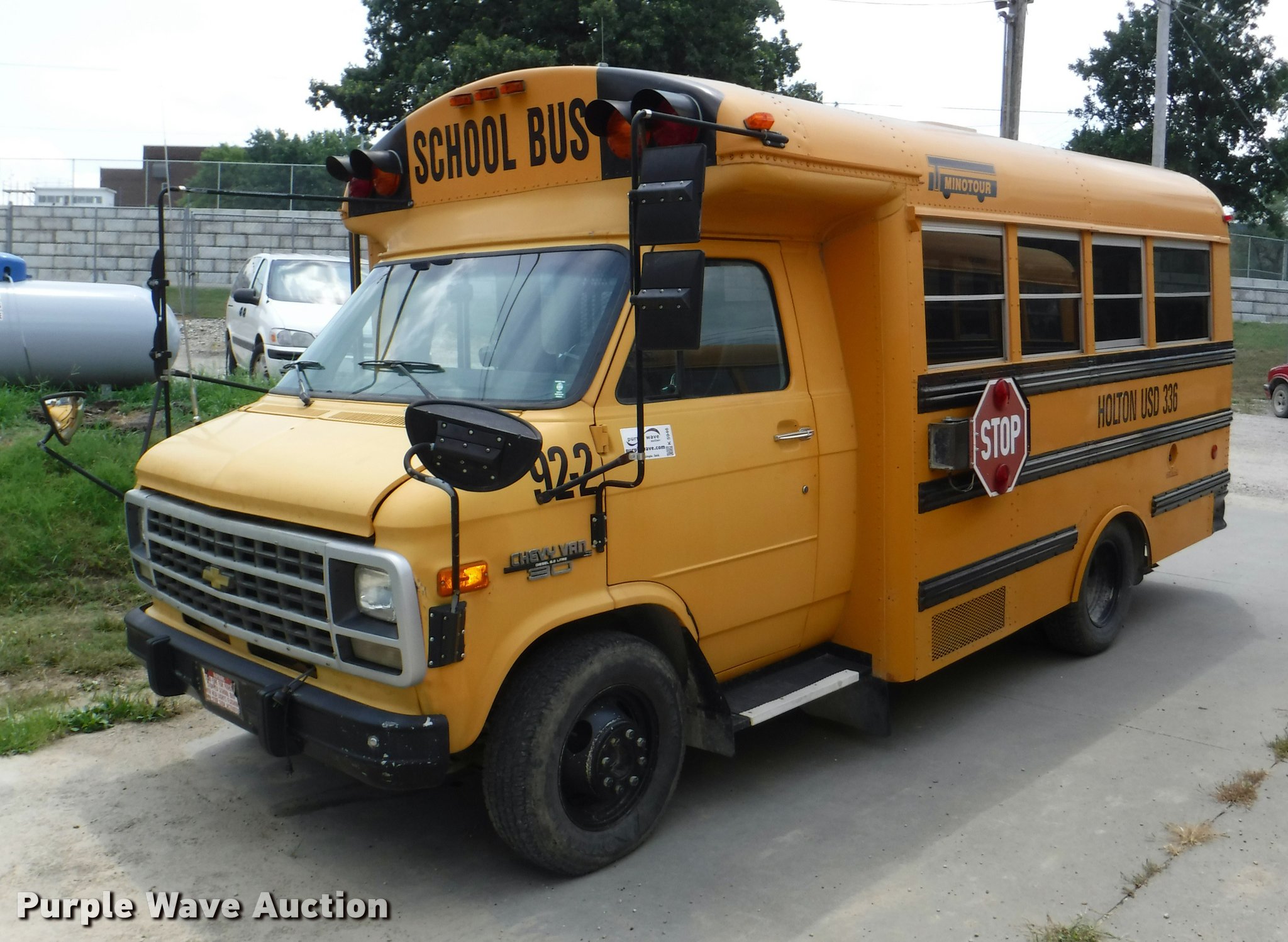 Purple Wave is selling a used Bus in Kansas. This item is a 1993 Chevrolet G30 school bus with the following: 129,642 miles on odometer, 6.2L V8 OHV 16V diesel engine, Automatic transmission, Single axle, AC and heat, AM/FM/cassette, Vinyl interior, Block heater, Nine passenger capacity, (8) seat belts, Braun L205U64PB wheelchair lift, Serial 7850, Wheelchair tie down area, Ceiling, rear, and side emergency exits, Lighted stop sign, AC roof unit, Non-operational, Spring suspension, Hydraulic brakes, 124" wheelbase, 225/75R16 tires, GVWR 10,000 lbs, Decals will be painted over, Unit# 92-2