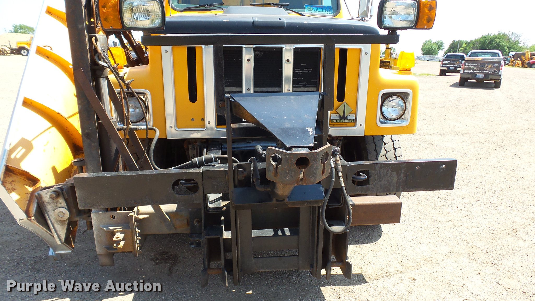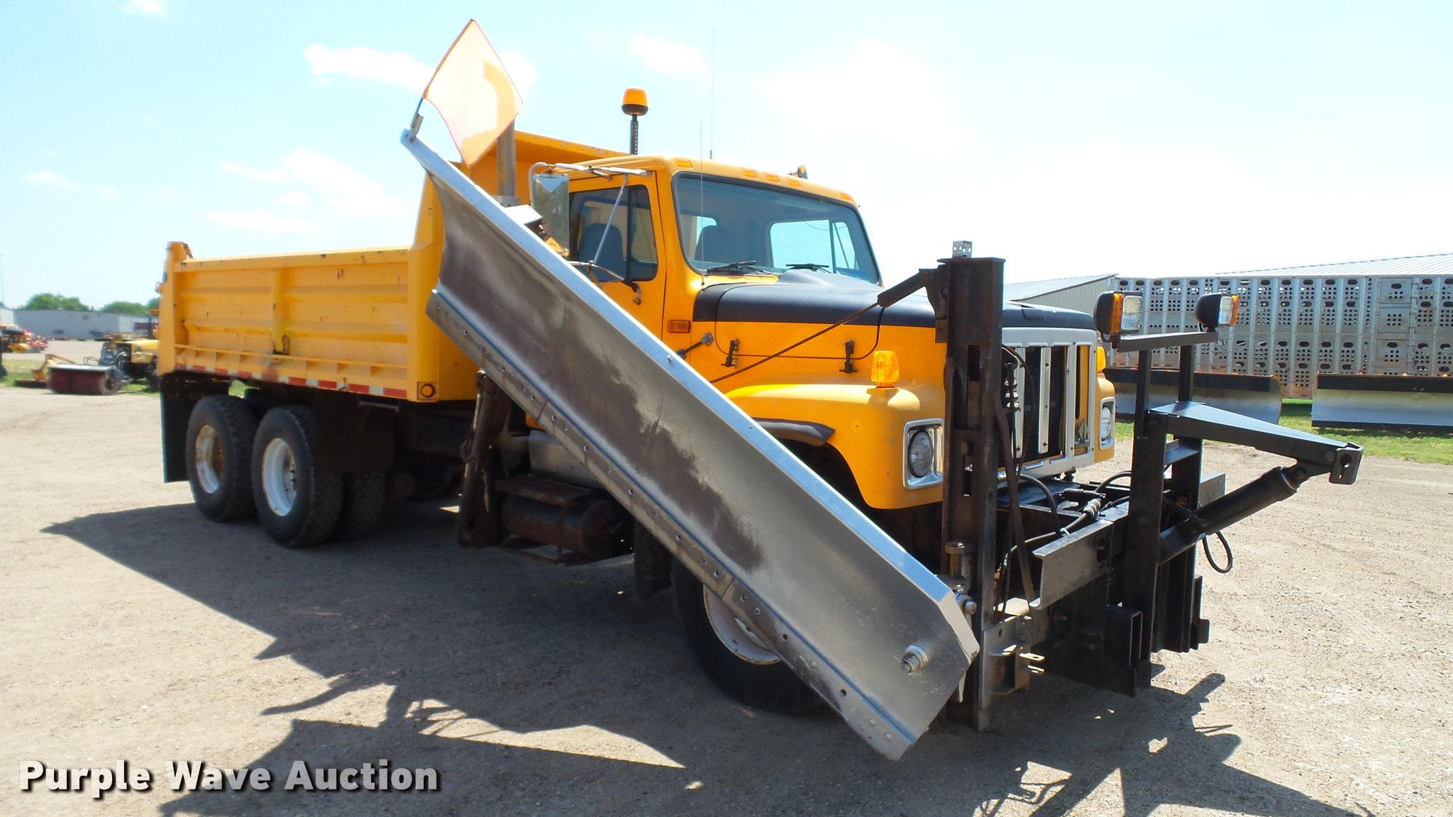 Purple Wave is selling a used Construction Dump Truck in South Dakota. This item is a 1998 International 2554 dump truck with the following: 142,992 miles on odometer, 6,824 hours on meter, International DT530 8.7L L6 turbo diesel engine, Eaton Fuller 10 speed manual transmission, Tandem axle, Heat, Tilt, Telescoping steering wheel, Cruise, AM/FM/cassette, Heated mirrors, Beacon light, Brake controller, Block heater, Front mounted PTO, Steel dump bed, 15'L x 8'W, 32" side height, Single ram hoist, Bed vibrator, Manual operated end gate, (2) hydraulic remotes, Monroe MP48R12-ISCT plow, 12'W, Serial 97-10-2633, Monroe 105FWMB wing plow, 10'W, Serial 95-11-4661, Single fuel tank, Pintle hitch, Trailer wiring, 210" wheelbase, Spring walking beam suspension, Air brakes, 385/65R22.5 front tires, 12R22.5 rear tires, Unit# DL162, RD040, RR261