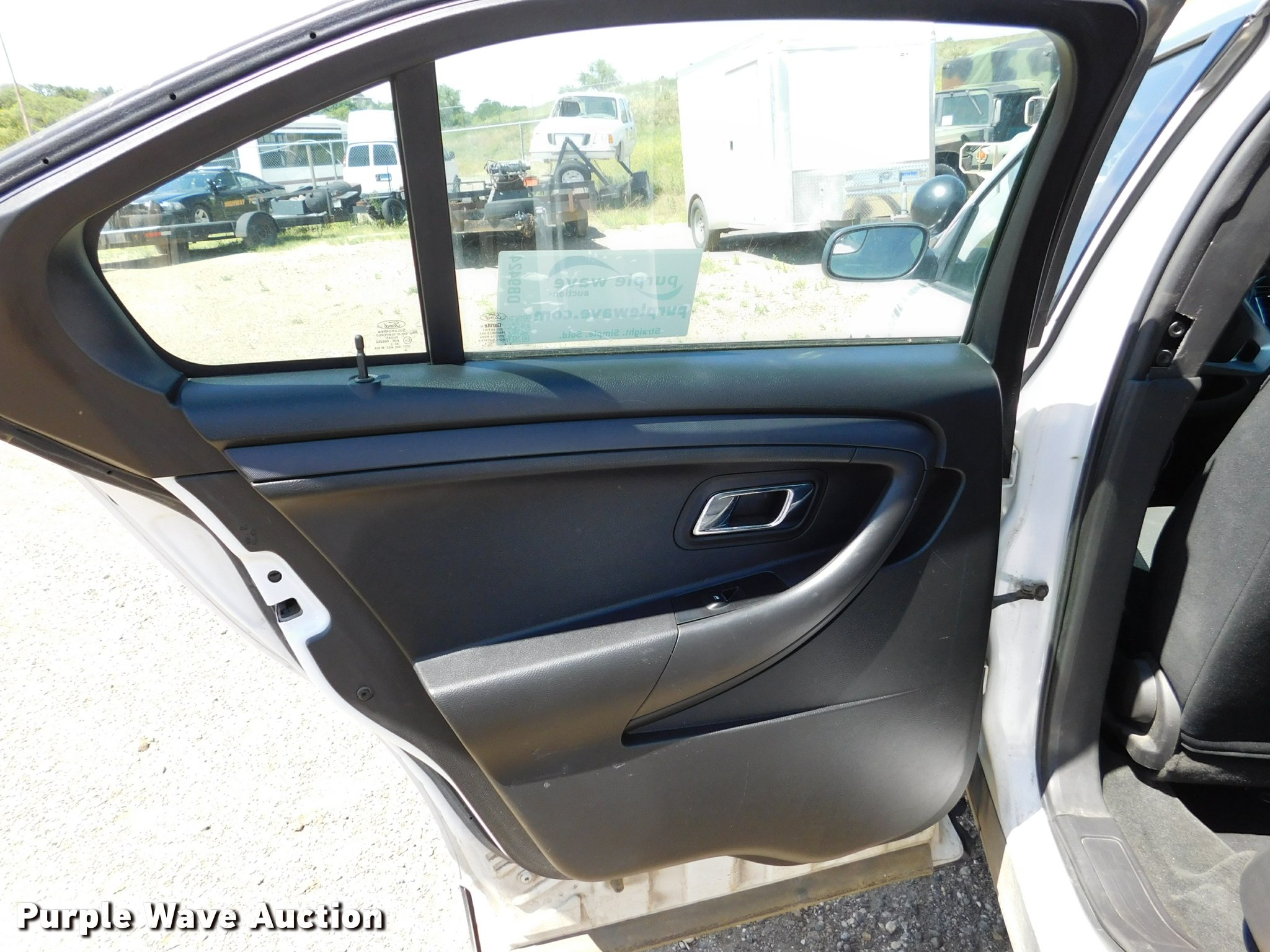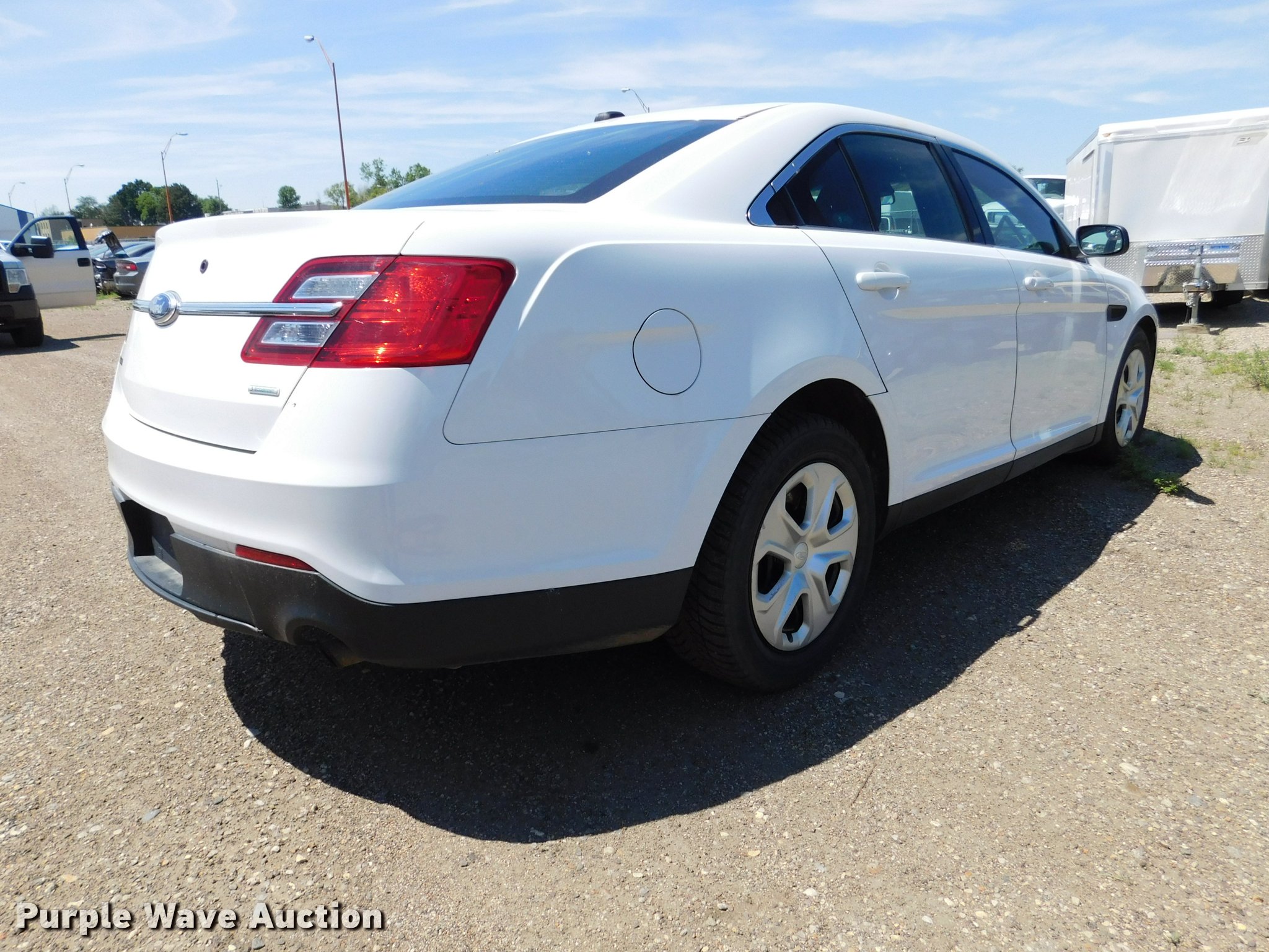 Purple Wave is selling a used Passenger Vehicle in South Dakota. This item is a 2013 Ford Taurus Police with the following: 128,102 miles on odometer, 3.5L V6 DOHC 24V gas engine, Automatic transmission, AC and heat, Tilt, Cruise, AM/FM/CD, Power windows, locks, mirrors, and seat, Cloth interior, Adjustable foot pedals, Electric trunk release, 245/55R18 tires, Rear seat is not bolted down, Center console missing, Asset# 352216, Equip ID 14AK265