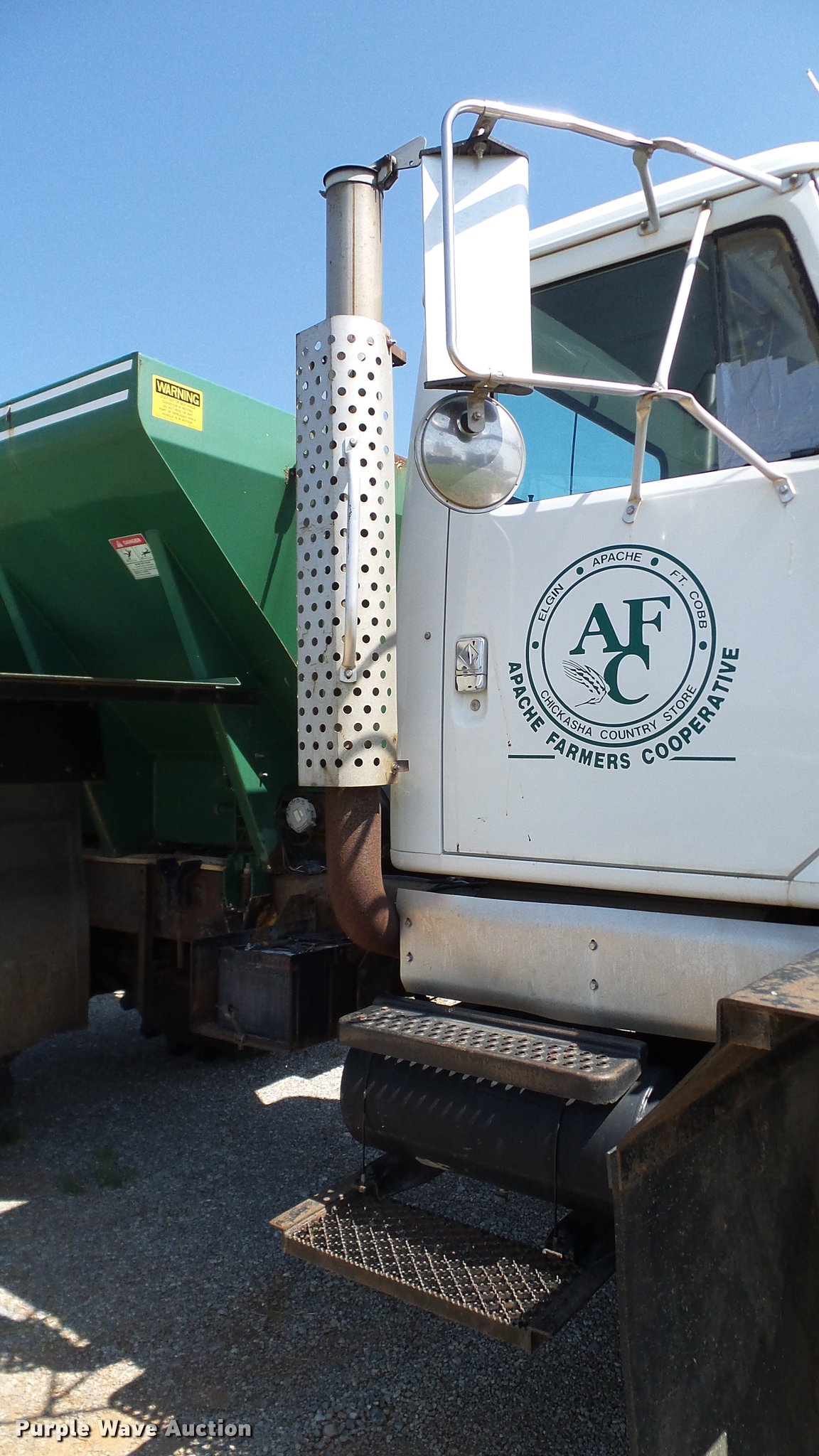 1996 International 2554 Stahly applicator truck. 78,384 miles on odometer, 5,861 hours on meter, International six cylinder turbo diesel engine, Allison automatic transmission, AC and heat, AM/FM, Air suspension seat, Dickey John DJCCS100/DJCM/00 monitors, Mid-Tech Swath XL monitor, Loral L2020-12-61 dry fertilizer spreader bed 11'L, Dual spinners, 24"W conveyor belt, Serial 110039, Fenders, 48x25.00-20 front flotation tires, 66x43.00-25 rear flotation tires, Passenger door vent broken, Turn signal lever broken, Unit# 28. Transfer of ownership documentation will be a bill of sale. 1HTGBADR8TH267550. Apache Farmers Coop. 210 W Floyd Ave. Apache, OK 73006