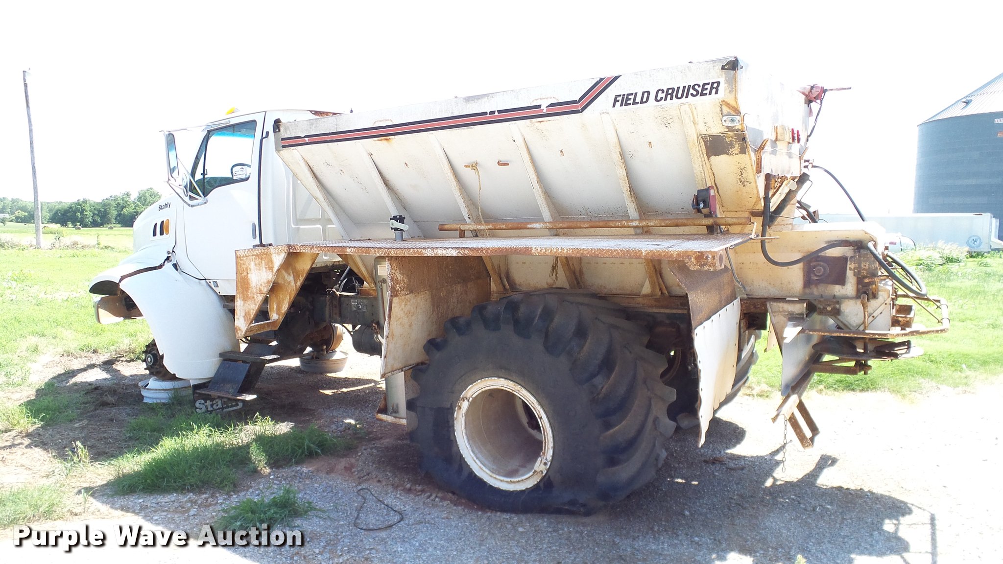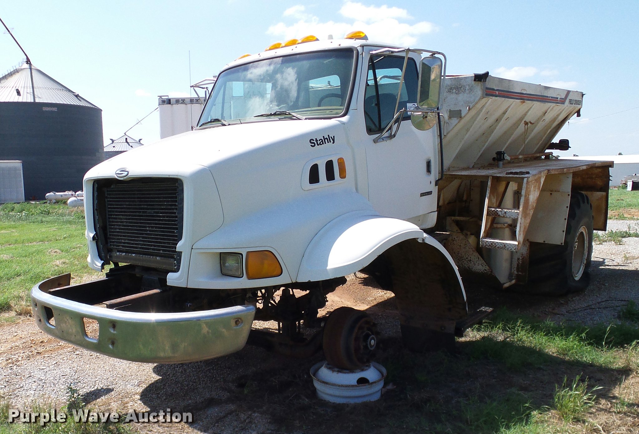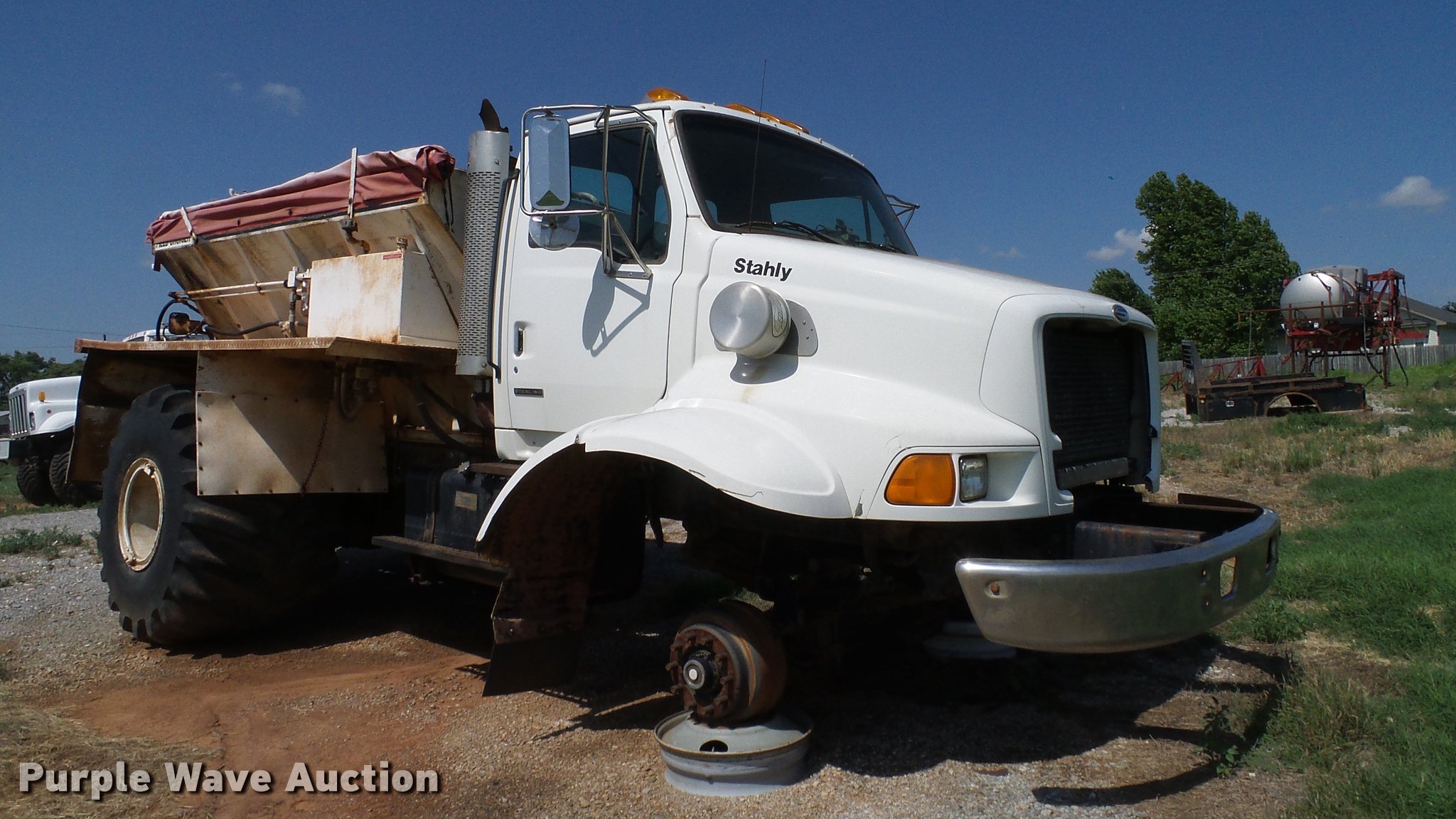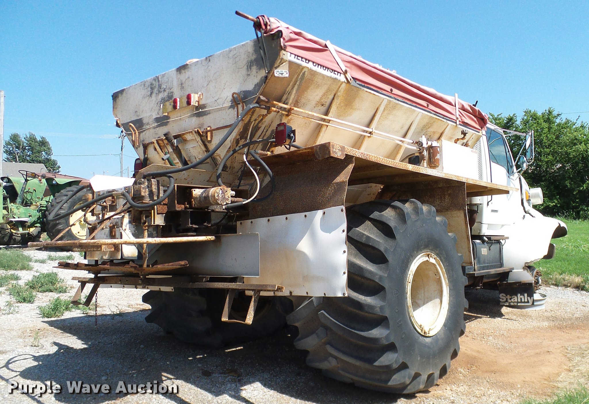 Purple Wave is selling a used Applicator Truck in Oklahoma. This item is a 1999 Sterling L8513 Stahly Field Cruiser applicator truck with the following: 102,166 miles on odometer, 8,306 hours on meter, Caterpillar 3126 7.2L L6 turbo diesel engine, 300 HP, Serial 7AS48349, Allison automatic transmission, AC and heat, Cruise, AM/FM, Air suspension seat, Work lights, Dickey John DJCCS/00/DJCMS100 monitors, Simonsen KB71255DJ stainless steel dry fertilizer spreader bed, 14'L, Dual spinners, Rollover tarp, 20"W conveyor belt, Serial 8003210, Fenders, Air brakes, Front flotation wheels only, 66x43.00-25 rear flotation tires, Left rear tire flat, Tarp damaged, Non-operational unit, parts only