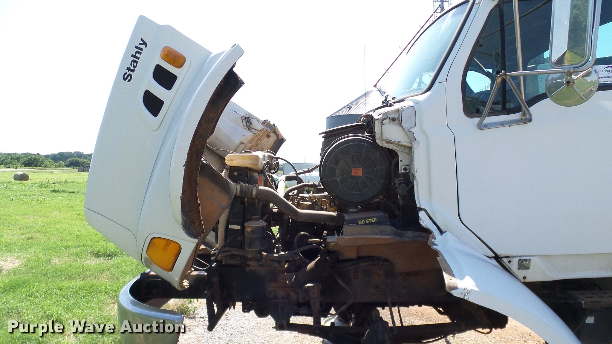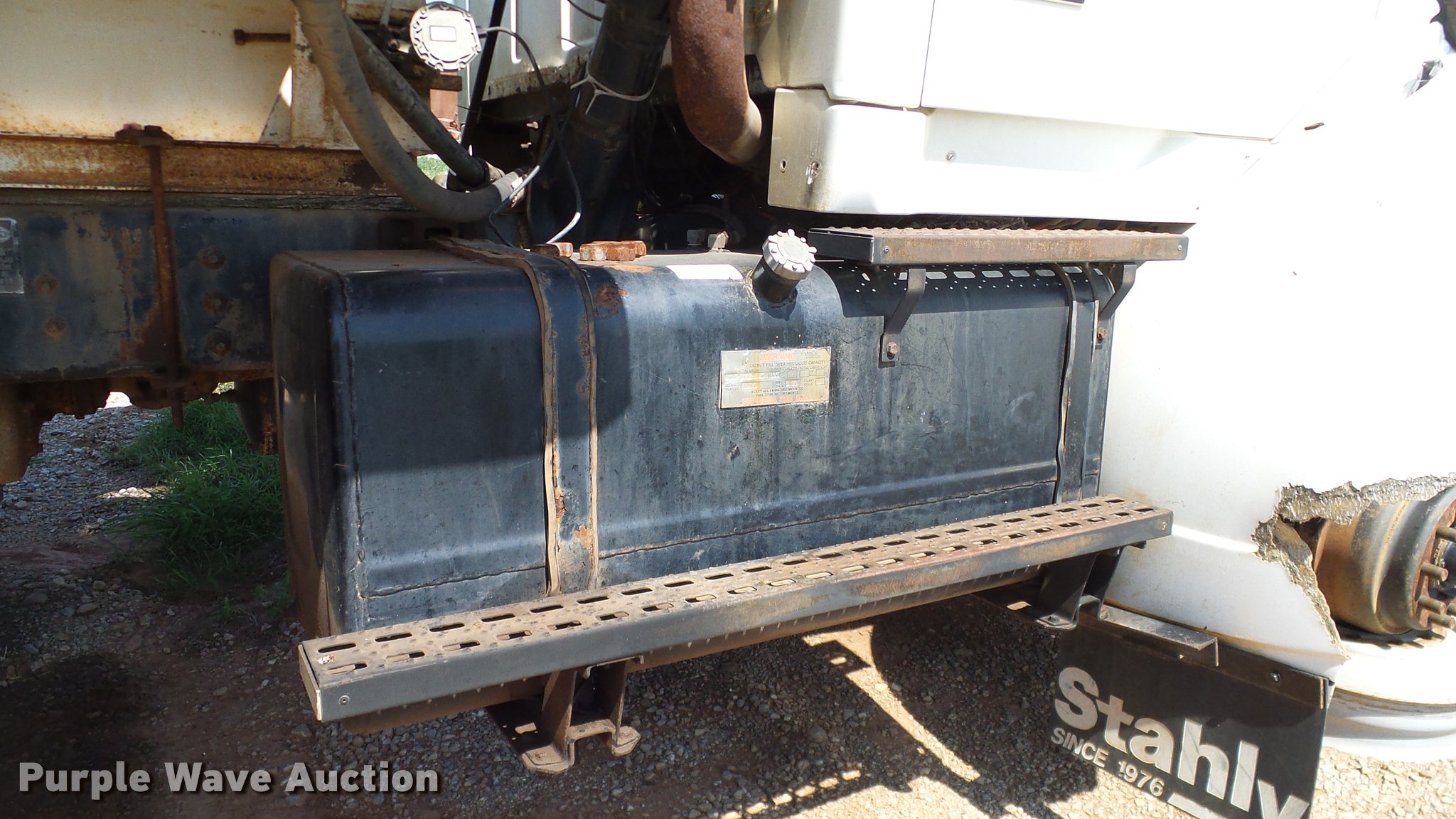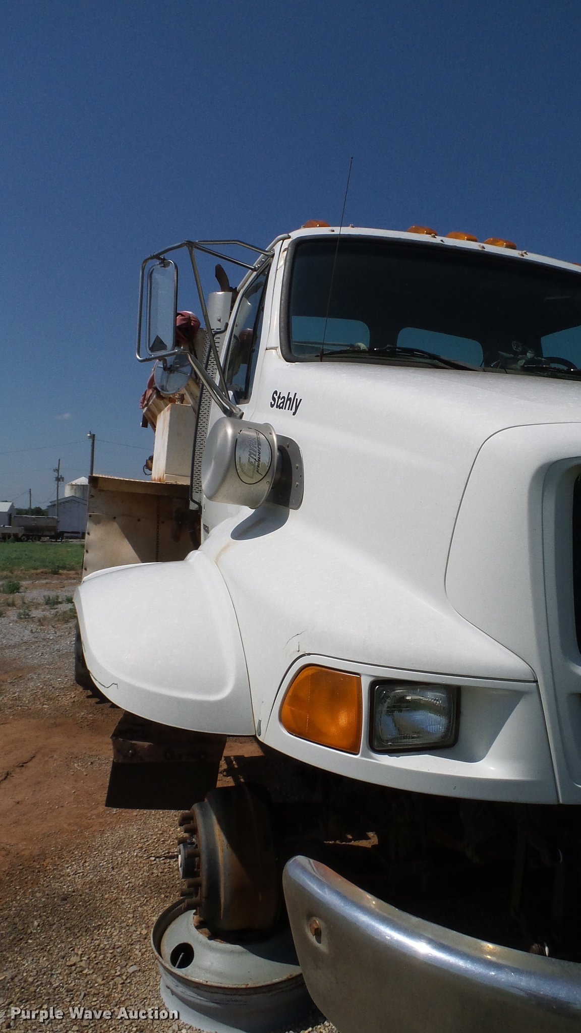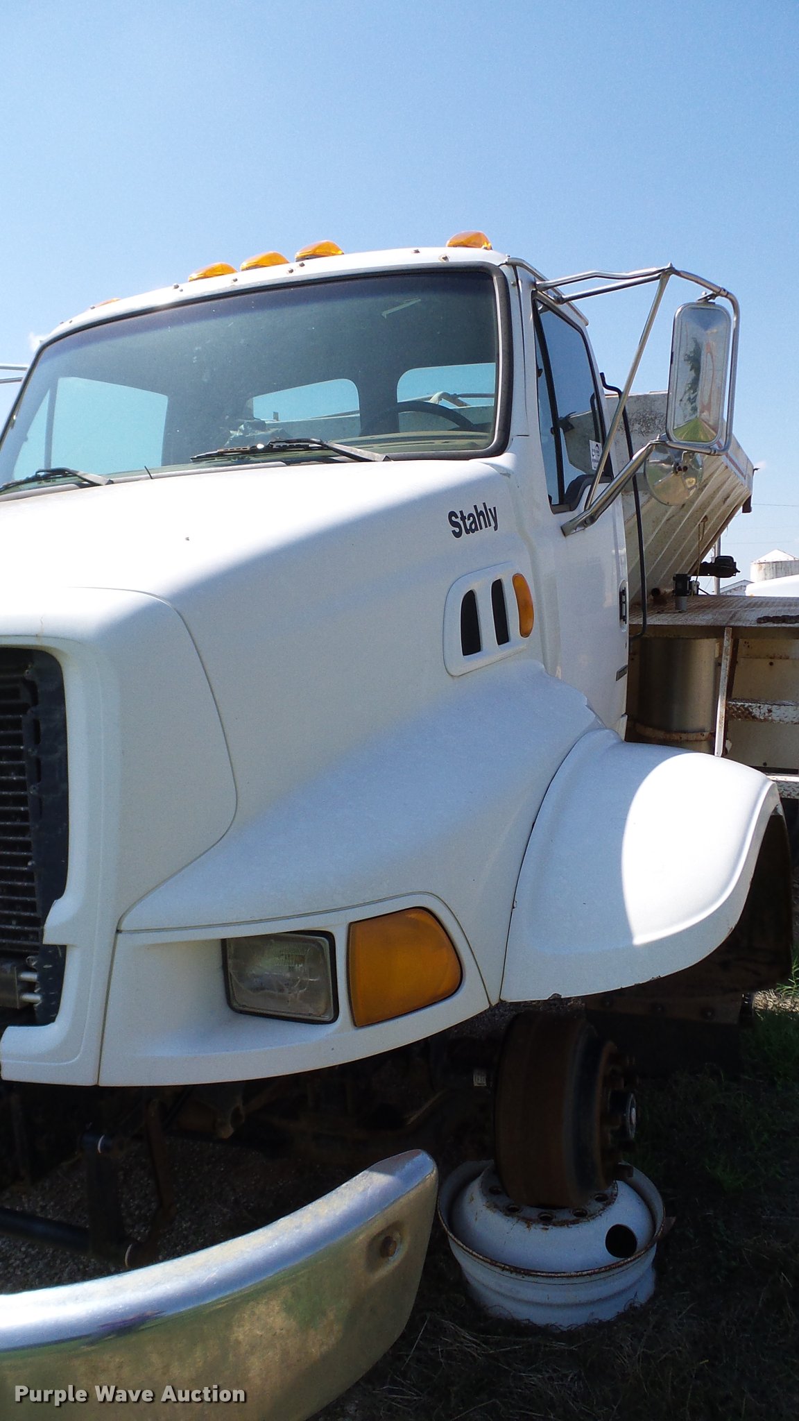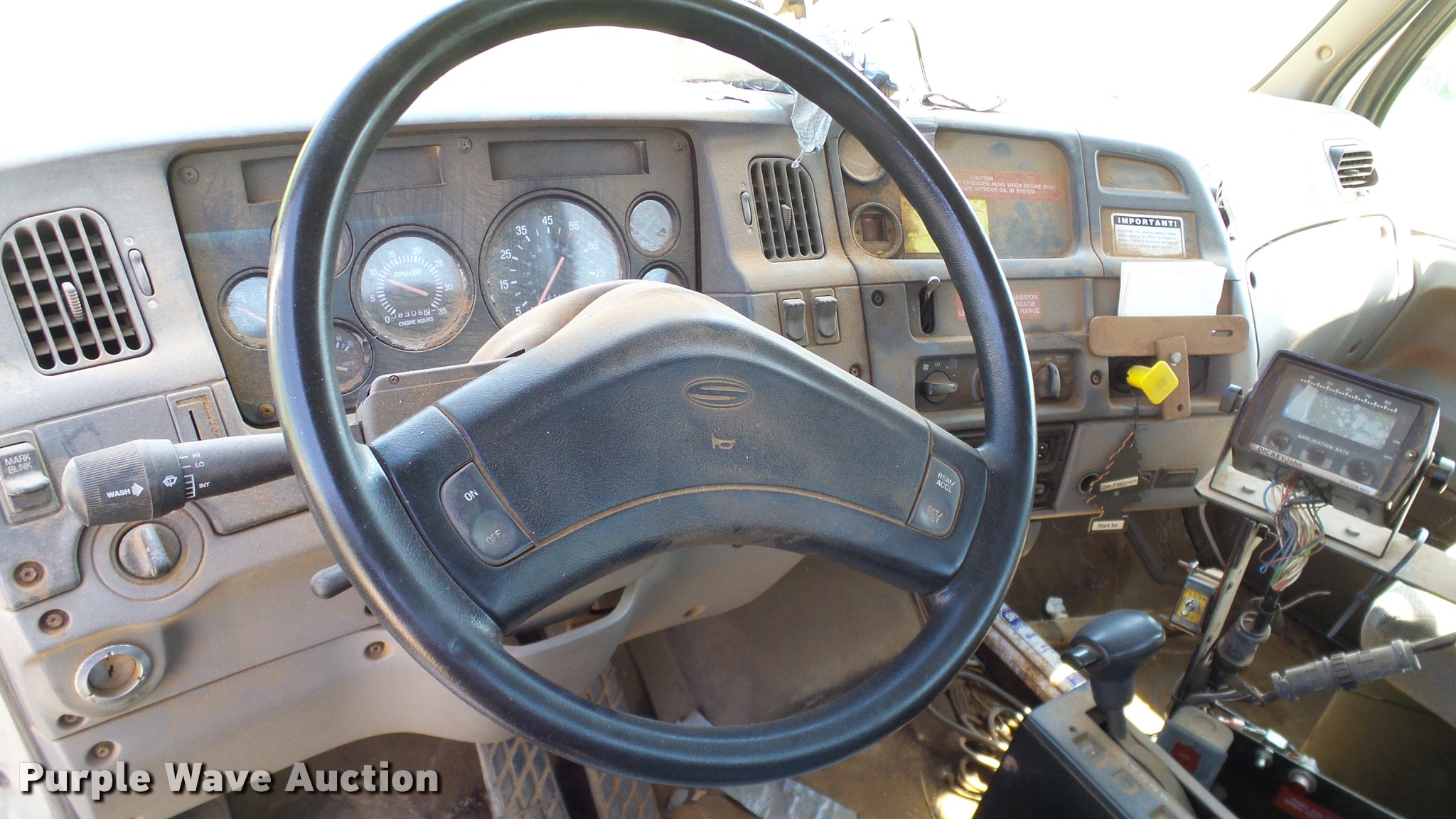 Purple Wave is selling a used Applicator Truck in Oklahoma. This item is a 1999 Sterling L8513 Stahly Field Cruiser applicator truck with the following: 102,166 miles on odometer, 8,306 hours on meter, Caterpillar 3126 7.2L L6 turbo diesel engine, 300 HP, Serial 7AS48349, Allison automatic transmission, AC and heat, Cruise, AM/FM, Air suspension seat, Work lights, Dickey John DJCCS/00/DJCMS100 monitors, Simonsen KB71255DJ stainless steel dry fertilizer spreader bed, 14'L, Dual spinners, Rollover tarp, 20"W conveyor belt, Serial 8003210, Fenders, Air brakes, Front flotation wheels only, 66x43.00-25 rear flotation tires, Left rear tire flat, Tarp damaged, Non-operational unit, parts only