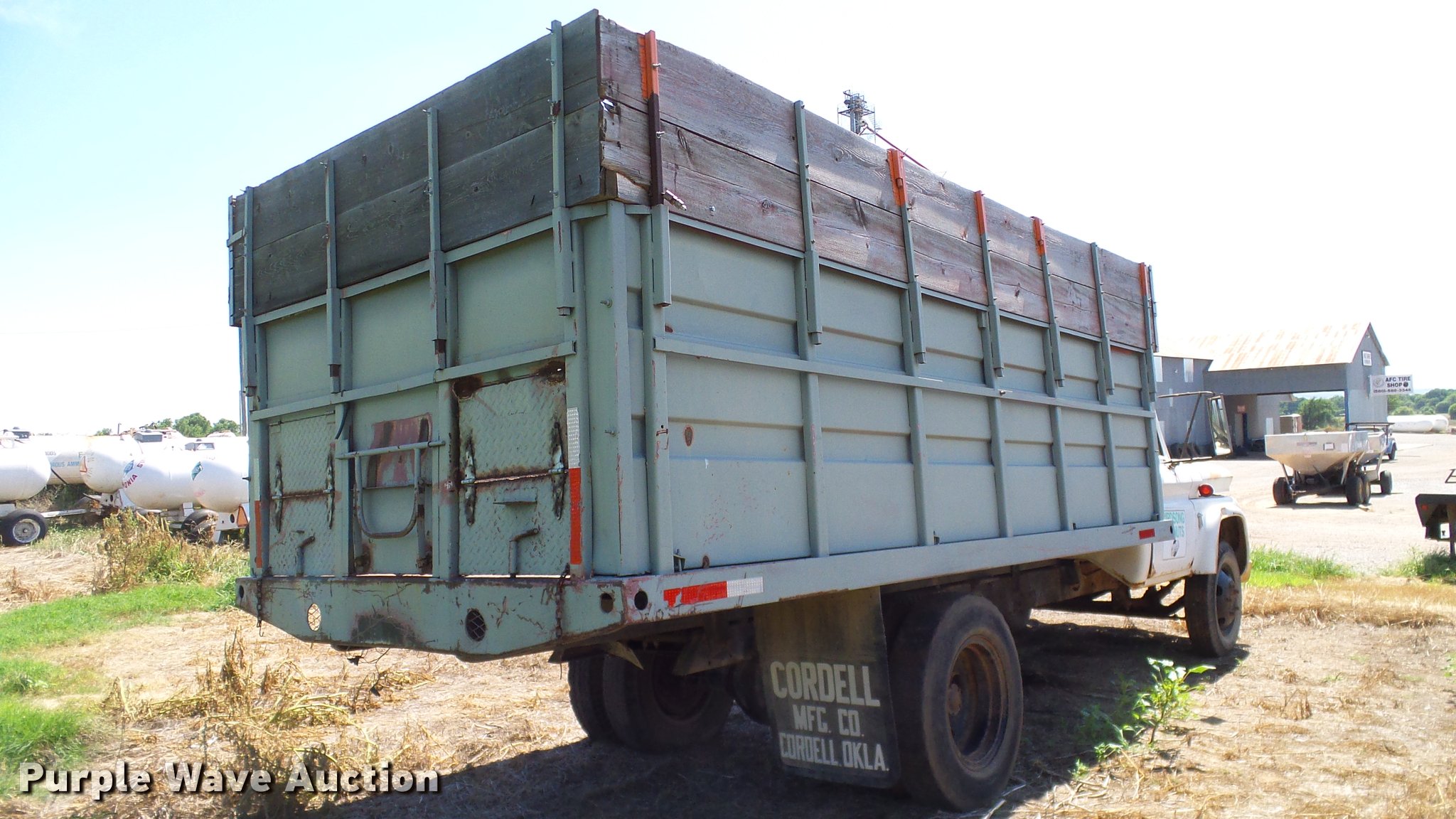 Purple Wave is selling a used Grain Truck in Oklahoma. This item is a 1964 Chevrolet 60 grain truck with the following: 54,277 miles on odometer, Chevrolet six cylinder gas engine, Four speed manual transmission, Two speed rear end, Single axle, Heat, Suspension seat, 16'L x 96"W steel grain bed, 44" side height, 23" side board height, Manual end gate, Spring suspension, 183" wheelbase, 8.25-20 tires, No battery, Windows will not roll up, Cracked windshield