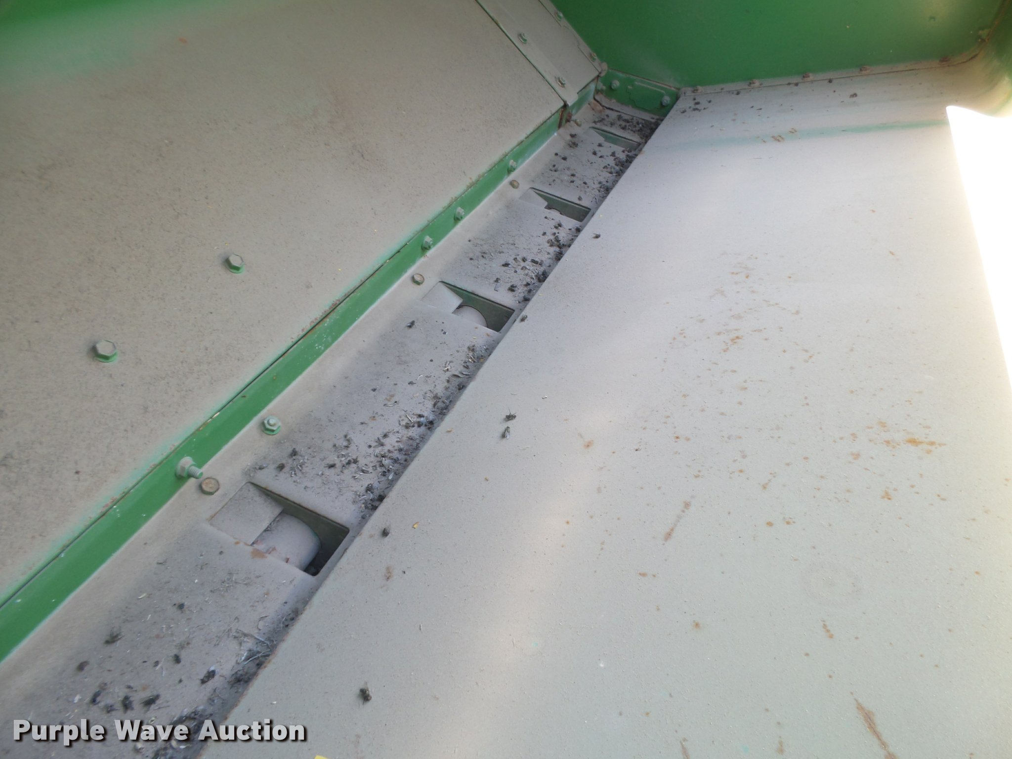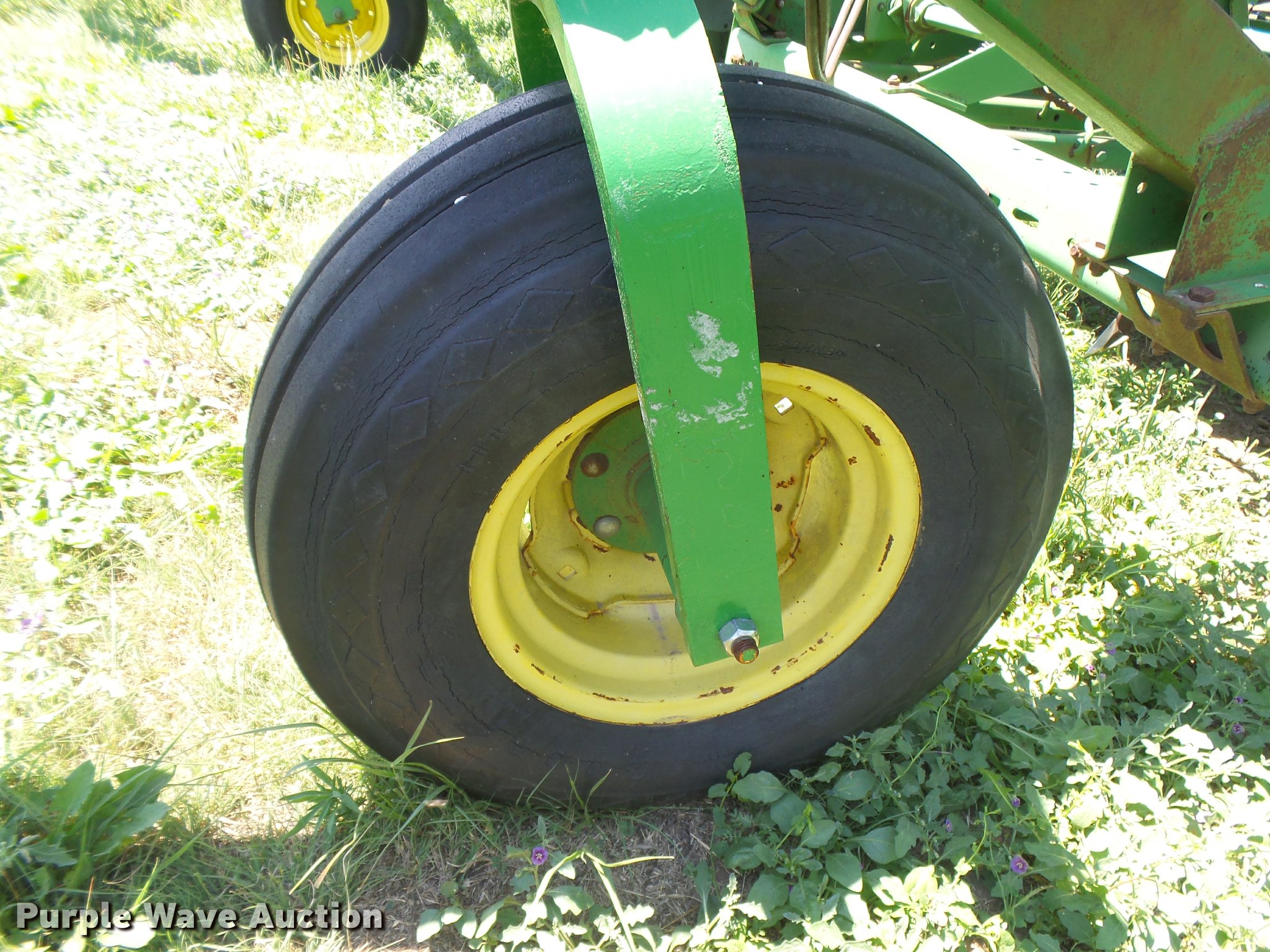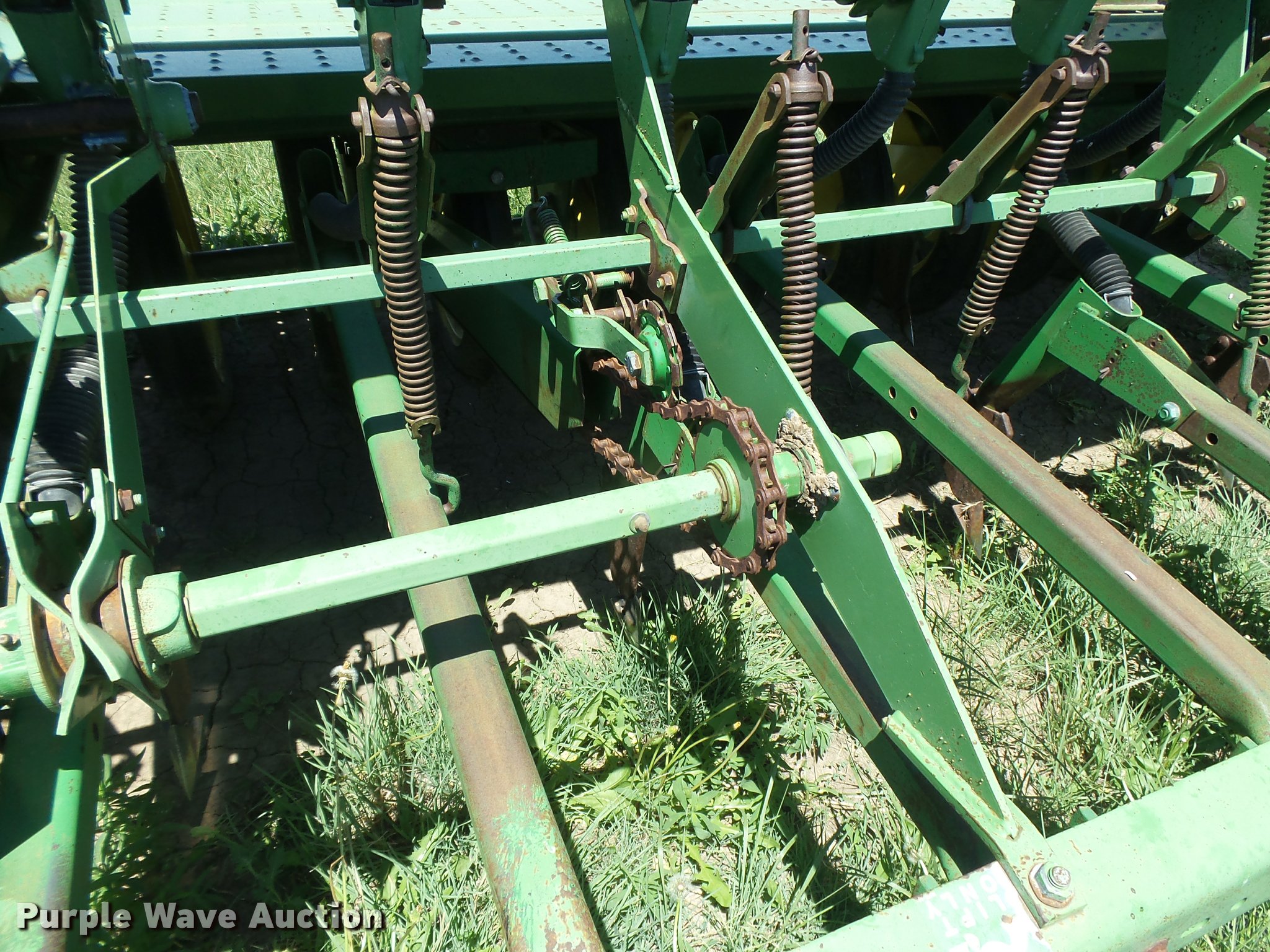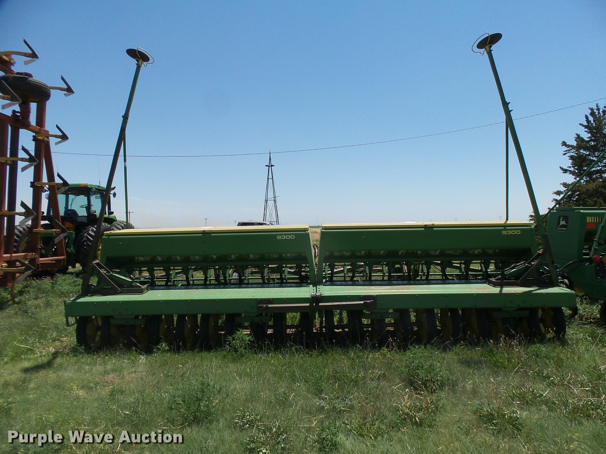Purple Wave is selling a used Grain Drill or Seeder in Kansas. This item is a John Deere 9300 grain drill with the following: 20'W, 20 row units, 10" row spacing, Bulk fill system, Ground driven meters, Single press wheels, Rubber closing system, Hydraulic raise, Pin hitch, (2) 11L14 transport tires, Serial N09000X034753/N09000X034754