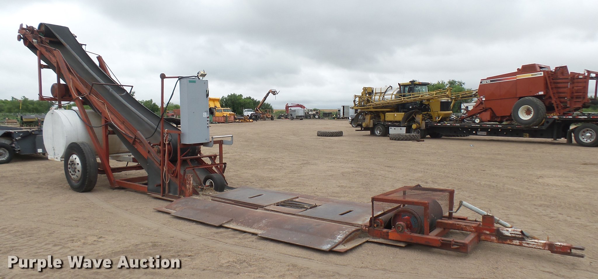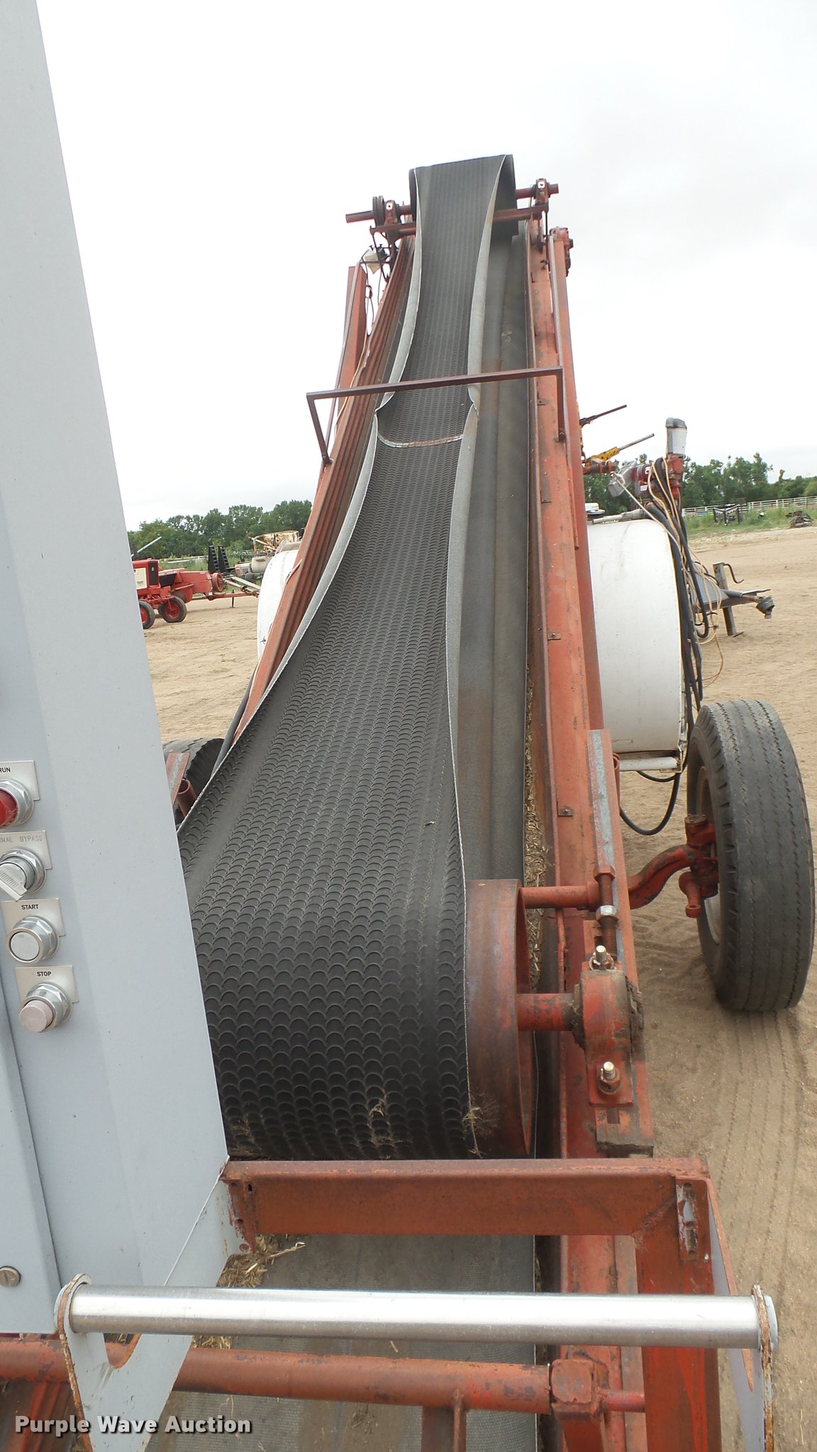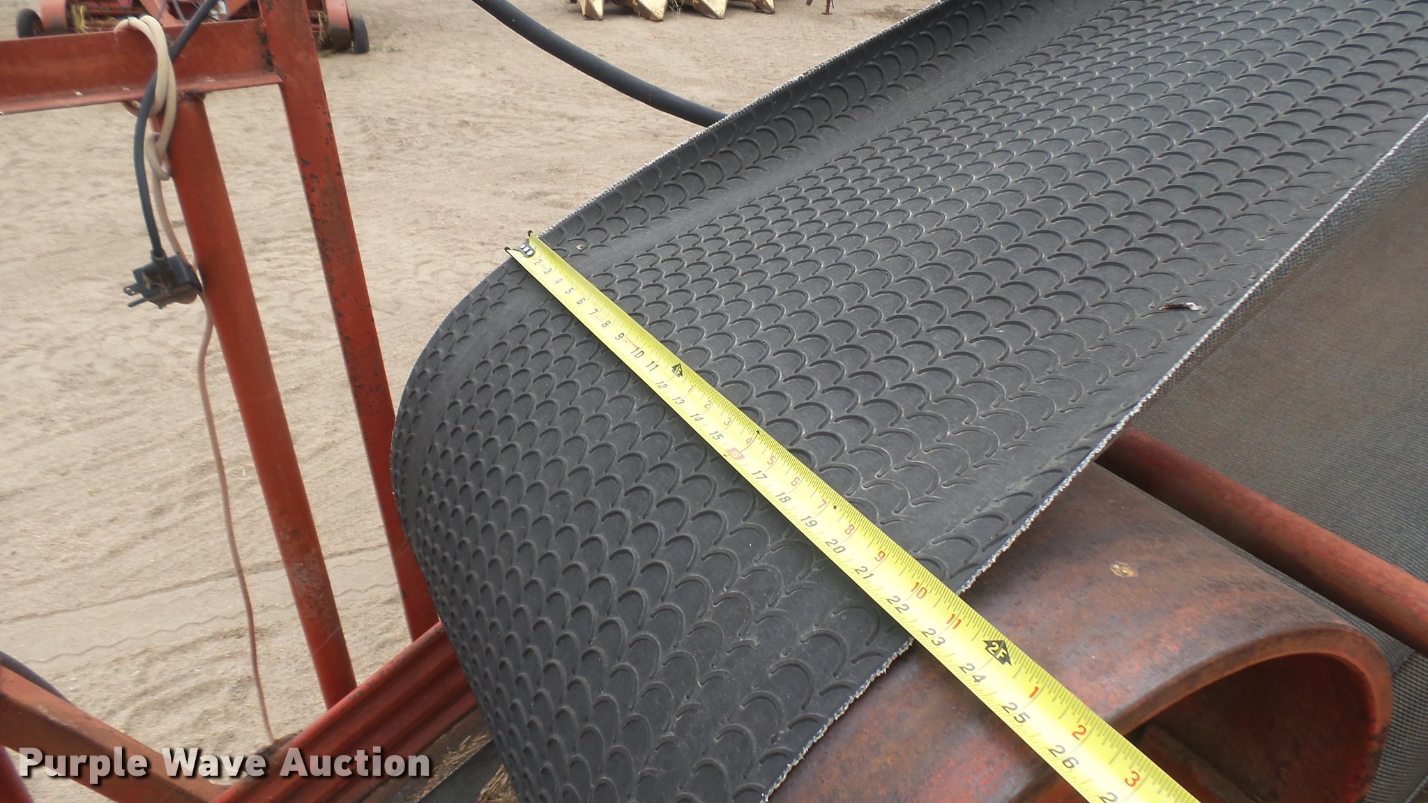 Purple Wave is selling a used Auger or Conveyor in Kansas. This item is a Grain conveyor with the following: Approx. 45'L x 8'W overall, 25'L, Approx. 13'H conveyor, 24"W belt, Electric motor, Three phase, Steel tank, Pump, Hose, Siemens switch, Pin hitch, 10.00-22 transport tires